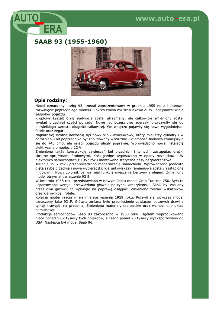 www.auto - era.pl SAAB 93 (1955-1960) Opis rodziny: Model oznaczony liczbą 93 został zaprezentowany w grudniu 1955 roku i stanowił rozwinięcie poprzedniego modelu. Zakres zmian był stosunkowo duży i obejmował wiele zespołów pojazdu. Kroplowy kształt bryły nadwozia został utrzymany, ale całkowicie zmieniony został wygląd przedniej części pojazdu. Nowe jednoczęściowe zderzaki przyczyniły się do niewielkiego wzrostu długości całkowitej. We wnętrzu pojawiły się nowe wygodniejsze fotele oraz zegar. Najbardziej istotną nowością był nowy silnik dwusuwowy, który miał trzy cylindry i w odróżnieniu od poprzednika był zabudowany wzdłużnie. Pojemność skokowa zmniejszyła się do 748 cm3, ale osiągi pojazdu uległy poprawie. Wprowadzono nową instalację elektryczną o napięciu 12 V. Zmieniono także konstrukcję zawieszeń kół przednich i tylnych, zastępując drążki skrętne sprężynami śrubowymi. Koła jezdne wyposażono w opony bezdętkowe. W niektórych samochodach z 1957 roku montowano statyczne pasy bezpieczeństwa. Jesienią 1957 roku przeprowadzono modernizację samochodu. Wprowadzono jednolitą giętą szybę przednią i nowe wycieraczki. Kierunkowskazy ramieniowe zostały zastąpione migowymi. Nowy zbiornik paliwa miał funkcję mieszania benzyny z olejem. Zmieniony model otrzymał oznaczenie 93 B. W kwietniu 1958 roku przedstawiono w Nowym Jorku model Gran Turismo 750. Była to usportowiona wersja, przewidziana głównie na rynek amerykański. Silnik był zasilany przez dwa gaźniki, co wpłynęło na poprawę osiągów. Zmieniono zestaw wskaźników oraz kierownicę i fotele. Kolejna modernizacja miała miejsce jesienią 1959 roku. Pojawił się wówczas model oznaczony jako 93 F. Główną zmianą było przeniesienie zawiasów bocznych drzwi z tylnej krawędzi na przednią. Zmieniono materiały tapicerskie oraz wzmocniono układ hamulcowy. Produkcję samochodów Saab 93 zakończono w 1960 roku. Ogółem wyprodukowano nieco ponad 52,7 tysięcy tych pojazdów, z czego ponad 20 tysięcy wyeksportowano do USA. Następcą był model Saab 96.