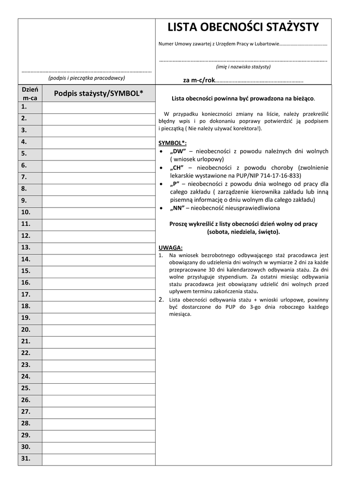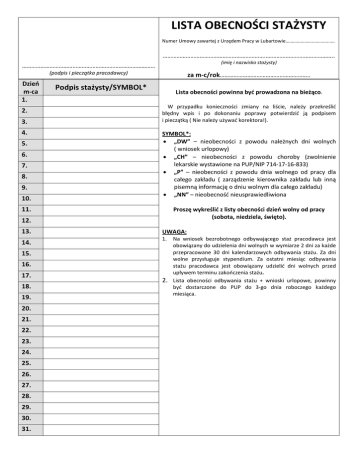 LISTA OBECNOŚCI STAŻYSTY Numer Umowy zawartej z Urzędem Pracy w Lubartowie……………………….…….…. …………………………………………………………..…………………………………….. (imię i nazwisko stażysty) …………………………………………………………………………… (podpis i pieczątka pracodawcy) Dzień m-ca 1. 2. 3. 4. 5. 6. 7. 8. 9. 10. za m-c/rok………………………………………………….. Podpis stażysty/SYMBOL* Lista obecności powinna być prowadzona na bieżąco. W przypadku konieczności zmiany na liście, należy przekreślić błędny wpis i po dokonaniu poprawy potwierdzić ją podpisem i pieczątką ( Nie należy używać korektora!). SYMBOL*: • „DW” – nieobecności z powodu należnych dni wolnych ( wniosek urlopowy) • „CH” – nieobecności z powodu choroby (zwolnienie lekarskie wystawione na PUP/NIP 714-17-16-833) • „P” – nieobecności z powodu dnia wolnego od pracy dla całego zakładu ( zarządzenie kierownika zakładu lub inną pisemną informację o dniu wolnym dla całego zakładu) • „NN” – nieobecność nieusprawiedliwiona 11. Proszę wykreślić z listy obecności dzień wolny od pracy (sobota, niedziela, święto). 12. 13. 14. UWAGA: 1. 15. 16. 17. 18. 19. 20. 21. 22. 23. 24. 25. 26. 27. 28. 29. 30. 31. 2. Na wniosek bezrobotnego odbywającego staż pracodawca jest obowiązany do udzielenia dni wolnych w wymiarze 2 dni za każde przepracowane 30 dni kalendarzowych odbywania stażu. Za dni wolne przysługuje stypendium. Za ostatni miesiąc odbywania stażu pracodawca jest obowiązany udzielić dni wolnych przed upływem terminu zakończenia stażu. Lista obecności odbywania stażu + wnioski urlopowe, powinny być dostarczone do PUP do 3-go dnia roboczego każdego miesiąca.