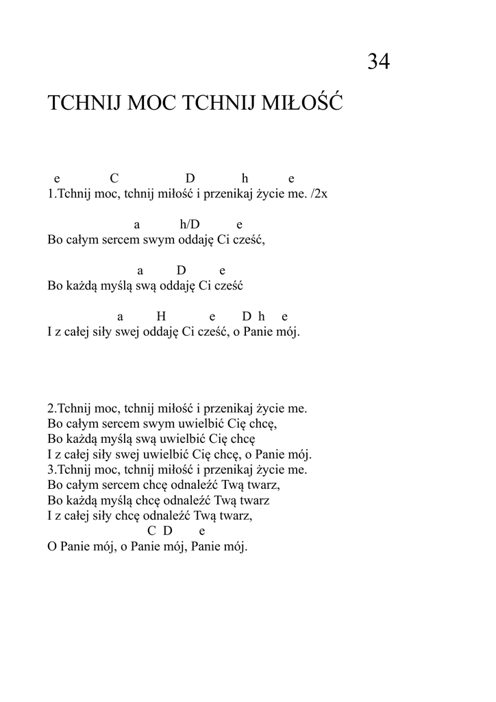34 TCHNIJ MOC TCHNIJ MIŁOŚĆ e C D h e 1.Tchnij moc, tchnij miłość i przenikaj życie me. /2x a h/D e Bo całym sercem swym oddaję Ci cześć, a D e Bo każdą myślą swą oddaję Ci cześć a H e D h e I z całej siły swej oddaję Ci cześć, o Panie mój. 2.Tchnij moc, tchnij miłość i przenikaj życie me. Bo całym sercem swym uwielbić Cię chcę, Bo każdą myślą swą uwielbić Cię chcę I z całej siły swej uwielbić Cię chcę, o Panie mój. 3.Tchnij moc, tchnij miłość i przenikaj życie me. Bo całym sercem chcę odnaleźć Twą twarz, Bo każdą myślą chcę odnaleźć Twą twarz I z całej siły chcę odnaleźć Twą twarz, C D e O Panie mój, o Panie mój, Panie mój.