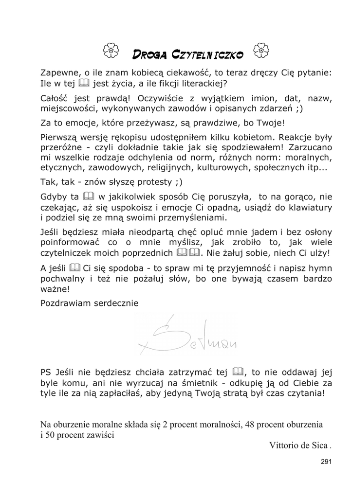 Droga Czytelniczko Zapewne, o ile znam kobiecą ciekawość, to teraz dręczy Cię pytanie: Ile w tej jest życia, a ile fikcji literackiej? Całość jest prawdą! Oczywiście z wyjątkiem imion, dat, nazw, miejscowości, wykonywanych zawodów i opisanych zdarzeń ;) Za to emocje, które przeżywasz, są prawdziwe, bo Twoje! Pierwszą wersję rękopisu udostępniłem kilku kobietom. Reakcje były przeróżne - czyli dokładnie takie jak się spodziewałem! Zarzucano mi wszelkie rodzaje odchylenia od norm, różnych norm: moralnych, etycznych, zawodowych, religijnych, kulturowych, społecznych itp... Tak, tak - znów słyszę protesty ;) Gdyby ta w jakikolwiek sposób Cię poruszyła, to na gorąco, nie czekając, aż się uspokoisz i emocje Ci opadną, usiądź do klawiatury i podziel się ze mną swoimi przemyśleniami. Jeśli będziesz miała nieodpartą chęć opluć mnie jadem i bez osłony poinformować co o mnie myślisz, jak zrobiło to, jak wiele czytelniczek moich poprzednich . Nie żałuj sobie, niech Ci ulży! A jeśli Ci się spodoba - to spraw mi tę przyjemność i napisz hymn pochwalny i też nie pożałuj słów, bo one bywają czasem bardzo ważne! Pozdrawiam serdecznie PS Jeśli nie będziesz chciała zatrzymać tej , to nie oddawaj jej byle komu, ani nie wyrzucaj na śmietnik - odkupię ją od Ciebie za tyle ile za nią zapłaciłaś, aby jedyną Twoją stratą był czas czytania! Na oburzenie moralne składa się 2 procent moralności, 48 procent oburzenia i 50 procent zawiści Vittorio de Sica . 291