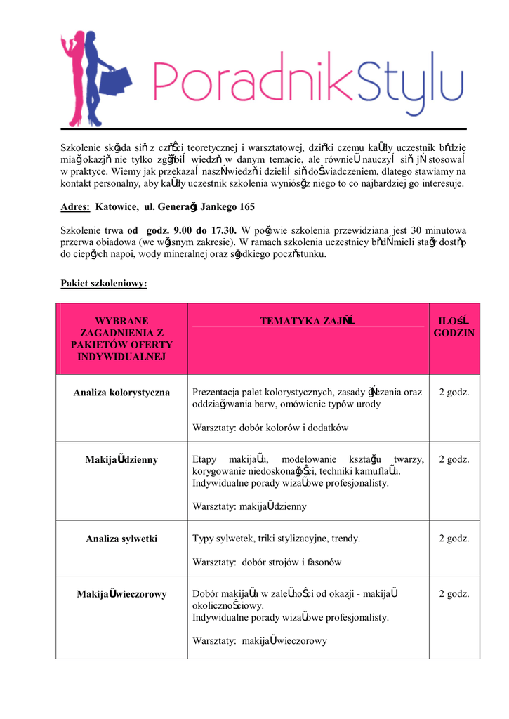 Szkolenie składa się z części teoretycznej i warsztatowej, dzięki czemu każdy uczestnik będzie miał okazję nie tylko zgłębić wiedzę w danym temacie, ale również nauczyć się ją stosować w praktyce. Wiemy jak przekazać naszą wiedzę i dzielić się doświadczeniem, dlatego stawiamy na kontakt personalny, aby każdy uczestnik szkolenia wyniósł z niego to co najbardziej go interesuje. Adres: Katowice, ul. Generała Jankego 165 Szkolenie trwa od godz. 9.00 do 17.30. W połowie szkolenia przewidziana jest 30 minutowa przerwa obiadowa (we własnym zakresie). W ramach szkolenia uczestnicy będą mieli stały dostęp do ciepłych napoi, wody mineralnej oraz słodkiego poczęstunku. Pakiet szkoleniowy: WYBRANE ZAGADNIENIA Z PAKIETÓW OFERTY INDYWIDUALNEJ TEMATYKA ZAJĘĆ ILOŚĆ GODZIN Analiza kolorystyczna Prezentacja palet kolorystycznych, zasady łączenia oraz oddziaływania barw, omówienie typów urody 2 godz. Warsztaty: dobór kolorów i dodatków Makijaż dzienny Etapy makijażu, modelowanie kształtu twarzy, korygowanie niedoskonałości, techniki kamuflażu. Indywidualne porady wizażowe profesjonalisty. 2 godz. Warsztaty: makijaż dzienny Analiza sylwetki Typy sylwetek, triki stylizacyjne, trendy. 2 godz. Warsztaty: dobór strojów i fasonów Makijaż wieczorowy Dobór makijażu w zależności od okazji - makijaż okolicznościowy. Indywidualne porady wizażowe profesjonalisty. Warsztaty: makijaż wieczorowy 2 godz.