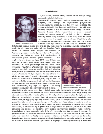 ,,Przesiedleńcy’’ - Był 1939 rok, miałam wtedy siedem lat-tak zaczęła swoją opowieść moja Babcia Halina miejscowość Mienia, nasza rodzina zamieszkiwała tam w budynku, do którego na wypoczynek przyjeżdżała niepełnosprawna młodzież. Mój tata był jego zarządcą. Na przełomie jesieni i zimy budynek zajęli Niemcy. Na jakiś czas kwaterę urządzili u nas oficerowie wyżsi rangą i SS-mani. Pomimo bardzo złych wspomnień z czasu okupacji niemieckiej, muszę przyznać, że byli to dobrzy Niemcy. Niestety dobre czasy skończyły w 1941 roku, kiedy to nastał nowy zarządca i wyrzucili nas z domu. Musieliśmy się przeprowadzić do pobliskich Mrozów, gdzie mój tata powoli Babcia Halina Kasperowicz budował dom. Były to bardzo trudne czasy. W 1941 roku zima była bardzo sroga, a śniegu było tyle, że aby wyjść z domu chociażby po wodę, to kopaliśmy w nim tunele, które były wyższe niż my, dzieciaki. Tacie udało się znaleźć nowe zajęcie, ale niestety w Warszawie, przez co rzadko bywał w domu. Pracował w szpitalu na Żoliborzu, gdzie był mechanikiem i wykonywał prace zlecone przez Niemców. I tak wędrówka taty trwała do lipca 1944 roku. Ostatni raz tata był w domu pod koniec lipca tegoż roku. Jak wiadomo w dniu pierwszego sierpnia 1944 roku wybuchło Powstanie Warszawskie. Dni powstańczej zawieruchy mijały, a my nie mieliśmy żadnych wieści o naszym tacie, jak również o tym, co tak naprawdę dzieje się w Warszawie. W tym ciężkim dla nas okresie nie obyło się bez ,,wizyt’’ wojsk radzieckich, które szły w kierunku Warszawy i zatrzymywały się u nas na odpoczynek. Nie chcę wspominać tych chwil. Najgorsza w tym okresie była niewiedza na temat mojego taty. Prababcia Jadwiga z wujkami Nie wiedzieliśmy, czy żyje, czy zginął. I w takiej Kazimierzem i Marianem Jadczakami niepewności żyliśmy do połowy stycznia 1945 roku. -Siedzieliśmy wieczorem przy słabo oświetlonym stole- kontynuuje opowieść Babcia- gdy nagle usłyszeliśmy ostre pukanie do drzwi. Przerażenie ogarnęło nie tylko moją mamę, ale również nas dzieci. Na pytanie: ,,Kto tam ?’’- usłyszeliśmy znajomy głos. To był nasz tata. Płaczom i radości nie było końca. Kiedy już ochłonął z powstańczych przeżyć, opowiadał nam wieczorami jak wyglądały jego losy w Warszawie, gdzie zastało go powstanie . Był zabrany przez Niemców do obozu przejściowego w Pruszkowie. Z tego obozu wywożono ludzi na roboty do Niemiec. Na szczęście tacie udało się uciec. Opowiadał o swojej tułaczce po Warszawie, o ukrywaniu się w piwnicach, o organizowaniu żywności, o ruinach, w jakie zamieniła się stolica i o marzeniu, aby jeszcze kiedykolwiek zobaczyć swoją rodzinę. Opowiadanie o tym sprawiało tacie duży ból, przeżycia były tak ogromne i bolesne, że postanowiliśmy już nigdy do Warszawy nie wracać. I tak też się stało. Jeszcze w tym samym roku tata pojechał w Polskę szukać pracy i mieszkania. Trafił na wybrzeże do Gdańska. Zapadła więc decyzja o przeprowadzce, trzeba było zebrać nasz niewielki majątek i wyruszyć w podróż w nieznane. Mama zapakowała w największą walizkę dokumenty i wszystkie wartościowe przedmioty, jakie mieliśmy. Nasza podróż rozpoczęła się w październiku 1945 roku. Odbywaliśmy ją w wagonie towarowym. Razem z nami jechała jeszcze jedna rodzina. Zresztą cały skład pociągu to byli przesiedleńcy, którzy wyruszali do różnych miast na północy i zachodzie Polski. Podróż trwała bardzo długo, ponieważ na różnych stacjach, bocznicach odczepiano nasz wagon i trzeba było czekać na inną lokomotywę. Na miejsce dotarliśmy po tygodniu, całe szczęście, że mama zadbała o to, abyśmy mieli prowiant. Jak staliśmy na bocznicach, to przychodzili ludzie i przynosili nam lub Pradziadkowie Jadwiga i Jan Traczykowie w dniu ślubu sprzedawali jakieś jedzenie. Jak już wspomniałam na miejsce dotarliśmy po tygodniu. I wszystko skończyłoby się szczęśliwie, gdyby nie fakt, że podczas wysiadania z wagonu, zostaliśmy obrabowani z najcenniejszych rzeczy. Tata znalazł pracę w powstającej Stoczni Gdańskiej. I tak po wielu przejściach stałam się mieszkanką Gdańska, gdzie mieszkam do dnia dzisiejszego- kończy swoją opowieść Babcia Halina. Opowieści mojej Babci są niesamowite. Do tej pory nie zdawałem sobie sprawy, co przeżyła. Dobrze, że chce podzielić się swoimi wspomnieniami. Pokazała mi też zdjęcia swoich rodziców sprzed wojny. I swoje-młodej, uśmiechniętej dziewczyny, która rozpoczęła nowy etap życia na Wybrzeżu, w Gdańsku. Lubię ją tam odwiedzać, a ponieważ mieszkam na Podkarpaciu każda wizyta nad morzem jest dla mnie niezwykle atrakcyjna. Maks Kasperowicz Uczeń klasy 1e Gimnazjum im. ks. J.Popiełuszki w Przecławiu Dane kontaktowe Maksymilian Kasperowicz ul. 3 Maja 25 39-320 Przecław Podkarpacie