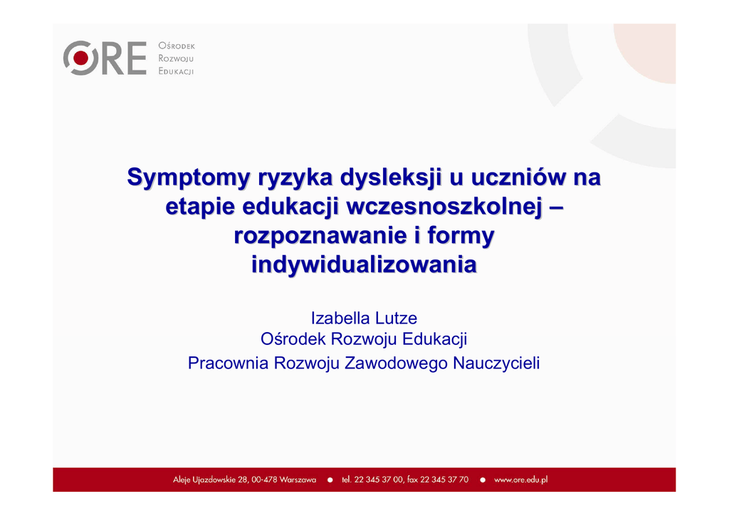 Symptomy ryzyka dysleksji u uczniów na etapie edukacji wczesnoszkolnej – rozpoznawanie i formy indywidualizowania Izabella Lutze Ośrodek Rozwoju Edukacji Pracownia Rozwoju Zawodowego Nauczycieli Plan prezentacji I. Specyficzne trudności w uczeniu się – terminologia, symptomy ryzyka dysleksji. II. Udzielanie wsparcia – etapy, formy i sposoby. III. Sposoby indywidualizowania i oceniania. I. Specyficzne trudności w uczeniu się – terminologia Dysleksja rozwojowa – zespół specyficznych trudności w uczeniu się czytania i pisania występujący u dzieci o prawidłowej inteligencji. Występuje w trzech formach: - Dysleksja – specyficzne trudności w czytaniu - Dysortografia – specyficzne trudności z opanowaniem poprawnej pisowni (w tym błędy ortograficzne), - Dysgrafia – trudności w opanowaniu pożądanego, tzn. czytelnego poziomu graficznego pisma. Modelowy system profilaktyki i pomocy psychologiczno-pedagogicznej uczniom z dysleksją M. Bogdanowicz, A. Bućko, R. Czabaj. Wydawnictwo OPERON, Gdynia 2008. I. Specyficzne trudności w uczeniu się - ryzyko występowania • Obciążenie genetyczne. • Nieprawidłowy przebieg ciąży i porodu. • Dysharmonijny rozwój psychomotoryczny. I. Specyficzne trudności w uczeniu się. Czego mogą dotyczyć zaburzenia? • • • • • • • analizy i syntezy wzrokowej, analizy i syntezy słuchowej, motoryki, współdziałania, czyli integracji ww. procesów, pamięci wzrokowej, słuchowej, ruchowej, lateralizacji (przewagi stronnej ciała), orientacji w schemacie ciała. I. Specyficzne trudności w uczeniu się. Symptomy specyficznych trudności w uczeniu się okres przedszkolny i wczesnoszkolny • opóźniony rozwój mowy, • mała sprawność i koordynacja ruchów podczas zabaw ruchowych, samoobsługi, rysowania i prób pisania, • wadliwa wymowa, trudności z wypowiadaniem złożonych słów, błędy gramatyczne, • trudności z różnicowaniem głosek podobnych oraz z wydzieleniem sylab, głosek ze słów i ich syntezą. M. Bogdanowicz, „Rozpoznawanie ryzyka dysleksji”. Materiały ORE I. Specyficzne trudności w uczeniu się. Symptomy specyficznych trudności w uczeniu się okres przedszkolny i wczesnoszkolny c.d. • trudności z wykonywaniem układanek i odtwarzaniem wzorów graficznych, • oburęczność; mylenie prawej i lewej ręki, • trudności w czytaniu pomimo dobrej inteligencji oraz braku zaniedbania środowiskowego i dydaktycznego, • trudności z opanowaniem poprawnej pisowni: pismo zwierciadlane, mylenie liter podobnych pod względem kształtu (p-b-d-g), liter odpowiadających głoskom zbliżonym fonetycznie, opuszczanie liter, błędy ortograficzne pomimo znajomości zasad ortografii. M. Bogdanowicz, „Rozpoznawanie ryzyka dysleksji”. Materiały ORE I. Specyficzne trudności w uczeniu się. Trudności związane z zaburzeniami analizatora wzrokowego. • • • • • • • • • • mylenie liter o podobnych optycznie kształtach (np. a - o, m - n, l - t, e - c, h - k, C - G), mylenie liter różniących się położeniem w stosunku do osi poziomej i pionowej (np. n - u, p - g, b - d, w - m), mieszanie struktur graficznych, gdy różnice miedzy nimi są małe (np. dom dam), przestawianie liter, sylab, wyrazów, opuszczanie drobnych znaków graficznych i interpunkcyjnych, zapominanie niektórych dużych liter (szczególnie L, Ł, W, F), niewłaściwe rozplanowanie graficzne wyrazów w stosunku do stronicy zeszytu, nieodpowiedni wybór linijek, mylenie kierunku zapisu (pismo zwierciadlane, pisanie od strony prawej ku lewej, błędy ortograficzne (gorsza pamięć wzrokowa wpływa na trudności w zapamiętywaniu obrazu graficznego), wolne tempo czytania spowodowane zbyt długim koncentrowaniem się na rozpoznawaniu kształtów liter lub wyrazów podobnych. T. Opolska, „Rozpoznawanie ryzyka dysleksji”. Materiały ORE I. Specyficzne trudności w uczeniu się. Trudności związane z zaburzeniami analizatora słuchowego. • • • • • • • • mylenie głosek oraz struktur dźwiękowych zbliżonych fonetycznie (b - p, d - t, k - g, s - z, w - f), przestawianie, opuszczanie, dodawanie liter i sylab, nieprawidłowe pisanie wyrazów z i - j, ze zmiękczeniami (ś - si, ć - ci, ń - ni), dwuznakami, głoskami dźwięcznymi i bezdźwięcznymi, szumiącymi (sz, cz, ż, dż) i syczącymi (s, c, z, dz), nieprawidłowe pisanie wyrazów z samogłoskami nosowymi „ę”, „ą”, i zespołami dźwiękowymi „on”, „om”, „en”, „em”, łączenie w jedną całość przyimków z rzeczownikami, opuszczanie wyrazów, sylab i liter w środku wyrazu, opuszczanie końcówek, szczególnie w wyrazach typu: szedł, biegł, usiadł), zamiana głosek dźwięcznych na bezdźwięczne (np. b - p, w - f). T. Opolska, „Rozpoznawanie ryzyka dysleksji”. Materiały ORE I. Specyficzne trudności w uczeniu się. Trudności związane z zaburzeniami analizatora kinestetyczno-ruchowego. Przejawy obniżenia sprawności manualnej w pisaniu to (Sobolewska 1989): • zbyt wolne tempo wykonywanych czynności, • mała precyzja ruchów dłoni i palców, • słaby poziom graficzny pisma, • współruchy. Analiza pisma wykazać może następujące charakterystyczne objawy: • kształty liter, uproszczone, mogą przypominać druk, scalanie liter w „zbitkę, litery nie dokończone w kształcie, • zmiana wielkości i nachylenie liter, • litery krzywe i niekształtne, • brak wiązania liter, • litery drżące, o niepewnej linii, • za duże lub za małe odstępy liter w wyrazach lub między wyrazami, • opuszczanie linijek, przekraczanie lub nie dociąganie do nich. T. Opolska, „Rozpoznawanie ryzyka dysleksji”. Materiały ORE I. Specyficzne trudności w uczeniu się. Dynamika zmian objawów dysleksji. • Zmienność symptomów dysleksji na różnych etapach życia (różne metody edukacji, udział w dodatkowych zajęciach, udzielane wsparcie, indywidualne możliwości, głębokość dys