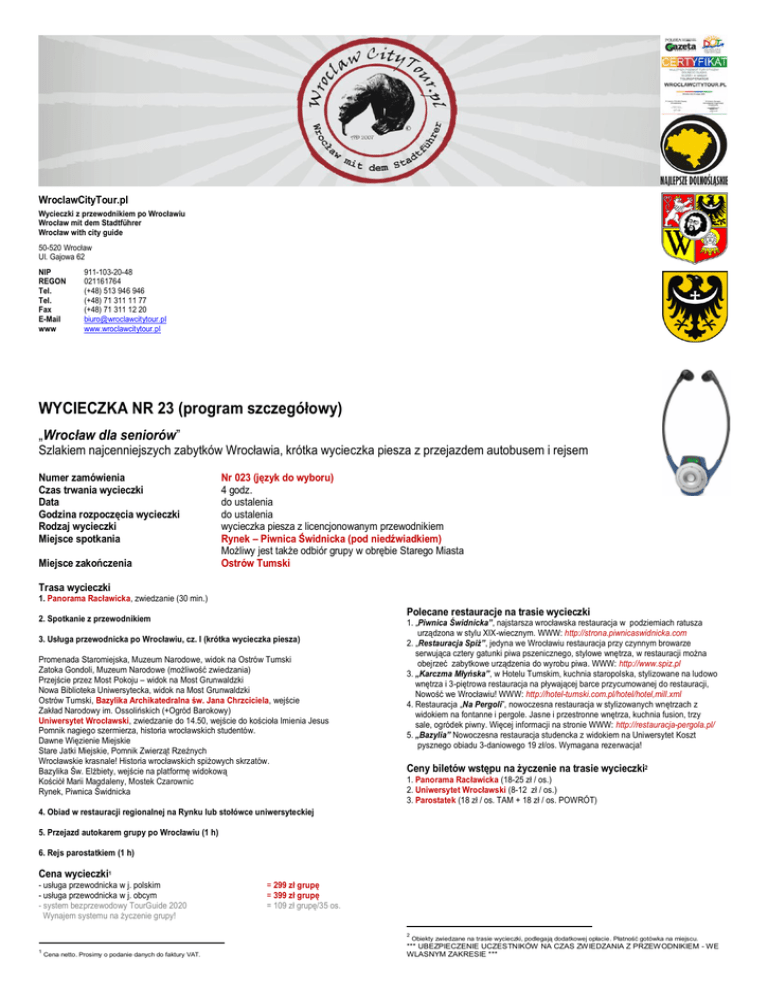 WroclawCityTour.pl Wycieczki z przewodnikiem po Wrocławiu Wrocław mit dem Stadtführer Wrocław with city guide 50-520 Wrocław Ul. Gajowa 62 NIP REGON Tel. Tel. Fax E-Mail www 911-103-20-48 021161764 (+48) 513 946 946 (+48) 71 311 11 77 (+48) 71 311 12 20 [email protected] www.wroclawcitytour.pl WYCIECZKA NR 23 (program szczegółowy) „Wrocław dla seniorów” Szlakiem najcenniejszych zabytków Wrocławia, krótka wycieczka piesza z przejazdem autobusem i rejsem Numer zamówienia Czas trwania wycieczki Data Godzina rozpoczęcia wycieczki Rodzaj wycieczki Miejsce spotkania Miejsce zakończenia Nr 023 (język do wyboru) 4 godz. do ustalenia do ustalenia wycieczka piesza z licencjonowanym przewodnikiem Rynek – Piwnica Świdnicka (pod niedźwiadkiem) Możliwy jest także odbiór grupy w obrębie Starego Miasta Ostrów Tumski Trasa wycieczki 1. Panorama Racławicka, zwiedzanie (30 min.) Polecane restauracje na trasie wycieczki 2. Spotkanie z przewodnikiem 3. Usługa przewodnicka po Wrocławiu, cz. I (krótka wycieczka piesza) Promenada Staromiejska, Muzeum Narodowe, widok na Ostrów Tumski Zatoka Gondoli, Muzeum Narodowe (możliwość zwiedzania) Przejście przez Most Pokoju – widok na Most Grunwaldzki Nowa Biblioteka Uniwersytecka, widok na Most Grunwaldzki Ostrów Tumski, Bazylika Archikatedralna św. Jana Chrzciciela, wejście Zakład Narodowy im. Ossolińskich (+Ogród Barokowy) Uniwersytet Wrocławski, zwiedzanie do 14.50, wejście do kościoła Imienia Jesus Pomnik nagiego szermierza, historia wrocławskich studentów. Dawne Więzienie Miejskie Stare Jatki Miejskie, Pomnik Zwierząt Rzeźnych Wrocławskie krasnale! Historia wrocławskich spiżowych skrzatów. Bazylika Św. Elżbiety, wejście na platformę widokową Kościół Marii Magdaleny, Mostek Czarownic Rynek, Piwnica Świdnicka 1. „Piwnica Świdnicka”, najstarsza wrocławska restauracja w podziemiach ratusza urządzona w stylu XIX-wiecznym. WWW: http://strona.piwnicaswidnicka.com 2. „Restauracja Spiż”, jedyna we Wrocławiu restauracja przy czynnym browarze serwująca cztery gatunki piwa pszenicznego, stylowe wnętrza, w restauracji można obejrzeć zabytkowe urządzenia do wyrobu piwa. WWW: http://www.spiz.pl 3. „Karczma Młyńska”, w Hotelu Tumskim, kuchnia staropolska, stylizowane na ludowo wnętrza i 3-piętrowa restauracja na pływającej barce przycumowanej do restauracji, Nowość we Wrocławiu! WWW: http://hotel-tumski.com.pl/hotel/hotel,mill.xml 4. Restauracja „Na Pergoli”, nowoczesna restauracja w stylizowanych wnętrzach z widokiem na fontanne i pergole. Jasne i przestronne wnętrza, kuchnia fusion, trzy sale, ogródek piwny. Więcej informacji na stronie WWW: http://restauracja-pergola.pl/ 5. „Bazylia” Nowoczesna restauracja studencka z widokiem na Uniwersytet Koszt pysznego obiadu 3-daniowego 19 zł/os. Wymagana rezerwacja! Ceny biletów wstępu na życzenie na trasie wycieczki2 1. Panorama Racławicka (18-25 zł / os.) 2. Uniwersytet Wrocławski (8-12 zł / os.) 3. Parostatek (18 zł / os. TAM + 18 zł / os. POWRÓT) 4. Obiad w restauracji regionalnej na Rynku lub stołówce uniwersyteckiej 5. Przejazd autokarem grupy po Wrocławiu (1 h) 6. Rejs parostatkiem (1 h) Cena wycieczki1 - usługa przewodnicka w j. polskim - usługa przewodnicka w j. obcym - system bezprzewodowy TourGuide 2020 Wynajem systemu na życzenie grupy! = 299 zł grupę = 399 zł grupę = 109 zł grupę/35 os. 2 1 Cena netto. Prosimy o podanie danych do faktury VAT. Obiekty zwiedzane na trasie wycieczki, podlegają dodatkowej opłacie. Płatność gotówka na miejscu. *** UBEZPIECZENIE UCZESTNIKÓW NA CZAS ZWIEDZANIA Z PRZEWODNIKIEM - WE WLASNYM ZAKRESIE *** Zdjęcia z wycieczki pieszej WroclawCityTour.pl Zwiedzanie miasta z systemem nagłaśnajacym TourGuide 2020-D (do 35 os.) © WroclawCityTour.pl © Zdjęcia z wycieczki autobusowej \ WroclawCityTour.pl ©