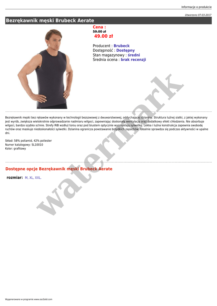Informacje o produkcie Utworzono 07-03-2017 Bezrękawnik męski Brubeck Aerate Cena : 59.00 zł 49.00 zł er m ar k Producent : Brubeck Dostępność : Dostępny Stan magazynowy : średni Średnia ocena : brak recenzji Bezrękawnik męski bez rękawów wykonany w technologii bezszwowej z dwuwarstwowej, oddychającej dzianiny. Struktura luźnej siatki, z jakiej wykonany jest wyrób, zwiększa wielokrotnie odprowadzanie nadmiaru wilgoci, zapewniając doskonałą wentylację oraz dodatkowy efekt chłodzenia. Nie absorbuje wilgoci, bardzo szybko schnie. Strefy RIB wzdłuż torsu oraz pod biustem optycznie wysmuklają sylwetkę. Lekka i luźna konstrukcja zapewnia swobodę ruchów oraz maskuje niedoskonałości sylwetki. Dzianina ogranicza powstawanie brzydkich zapachów. Idealnie sprawdza się podczas aktywności w upalne dni. Skład: 58% poliamid, 42% poliester Numer katalogowy: SL10010 Kolor: grafitowy Dostępne opcje Bezrękawnik męski Brubeck Aerate w at rozmiar: M, XL, XXL. Wygenerowano w programie www.oscGold.com