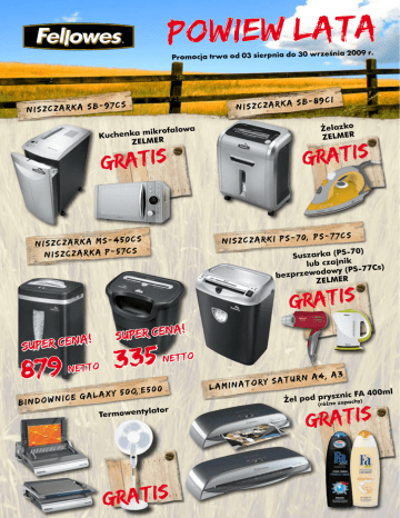 ia 2009 r. Promocja trwa od 03 sierpnia do 30 wrześn Niszczark B-97Cs Niszczarka S a SB-89Ci Żelazko Zelmer ikrofalowa Kuchenka m ZELMER 0, PS-77Cs Niszczarki PS-7 S -70) Suszarka (P lub czajnik s) owy (PS -77C bezprzewod ZELMER 450Cs Niszczarka MSCs Niszczarka P-57 NA! SUPER CE NA! SUPER CE 879 Bi netto 335 netto 0 ,e50 axy 50o l a G e c ndowni tor la Termowenty L rn ry Satu o t a n i m a A4, A3 00ml rysznic FA 4 Żel pod p y) ch (różne zapa Podnozek elefon Ramieę pod t y Ergonomiczn ła mysz okrąg d o p a k d ła Podk ) óżne wzory (r pudelł 10 sztuk old a- FastF w i h c r a na a długopisy Pojemnik n m Memory Foa a w o l e z ż a k Podklad asączone Ściereczki n mm na akta 80 4 szt. pudeł orow enia monit z c z s y z c o zestaw d Twój Dystrybutor o Ściereczki d obudów czyszczenia uniwersalne ntystat Pianka a yczna yotrolem Pianka z Brą k 50 ml do ochrony Organizatorem promocji jest Fellowes Polska SA. Promocja jest skierowana do podmiotów gospodarczych. Promocja trwa od 03 sierpnia do 30 września 2009 r. lub do wyczerpania zapasu produktu głównego lub/i produktu dodawanego jako prezent. Produkty biorące udział w promocji mogą się nieznacznie różnić od tych pokazanych na zdjęciach. Niniejsza ulotka promocyjna nie jest ofertą handlową i nie może być uznana za ofertę w rozumieniu art. 66 ust. 1 Kodeksu Cywilnego. Ulotka stanowi zaproszenie do rokowań handlowych w rozumieniu art. 71 Kodeksu Cywilnego. Organizator zastrzega sobie prawo do zmiany oferty bez podania przyczyny. Wszystkie użyte znaki towarowe są własnością ich prawowitych właścicieli. www.fellowes.pl