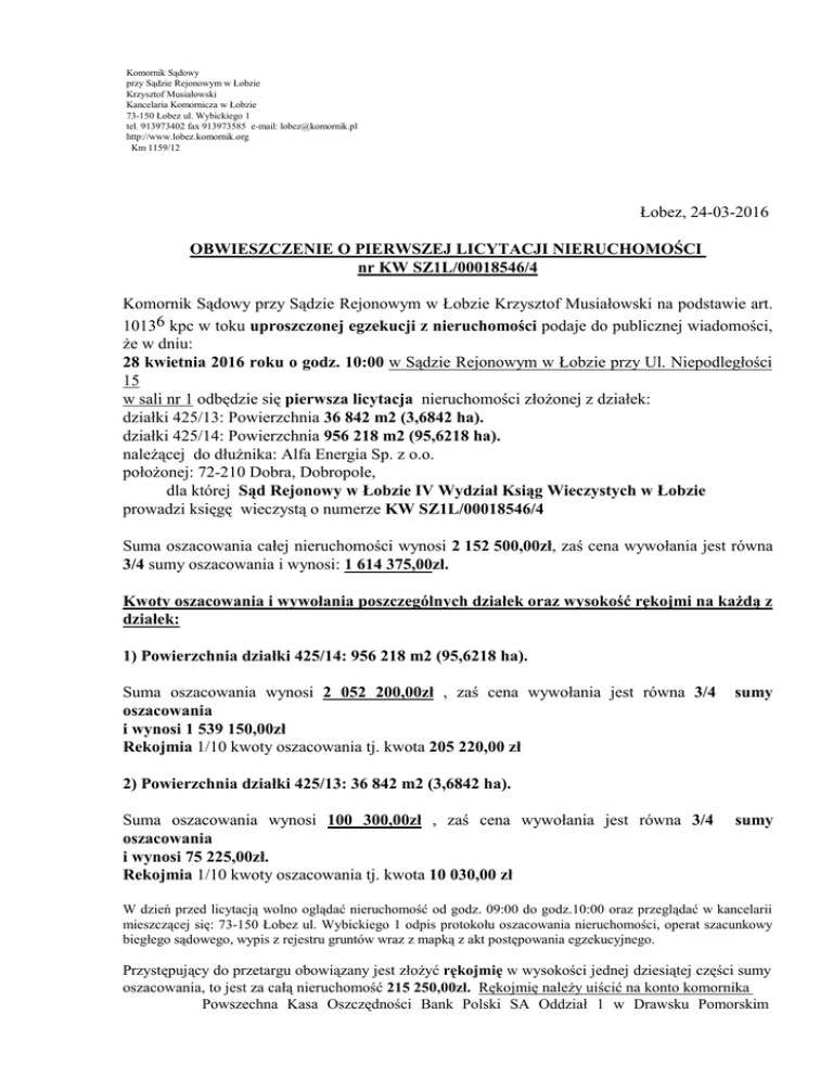 Komornik Sądowy przy Sądzie Rejonowym w Łobzie Krzysztof Musiałowski Kancelaria Komornicza w Łobzie 73-150 Łobez ul. Wybickiego 1 tel. 913973402 fax 913973585 e-mail: [email protected] http://www.lobez.komornik.org Km 1159/12 Łobez, 24-03-2016 OBWIESZCZENIE O PIERWSZEJ LICYTACJI NIERUCHOMOŚCI nr KW SZ1L/00018546/4 Komornik Sądowy przy Sądzie Rejonowym w Łobzie Krzysztof Musiałowski na podstawie art. 10136 kpc w toku uproszczonej egzekucji z nieruchomości podaje do publicznej wiadomości, że w dniu: 28 kwietnia 2016 roku o godz. 10:00 w Sądzie Rejonowym w Łobzie przy Ul. Niepodległości 15 w sali nr 1 odbędzie się pierwsza licytacja nieruchomości złożonej z działek: działki 425/13: Powierzchnia 36 842 m2 (3,6842 ha). działki 425/14: Powierzchnia 956 218 m2 (95,6218 ha). należącej do dłużnika: Alfa Energia Sp. z o.o. położonej: 72-210 Dobra, Dobropole, dla której Sąd Rejonowy w Łobzie IV Wydział Ksiąg Wieczystych w Łobzie prowadzi księgę wieczystą o numerze KW SZ1L/00018546/4 Suma oszacowania całej nieruchomości wynosi 2 152 500,00zł, zaś cena wywołania jest równa 3/4 sumy oszacowania i wynosi: 1 614 375,00zł. Kwoty oszacowania i wywołania poszczególnych działek oraz wysokość rękojmi na każdą z działek: 1) Powierzchnia działki 425/14: 956 218 m2 (95,6218 ha). Suma oszacowania wynosi 2 052 200,00zł , zaś cena wywołania jest równa 3/4 oszacowania i wynosi 1 539 150,00zł Rekojmia 1/10 kwoty oszacowania tj. kwota 205 220,00 zł sumy 2) Powierzchnia działki 425/13: 36 842 m2 (3,6842 ha). Suma oszacowania wynosi 100 300,00zł , zaś cena wywołania jest równa 3/4 oszacowania i wynosi 75 225,00zł. Rekojmia 1/10 kwoty oszacowania tj. kwota 10 030,00 zł sumy W dzień przed licytacją wolno oglądać nieruchomość od godz. 09:00 do godz.10:00 oraz przeglądać w kancelarii mieszczącej się: 73-150 Łobez ul. Wybickiego 1 odpis protokołu oszacowania nieruchomości, operat szacunkowy biegłego sądowego, wypis z rejestru gruntów wraz z mapką z akt postępowania egzekucyjnego. Przystępujący do przetargu obowiązany jest złożyć rękojmię w wysokości jednej dziesiątej części sumy oszacowania, to jest za całą nieruchomość 215 250,00zł. Rękojmię należy uiścić na konto komornika Powszechna Kasa Oszczędności Bank Polski SA Oddział 1 w Drawsku Pomorskim 84102028470000110200662759 (Przy wpłacie należy podać także sygnaturę Km 1159/12) Rękojmię złożoną przez licytanta, któremu udzielono przybicia, zatrzymuje się; pozostałym licytantom rękojmię zwraca się niezwłocznie. Jeżeli nabywca nie wykonał w terminie warunków licytacji co do zapłaty ceny, traci rękojmię, a skutki przybicia wygasają. Z utraconej rękojmi pokrywa się koszty egzekucji związanej ze sprzedażą, a reszta wchodzi w skład sumy uzyskanej w egzekucji albo jeżeli egzekucja została umorzona jest przelewana na dochód Skarbu Państwa (art. 8671 kpc). Licytacja odbywa się publicznie. W przetargu nie mogą uczestniczyć: dłużnik, komornik, ich małżonkowie, dzieci, rodzice i rodzeństwo, osoby obecne na licytacji w charakterze urzędowym oraz licytant, który nie wykonał warunków poprzedniej licytacji. Stawienie się jednego licytanta wystarcza do odbycia przetargu. Pełnomocnictwo do udziału w przetargu powinno być stwierdzone dokumentem z podpisem urzędowo poświadczonym, chyba że chodzi o pełnomocnictwo udzielone adwokatowi lub radcy prawnemu (art. 8672 kpc). Asesor Komorniczy Asesor Komorniczy Asesor Komorniczy Komornik Sądowy Małgorzata Kotowska Adamczewska Roch Skrzymowski Michał Melinger Krzysztof Musiałowski