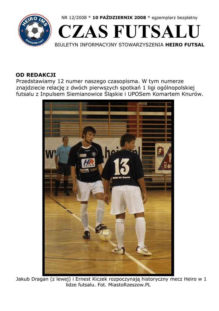 NR 12/2008 * 10 PAŹDZIERNIK 2008 * egzemplarz bezpłatny CZAS FUTSALU BIULETYN INFORMACYJNY STOWARZYSZENIA HEIRO FUTSAL OD REDAKCJI Przedstawiamy 12 numer naszego czasopisma. W tym numerze znajdziecie relację z dwóch pierwszych spotkań 1 ligi ogólnopolskiej futsalu z Inpulsem Siemianowice Śląskie i UPOSem Komartem Knurów. Jakub Dragan (z lewej) i Ernest Kiczek rozpoczynają historyczny mecz Heiro w 1 lidze futsalu. Fot. MiastoRzeszow.PL -2- 1 liga: PORAŻKA NA INAUGURACJĘ Bramkarze nie mieli dnia 27 września 2008 r. Godzina 19. Ta data przejdzie do historii nie tylko Heiro ale całego futsalowego Rzeszowa. Oto bowiem nasz zespół zadebiutował w rozgrywkach 1 ligi (wprawdzie na podobnym poziomie rozgrywkowych grała Elektrociepłownia Rzeszów, ale rozgrywki nosiły nazwę 2 ligi). Meczowe emocje skończyły się niestety już po pierwszej połowie. Kilka fatalnych interwencji bramkarskich głównie Dariusza Brzyskiego spowodowały iz na tablicy widniał wynik 3-8. Po przerwie gra była dużo bardziej wyrównana i spotkanie zakończyło się wynikiem 5-12. Warto nadmienić iż Inpuls to spadkowicz z Ekstraklasy w skłądzie którego grał aktualny reprezentant Polski, Marcin Krzywka. HEIRO IMS – INPULS-ALPOL Siemianowice Śl. 5-12 (3-8) bramki dla Heiro: Kiczek 2, Łodej 2, Krawczyk P. Heiro IMS: Stącel, Brzyski – Krawczyk P., Krawczyk Ł., Kiczek, Dragan, Łodej, Kawa, Dawidziak, Klader, Paszkowski. 1 liga: ZADECYDOWAŁA II POŁOWA Z Knurowa bez punktów Nie tak miała wyglądać wyprawa naszej drużyny do Knurowa. Po dobrze zagranych 20 minutach 1 połowy, kiedy na tablicy widniał wynik 2-1 po przerwie nasi zawodnicy zagrali katastrofalnie. Chyba za szybko uwierzyliśmy iż to spotkanie możemy wygrać – komentuje wynik spotkania prezes Łukasz Krawczyk – W drugiej odsłonie meczu nie przypominaliśmy zespołu z pierwszej odsłony. Po prostu płacimy za brak doświadczenia. W bramce Heiro zadebiutował Jakub Rybus, który w zgodnej opini obserwatorów spotkania był najlepszym zawodnikiem w szeregach rzeszowskiego zespołu. UPOS Komart Knurów - HEIRO IMS 11-4 (2-1) bramki dla Heiro: Krawczyk P. 3, Dawidziak. Heiro IMS: Rybus – Krawczyk P., Krawczyk Ł., Kiczek, Dragan, Kawa, Dawidziak, Klader, Amarowicz, Młocek, Szczepański. Aktualna tabela na str. 4 Terminarz gier Heiro IMS w 1 rundzie sezonu 2008/09 I kolejka 27.09.2008 Heiro IMS - Inpuls Alpol 5-12 II kolejka 4.10.2008 UPOS Komart Knurów - Heiro IMS 11-4 III kolejka 11.10.2008 Heiro IMS - Rekord Bielsko Biała IV kolejka 18/19.10.2008 Marioss Wawelno - Heiro IMS V kolejka 25.10.2008 Heiro IMS - pauza VI kolejka 8/9.11.2008 Marex Chorzów - Heiro IMS Rzeszów VII kolejka 15/16.11.2008 AZS UŚ Katowice - Heiro IMS VIII kolejka 22.11.2008 Heiro IMS – Radan Gliwice IX kolejka 29/30.11.2008 Rodakowski Tychy - Heiro IMS X kolejka 06.11.2008 Heiro – Remedium Pyskowice XI kolejka 13.11.2008 Heiro IMS - Renex Grajów Apel: Zostań sponsorem ! Wspomóż młodych piłkarzy Działacze Heiro Futsal zapraszają firmy i osoby prywatne do wsparcie naszej drużyny w I lidze. Poszukujemy osoby mogące zapewnić drużynie: wyżywienie podczas meczy wyjazdowych, wodę mineralną i napoje gazowane itp. Chętnie nawiążemy współpracę barterową. Kontakt z Prezesem: Krawczyk Łukasz (tel. 600 418 812) Info: ZACZNIJ PRZYGODĘ Z FUTSALEM Rozpoczęlismy zapisy do drużyn młodzieżowych Chcesz uczycz się techniki, taktyki i pracowac nad szybkością ? Poczuć fantastycznie wysokie tempo gry w futsalu. Zagrać w 1 lidze ogólnopolskiej, w Młodzieżowych Mistrzostwach Polski a może nawet w Reprezentacji Polski ??? Zapisz się do grupy juniorów Heiro: Grupa starsza: 1988-1992 (zajęcia bezpłatne) Grupa młodsza: 1993-1995 (składka 10 zł/miesięcznie) Zapisy przyjmuje Mateusz Amarowicz tel. 512-966-250 -3- AMATORSKA LIGA PIŁKARSKA – Rzeszów Ruszyły amatorskie rozgrywki w Rzeszowie. Heiro gra w Ekstraklasie (najwyższy poziom rozgrywkowy) i po dwóch kolejkach przewodzi ligowej tabeli. Najpierw nasza ekipa w 1 kolejce pokonała PGE Dystrybucję 10-6 (4-3) a w 2 kolejce wygrała z MDM-sportowy.pl 9-7 (4-2). W kolejnych meczach zagramy kolejno z Bać-Polem (13.10), Promarem (20.10), WSK-PZL (27.10), Polbudem (10.11), Nobleerem (17.11), Pudliszkami (1.12), B&B Cool Gym (8.12) i Tomy Więcpol (15.12). W meczach ALP ma szansę zagrać każdy kto będzie uczęszczał na treningi Heiro (czwartek, g. 19:00 hala przy ul. Dębickiej). Z pośród wyróżniających się na zajęciach zawodników trener zaprosi wybranych do gry w ALP. 1 liga TABELA PZPN 1 ligi grupy I. LP Drużyna Mecze Punkty 1 Inpuls-Alpol Siemianowice (s) 2 6 2 Renex Grajów (b) 2 6 3 UPOS Komart Knurów 2 6 4 AZS UŚ Katowice 2 3 5 Rekord Bielsko-Biała 2 3 6 Radan Gliwice 2 2 7 Marex Chorzów 2 1 8 Marioss Gazownik Wawelno (s) 2 1 9 Remedium Pyskowice 1 0 10 Rodakowski Tychy 1 0 11 Heiro IMS Rzeszów 2 0 Awans do Ekstraklasy Baraże o awans do ekstraklasy Baraże o utrzymanie Spadek do 2 ligi -4-
