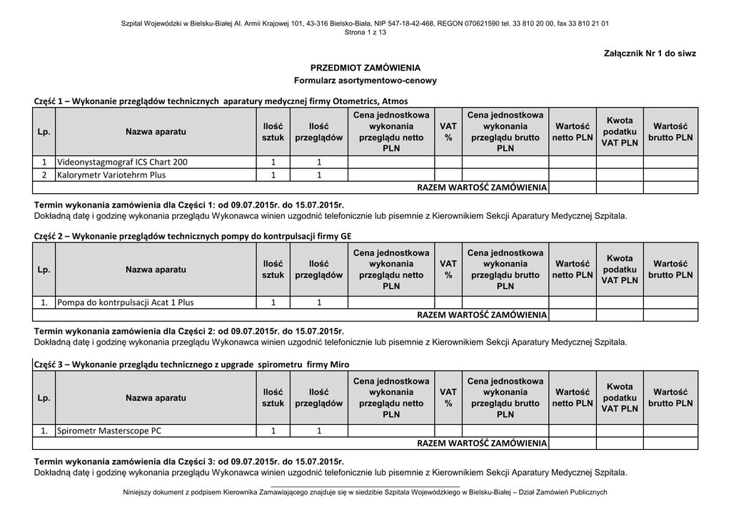 Szpital Wojewódzki w Bielsku-Białej Al. Armii Krajowej 101, 43-316 Bielsko-Biała, NIP 547-18-42-468, REGON 070621590 tel. 33 810 20 00, fax 33 810 21 01 Strona 1 z 13 Załącznik Nr 1 do siwz PRZEDMIOT ZAMÓWIENIA Formularz asortymentowo-cenowy Część 1 – Wykonanie przeglądów technicznych aparatury medycznej firmy Otometrics, Atmos Lp. 1 2 Nazwa aparatu Videonystagmograf ICS Chart 200 Kalorymetr Variotehrm Plus Ilość sztuk Ilość przeglądów 1 1 1 1 Cena jednostkowa wykonania przeglądu netto PLN VAT % Cena jednostkowa wykonania przeglądu brutto PLN Wartość netto PLN Kwota podatku VAT PLN Wartość brutto PLN RAZEM WARTOŚĆ ZAMÓWIENIA Termin wykonania zamówienia dla Części 1: od 09.07.2015r. do 15.07.2015r. Dokładną datę i godzinę wykonania przeglądu Wykonawca winien uzgodnić telefonicznie lub pisemnie z Kierownikiem Sekcji Aparatury Medycznej Szpitala. Część 2 – Wykonanie przeglądów technicznych pompy do kontrpulsacji firmy GE Lp. Nazwa aparatu 1. Pompa do kontrpulsacji Acat 1 Plus Ilość sztuk Ilość przeglądów 1 1 Cena jednostkowa wykonania przeglądu netto PLN VAT % Cena jednostkowa wykonania przeglądu brutto PLN Wartość netto PLN Kwota podatku VAT PLN Wartość brutto PLN RAZEM WARTOŚĆ ZAMÓWIENIA Termin wykonania zamówienia dla Części 2: od 09.07.2015r. do 15.07.2015r. Dokładną datę i godzinę wykonania przeglądu Wykonawca winien uzgodnić telefonicznie lub pisemnie z Kierownikiem Sekcji Aparatury Medycznej Szpitala. Część 3 – Wykonanie przeglądu technicznego z upgrade spirometru firmy Miro Lp. Nazwa aparatu 1. Spirometr Masterscope PC Ilość sztuk Ilość przeglądów 1 1 Cena jednostkowa wykonania przeglądu netto PLN VAT % Cena jednostkowa wykonania przeglądu brutto PLN Wartość netto PLN Kwota podatku VAT PLN RAZEM WARTOŚĆ ZAMÓWIENIA Termin wykonania zamówienia dla Części 3: od 09.07.2015r. do 15.07.2015r. Dokładną datę i godzinę wykonania przeglądu Wykonawca winien uzgodnić telefonicznie lub pisemnie z Kierownikiem Sekcji Aparatury Medycznej Szpitala. _________________________________________________ Niniejszy dokument z podpisem Kierownika Zamawiającego znajduje się w siedzibie Szpitala Wojewódzkiego w Bielsku-Białej – Dział Zamówień Publicznych Wartość brutto PLN Szpital Wojewódzki w Bielsku-Białej Al. Armii Krajowej 101, 43-316 Bielsko-Biała, NIP 547-18-42-468, REGON 070621590 tel. 33 810 20 00, fax 33 810 21 01 Strona 2 z 13 Część 4 – Wykonanie przeglądu technicznego utylizatora tlenku etylenu z wymianą filtra firmy 3M Lp. Nazwa aparatu 1. Abator Ilość sztuk Ilość przeglądów 1 1 Cena jednostkowa wykonania przeglądu netto PLN VAT % Cena jednostkowa wykonania przeglądu brutto PLN Wartość netto PLN Kwota podatku VAT PLN Wartość brutto PLN RAZEM WARTOŚĆ ZAMÓWIENIA Termin wykonania zamówienia dla Części 4: od 24.07.2015r. do 30.07.2015r. Dokładną datę i godzinę wykonania przeglądu Wykonawca winien uzgodnić telefonicznie lub pisemnie z Kierownikiem Sekcji Aparatury Medycznej Szpitala. Część 5 – Wykonanie przeglądów technicznych aparatury medycznej firmy Bear, Sensor Medics, Atom, Fischer&Paykel Lp. Nazwa aparatu 1. Respirator oscylacyjny Sensor Medicus 3100A 2. Respirator oscylacyjny Sensor Medicus 3100A 3. Respirator Bear 750 PSV Inkubator transportowy Atom V-2100G z 4. aparatem Infant Flow SIPAP sn: AJN02492 5. Aparat Infant Flow SIPAP Ilość sztuk Ilość przeglądów 1 2 3 1 2 3 1 1 1 1 Cena jednostkowa wykonania przeglądu netto PLN VAT % Cena jednostkowa wykonania przeglądu brutto PLN Wartość netto PLN Kwota podatku VAT PLN Wartość brutto PLN RAZEM WARTOŚĆ ZAMÓWIENIA Termin wykonania zamówienia dla Części 5: Poz. 1, 4 i 5 - od 31.07.2015r. do 06.08.2015r. Poz. 2 i 3 - od 04.09.2015r. do 10.09.2015r. Dokładną datę i godzinę wykonania przeglądu Wykonawca winien uzgodnić telefonicznie lub pisemnie z Kierownikiem Sekcji Aparatury Medycznej Szpitala. Część 6 – Wykonanie przeglądów technicznych aparatury medycznej firmy North-East Monitoring, Mortara Instrumens, Mobil O Graph, Reynolds Lp. Nazwa aparatu Ilość sztuk Ilość przeglądów Cena jednostkowa wykonania przeglądu netto PLN VAT % Cena jednostkowa wykonania przeglądu brutto PLN Wartość netto PLN Kwota podatku VAT PLN _________________________________________________ Niniejszy dokument z podpisem Kierownika Zamawiającego znajduje się w siedzibie Szpitala Wojewódzkiego w Bielsku-Białej – Dział Zamówień Publicznych Wartość brutto PLN Szpital Wojewódzki w Bielsku-Białej Al. Armii Krajowej 101, 43-316 Bielsko-Biała, NIP 547-18-42-468, REGON 070621590 tel. 33 810 20 00, fax 33 810 21 01 Strona 3 z 13 1. 2. 3. 4. Rejestrator EKG DR180+ Rejestrator EKG DR200/HE Rejestrator EKG H3+ Rejestrator NIBP 5 1 1 2 5 1 1 2 RAZEM WARTOŚĆ ZAMÓWIENIA Termin wykonania zamówienia dla Części 6: od 12.08.2015r. do 18.08.2015r. Dokładną datę i godzinę wykonania przeglądu Wykonawca winien uzgodnić telefonicznie lub pisemnie z Kierownikiem Sekcji Aparatury Medycznej Szpitala. Część 7 – Wykonanie przeglądów technicznych aparatury medycznej firmy Storz Lp. Nazwa aparatu Zestaw laparaskopowy chirurgiczny z narzędziami w składzie: Endoflator 26430520, Tor wizyjny, 1. Źródło światła Xenon Nowa 2. Laparoskop ginekologiczny z narzędziami 3. Histeroskop diagnostyczny z narzędziami 4. 5. 6. 7. 8. 9. Zestaw laryngologiczny z narzędziami w składzie: Tor wizyjny, Źródło światła Xenon Nowa Zestaw ortopedyczny z narzędziami w składzie: Tor wizyjny, Źródło światła Xenon Nowa, Arthropump 283 307 20 Zestaw neurochirurgiczny z narzędziami w składzie: Tor wizyjny, Źródło światła Xenon Nowa, Neurofiberoskop Choledoskop Resektoskop z narzędziami i żródłem światła halogen150 Diatermia Autocon TUR Ilość sztuk Ilość przeglądów 1 1 1 1 1 1 1 1 1 1 1 1 1 1 1 1 1 1 Cena jednostkowa wykonania przeglądu netto PLN VAT % Cena jednostkowa wykonania przegl