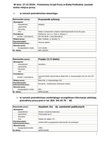 W dniu 27.12.2010r. Powiatowy Urząd Pracy w Białej Podlaskiej posiada wolne miejsca pracy: • w ramach pośrednictwa otwartego: Stanowisko pracy: Pracownik ochrony Wymagania: wykształcenie obojętne uprawnienia - staŜ pracy - inne Pracodawca : kontakt z pracodawcą Miejsce pracy: Charakterystyka wykonywanej pracy : Osoba z orzeczeniem o stopniu niepełnosprawności II lub III grupa Mulltiservice Sp z o.o. Płock ul. ZboŜowa 7 024 364 88 08 e-mail [email protected] Biała Podlaska ul. Brzeska 41 Ochrona obiektu Warunki pracy: Wynagrodzenie brutto 1317,-brutto Nr oferty: OfPr./10/2574 Stanowisko pracy: Fryzjer (1/2 etatu) Wymagania: wykształcenie zawodowe uprawnienia - staŜ pracy - inne Pracodawca : kontakt z pracodawcą Miejsce pracy: Charakterystyka wykonywanej pracy : Universal Studio Jańczuk Elwira, Biała Podl. ul. Kraszewskiego 10/1 tel. 516 753 137 Biała Podl. ul. Kraszewskiego 10/1 StrzyŜenie, modelowanie, farbowanie włosów Warunki pracy: Wynagrodzenie brutto Nr oferty: 660 ,OFPR/10/2582 • w ramach pośrednictwa zamkniętego szczegółowe informacje udzielają pośrednicy pracy pod nr tel. (83) 341 65 70 - 80 Stanowisko pracy: Asystent /ka ds. zamówień publicznych Wymagania: wykształcenie WyŜsze :inŜynieria środowiska uprawnienia Prawo jazdy kat. B staŜ pracy - inne Dyplom do wglądu i CV Charakterystyka wykonywanej pracy : Analiza SIWZ ,przygotowanie dokumentów do przetargów Warunki pracy: wynagrodzenie brutto Nr oferty: 1400,OFPR/10/2566 1 Stanowisko pracy: Mechanik samochodów cięŜarowych Wymagania: wykształcenie Zawodowe uprawnienia - staŜ pracy - inne - Charakterystyka wykonywanej pracy : Naprawa samochodów cięŜarowych Warunki pracy: wynagrodzenie brutto 1317,- Nr oferty: OfPr/10/2570 Stanowisko pracy: Księgowa (½ etatu ) Wymagania: wykształcenie Min. średnie uprawnienia - staŜ pracy Min. 2 lata na w/w stanowisku inne - Charakterystyka wykonywanej pracy : Naliczanie płac Warunki pracy: wynagrodzenie brutto 700,- Nr oferty: OfPr/10/2580 Stanowisko pracy: Drwal/pilarz drzew Wymagania: wykształcenie - uprawnienia - staŜ pracy - inne Kurs pilarza, prawo jazdy T Charakterystyka wykonywanej pracy : Pozyskiwanie, wycinka drzew w lesie, hodowla sadzonek leśnych (praca na potrzeby Nadleśnictwa Biała Podlaska) w gm. Biała Podl., Gm. Leśna Podlaska Warunki pracy: wynagrodzenie brutto 1500,- zł brutto Nr oferty: OFPR/10/2588 Stanowisko pracy: Zbrojarz-betoniarz Wymagania: wykształcenie podstawowe , zawodowe, średnie uprawnienia - staŜ pracy 1 rok w zawodzie murarza inne - Charakterystyka wykonywanej pracy : Roboty budowlane, zbrojenie, roboty betoniarskie, murowanie Warunki pracy: wynagrodzenie brutto Nr oferty: 1400,- zł brutto OFPR/10/2597 2
