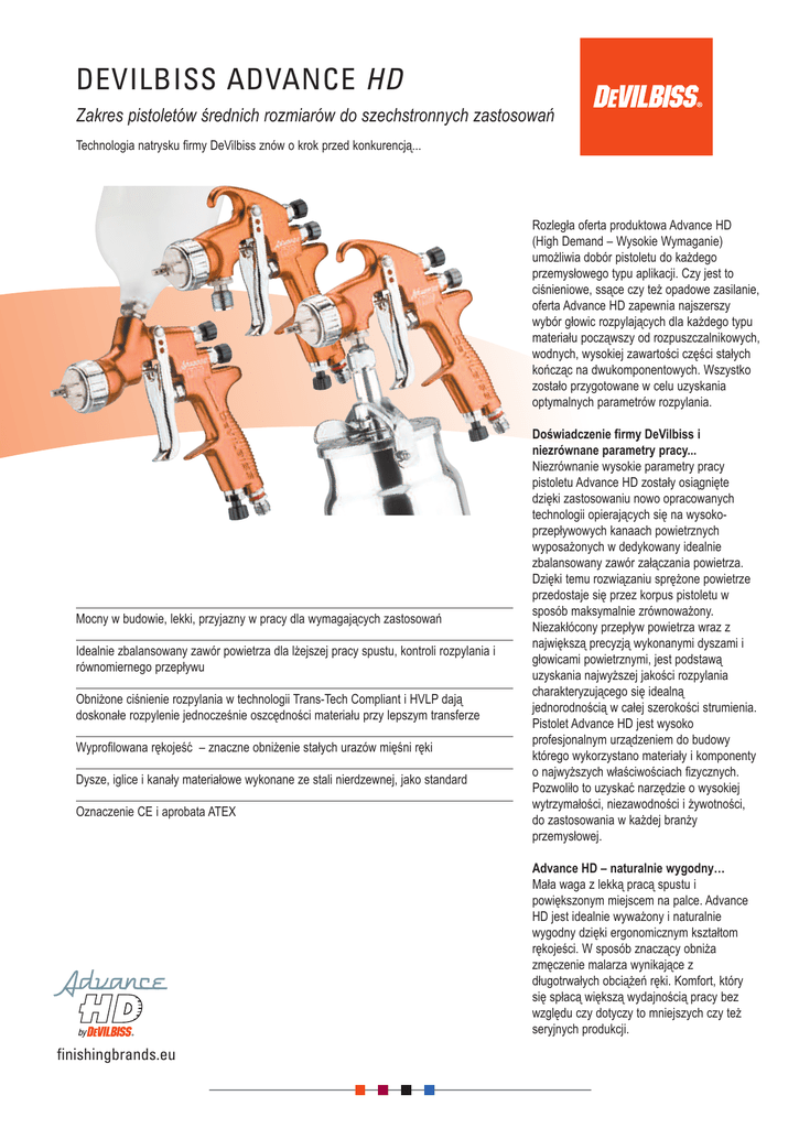 DEVILBISS ADVANCE HD Zakres pistoletów średnich rozmiarów do szechstronnych zastosowań Technologia natrysku firmy DeVilbiss znów o krok przed konkurencją... Rozległa oferta produktowa Advance HD (High Demand – Wysokie Wymaganie) umożliwia dobór pistoletu do każdego przemysłowego typu aplikacji. Czy jest to ciśnieniowe, ssące czy też opadowe zasilanie, oferta Advance HD zapewnia najszerszy wybór głowic rozpylających dla każdego typu materiału począwszy od rozpuszczalnikowych, wodnych, wysokiej zawartości części stałych kończąc na dwukomponentowych. Wszystko zostało przygotowane w celu uzyskania optymalnych parametrów rozpylania. Mocny w budowie, lekki, przyjazny w pracy dla wymagających zastosowań Idealnie zbalansowany zawór powietrza dla lżejszej pracy spustu, kontroli rozpylania i równomiernego przepływu Obniżone ciśnienie rozpylania w technologii Trans-Tech Compliant i HVLP dają doskonałe rozpylenie jednocześnie oszcędności materiału przy lepszym transferze Wyprofilowana rękojeść – znaczne obniżenie stałych urazów mięśni ręki Dysze, iglice i kanały materiałowe wykonane ze stali nierdzewnej, jako standard Oznaczenie CE i aprobata ATEX Doświadczenie firmy DeVilbiss i niezrównane parametry pracy... Niezrównanie wysokie parametry pracy pistoletu Advance HD zostały osiągnięte dzięki zastosowaniu nowo opracowanych technologii opierających się na wysokoprzepływowych kanaach powietrznych wyposażonych w dedykowany idealnie zbalansowany zawór załączania powietrza. Dzięki temu rozwiązaniu sprężone powietrze przedostaje się przez korpus pistoletu w sposób maksymalnie zrównoważony. Niezakłócony przepływ powietrza wraz z największą precyzją wykonanymi dyszami i głowicami powietrznymi, jest podstawą uzyskania najwyższej jakości rozpylania charakteryzującego się idealną jednorodnością w całej szerokości strumienia. Pistolet Advance HD jest wysoko profesjonalnym urządzeniem do budowy którego wykorzystano materiały i komponenty o najwyższych właściwościach fizycznych. Pozwoliło to uzyskać narzędzie o wysokiej wytrzymałości, niezawodności i żywotności, do zastosowania w każdej branży przemysłowej. Advance HD – naturalnie wygodny… Mała waga z lekką pracą spustu i powiększonym miejscem na palce. Advance HD jest idealnie wyważony i naturalnie wygodny dzięki ergonomicznym kształtom rękojeści. W sposób znaczący obniża zmęczenie malarza wynikające z długotrwałych obciążeń ręki. Komfort, który się spłacą większą wydajnością pracy bez względu czy dotyczy to mniejszych czy też seryjnych produkcji. finishingbrands.eu DEVILBISS ADVANCE HD Zakres pistoletów średnich rozmiarów do szechstronnych zastosowań Kluczowe charakterystyki i korzyści z zastosowania Advanced HD Głowice rozpylające Trans-Tech Compliant lub HVLP, dysze i iglice ze stali nierdzewnej, opcjonalnie utwardzane lub z węglików spiekanych idealnie odpowiadają wszystkim przemysłowym zastosowaniom. Kanał materiałowy w całości ze stali nierdzewnej 3/8” z uniwersalnym gwintem BSP i NPS. Bezkołnierzowa konstrukcja minimalizuje ilość części, redukuje ciężar i ułatwia mycie pistoletu. Korpus pistoletu z kutego, wysoko anodyzowanego aluminium, aby uzyskać wytrzymałą konstrukcję i długą żywotność. Szerszy uchwyt wieszaka – średnica 12mm. Ustawienia parametrów materiału i powietrza – ¿atwe i precyzyjne. Dedykowany zawór powietrza ułatwia dokładne zbalansowanie przepływu i łatwiejsze mycie. Powiększone miejsce na palce – wygodniejsza praca. Lekka praca spustu obniża nadmierną eksploatację mięśni ręki malarza. Samoregulujące się uszczelki PTFE iglicy. Komfortowy kształt spustu z optymalnie minimalnym skokiem pracy. Pistolet HD Advance firmy DeVilbiss znacząco podwyższa poprzeczkę standardów pracy i wydajności. Zakrzywiony kształt rękojeści – zapewnia optymalne ułożenie dłoni i redukuję napięcia mięśni. Zawór regulacji powietrza w rękojeści w standardzie. 1/4” uniwersalny gwint w złączu powietrza. Pistolety Advance HD zostały opracowane specjalnie z myślą o wysokoseryjnej produkcji przemysłowej. Przeznaczone są do pokrywania wszystkich rodzajów powierzchni drewnianych, metalowych, z tworzyw sztucznych ceramiki i kompozytów. Pistolet dolnozasilany zapewnia uzyskanie bezkonkurencyjnie wysokiego stopnia transferu farby przyczyniając się znacznie do obniżenia kosztów produkcji. I oczywiście, pistolet jest zgodny ze wszystkimi obecnie obowiązującymi normami ochrony środowiska. Advance HD dolnozasilany wraz przewodami i złączami firmy DeVilbiss Pistolet Advance HD z kubkiem opadowym jest w stanie natryskiwać materiał z tą samą prędkością co konwencjonalny odpowiednik lecz z wyższym stopniem transferu. Advance HD kubkowy umożliwia nam oszczędne uzyskanie doskonałych powierzchni. Tego typu pistolety zyskują coraz większą popularność w zastosowaniach wymagających dużej ilości zmiany kolorów. Dzięki swojej wadze, łatwości manewrowania i jakości powierzchni, pistolety kubkowe DeVilbis Advance HD ustanawiają standard w przemyśle wymagającym wysokojakościowych wykończeń. Advance HD z kubkiem opadowym GFC 501 (598cm3) Advance HD ze zbiornikiem ssącym jest lekkim i łatwym w operowaniu pistoletem opracowanym z myślą o wysokich przemys¿owych wymaganiach. Advance HD z 1 litrowym aluminiowym zbiornikiem ssącym KR-566-1-B DeVilbiss Advance HD posiada bardzo szeroki wybór głowic rozpylających i dysz materiałowych w celu jak najlepszego dobrania parametrów rozpylania całego zakresu stosowanych obecnie materiałów między innymi taki jak: o wysokiej zawartości części stałych, rozpuszczalnikowe, wodne, lakiery, bejce, szkliwa, emalie, bazy i wiele innych. DEVILBISS ADVANCE HD Zakres pistoletów średnich rozmiarów do szechstronnych zastosowań Bezkonkurencyjne parametry pracy pistoletu Advance HD uzy