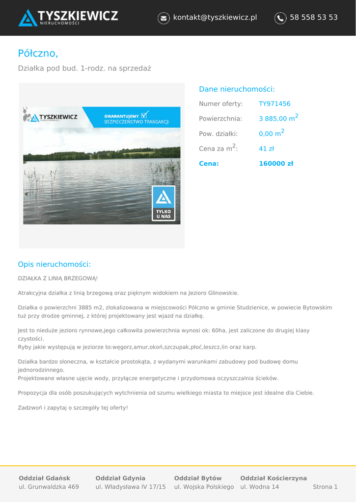 [email protected] 58 558 53 53 Półczno, Działka pod bud. 1-rodz. na sprzedaż Dane nieruchomości: Numer oferty: TY971456 Powierzchnia: 3 885,00 m Pow. działki: 0,00 m 2 2 2 Cena za m : 41 zł Cena: 160000 zł Opis nieruchomości: DZIAŁKA Z LINIĄ BRZEGOWĄ! Atrakcyjna działka z linią brzegową oraz pięknym widokiem na Jezioro Glinowskie. Działka o powierzchni 3885 m2, zlokalizowana w miejscowości Półczno w gminie Studzienice, w powiecie Bytowskim tuż przy drodze gminnej, z której projektowany jest wjazd na działkę. Jest to nieduże jezioro rynnowe,jego całkowita powierzchnia wynosi ok: 60ha, jest zaliczone do drugiej klasy czystości. Ryby jakie występują w jeziorze to:węgorz,amur,okoń,szczupak,płoć,leszcz,lin oraz karp. Działka bardzo słoneczna, w kształcie prostokąta, z wydanymi warunkami zabudowy pod budowę domu jednorodzinnego. Projektowane własne ujęcie wody, przyłącze energetyczne i przydomowa oczyszczalnia ścieków. Propozycja dla osób poszukujących wytchnienia od szumu wielkiego miasta to miejsce jest idealne dla Ciebie. Zadzwoń i zapytaj o szczegóły tej oferty! Oddział Gdańsk ul. Grunwaldzka 469 Oddział Gdynia ul. Władysława IV 17/15 Oddział Bytów ul. Wojska Polskiego Oddział Kościerzyna ul. Wodna 14 Strona 1 [email protected] 58 558 53 53 Więcej szczegółów na temat oferty TY971456 pod adresem http://www.tyszkiewicz.pl/TY971456 lub u agenta. Oddział Gdańsk ul. Grunwaldzka 469 Oddział Gdynia ul. Władysława IV 17/15 Oddział Bytów ul. Wojska Polskiego Oddział Kościerzyna ul. Wodna 14 Strona 2