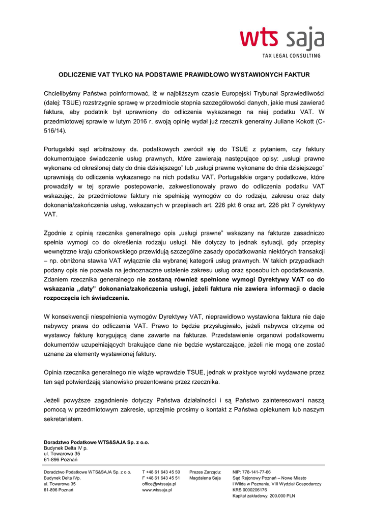ODLICZENIE VAT TYLKO NA PODSTAWIE PRAWIDŁOWO WYSTAWIONYCH FAKTUR Chcielibyśmy Państwa poinformować, iż w najbliższym czasie Europejski Trybunał Sprawiedliwości (dalej: TSUE) rozstrzygnie sprawę w przedmiocie stopnia szczegółowości danych, jakie musi zawierać faktura, aby podatnik był uprawniony do odliczenia wykazanego na niej podatku VAT. W przedmiotowej sprawie w lutym 2016 r. swoją opinię wydał już rzecznik generalny Juliane Kokott (C516/14). Portugalski sąd arbitrażowy ds. podatkowych zwrócił się do TSUE z pytaniem, czy faktury dokumentujące świadczenie usług prawnych, które zawierają następujące opisy: „usługi prawne wykonane od określonej daty do dnia dzisiejszego” lub „usługi prawne wykonane do dnia dzisiejszego” uprawniają do odliczenia wykazanego na nich podatku VAT. Portugalskie organy podatkowe, które prowadziły w tej sprawie postepowanie, zakwestionowały prawo do odliczenia podatku VAT wskazując, że przedmiotowe faktury nie spełniają wymogów co do rodzaju, zakresu oraz daty dokonania/zakończenia usług, wskazanych w przepisach art. 226 pkt 6 oraz art. 226 pkt 7 dyrektywy VAT. Zgodnie z opinią rzecznika generalnego opis „usługi prawne” wskazany na fakturze zasadniczo spełnia wymogi co do określenia rodzaju usługi. Nie dotyczy to jednak sytuacji, gdy przepisy wewnętrzne kraju członkowskiego przewidują szczególne zasady opodatkowania niektórych transakcji – np. obniżona stawka VAT wyłącznie dla wybranej kategorii usług prawnych. W takich przypadkach podany opis nie pozwala na jednoznaczne ustalenie zakresu usług oraz sposobu ich opodatkowania. Zdaniem rzecznika generalnego nie zostaną również spełnione wymogi Dyrektywy VAT co do wskazania „daty” dokonania/zakończenia usługi, jeżeli faktura nie zawiera informacji o dacie rozpoczęcia ich świadczenia. W konsekwencji niespełnienia wymogów Dyrektywy VAT, nieprawidłowo wystawiona faktura nie daje nabywcy prawa do odliczenia VAT. Prawo to będzie przysługiwało, jeżeli nabywca otrzyma od wystawcy fakturę korygującą dane zawarte na fakturze. Przedstawienie organowi podatkowemu dokumentów uzupełniających brakujące dane nie będzie wystarczające, jeżeli nie mogą one zostać uznane za elementy wystawionej faktury. Opinia rzecznika generalnego nie wiąże wprawdzie TSUE, jednak w praktyce wyroki wydawane przez ten sąd potwierdzają stanowisko prezentowane przez rzecznika. Jeżeli powyższe zagadnienie dotyczy Państwa działalności i są Państwo zainteresowani naszą pomocą w przedmiotowym zakresie, uprzejmie prosimy o kontakt z Państwa opiekunem lub naszym sekretariatem. Doradztwo Podatkowe WTS&SAJA Sp. z o.o. Budynek Delta IV p. ul. Towarowa 35 61-896 Poznań Doradztwo Podatkowe WTS&SAJA Sp. z o.o. Budynek Delta IVp. ul. Towarowa 35 61-896 Poznań T +48 61 643 45 50 F +48 61 643 45 51 [email protected] www.wtssaja.pl Prezes Zarządu: Magdalena Saja NIP: 778-141-77-66 Sąd Rejonowy Poznań – Nowe Miasto i Wilda w Poznaniu, VIII Wydział Gospodarczy KRS 0000206176 Kapitał zakładowy: 200.000 PLN tel. (+48) 61 643 45 50 fax. (+48) 61 643 45 51 Biuro w Warszawie Budynek Central Tower XXII p. Al. Jerozolimskie 81 02-001 Warszawa Powyższy Newsletter stanowi informację o charakterze ogólnym, jego celem jest dostarczenie Państwu na bieżąco informacji o zmianach w prawie podatkowym, interpretacjach organów podatkowych, rozwoju linii orzeczniczej oraz ciekawych komentarzach. Doradztwo Podatkowe WTS&SAJA nie ponosi prawnej odpowiedzialności za żadne działania lub zaniechania podjęte w wyniku powyższych informacji. Doradztwo Podatkowe WTS&SAJA Sp. z o.o. Budynek Delta IVp. ul. Towarowa 35 61-896 Poznań T +48 61 643 45 50 F +48 61 643 45 51 [email protected] www.wtssaja.pl Prezes Zarządu: Magdalena Saja NIP: 778-141-77-66 Sąd Rejonowy Poznań – Nowe Miasto i Wilda w Poznaniu, VIII Wydział Gospodarczy KRS 0000206176 Kapitał zakładowy: 200.000 PLN