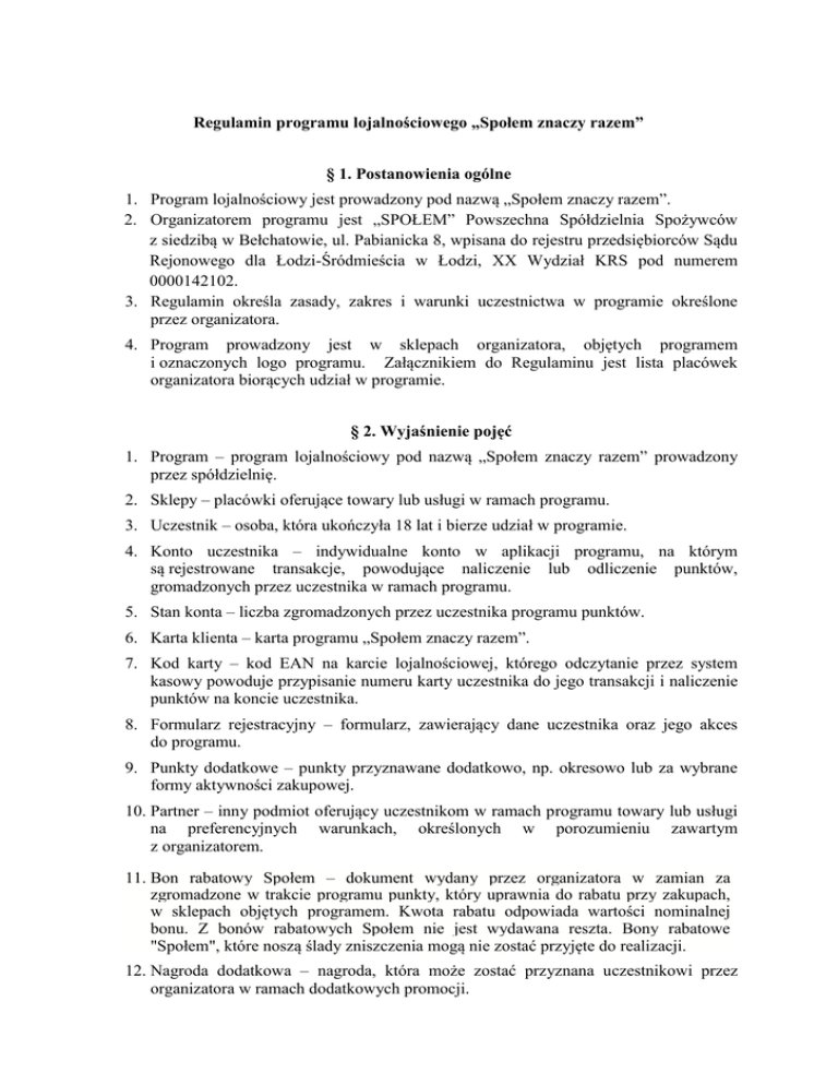 Regulamin programu lojalnościowego „Społem znaczy razem” § 1. Postanowienia ogólne 1. Program lojalnościowy jest prowadzony pod nazwą „Społem znaczy razem”. 2. Organizatorem programu jest „SPOŁEM” Powszechna Spółdzielnia Spożywców z siedzibą w Bełchatowie, ul. Pabianicka 8, wpisana do rejestru przedsiębiorców Sądu Rejonowego dla Łodzi-Śródmieścia w Łodzi, XX Wydział KRS pod numerem 0000142102. 3. Regulamin określa zasady, zakres i warunki uczestnictwa w programie określone przez organizatora. 4. Program prowadzony jest w sklepach organizatora, objętych programem i oznaczonych logo programu. Załącznikiem do Regulaminu jest lista placówek organizatora biorących udział w programie. § 2. Wyjaśnienie pojęć 1. Program – program lojalnościowy pod nazwą „Społem znaczy razem” prowadzony przez spółdzielnię. 2. Sklepy – placówki oferujące towary lub usługi w ramach programu. 3. Uczestnik – osoba, która ukończyła 18 lat i bierze udział w programie. 4. Konto uczestnika – indywidualne konto w aplikacji programu, na którym są rejestrowane transakcje, powodujące naliczenie lub odliczenie punktów, gromadzonych przez uczestnika w ramach programu. 5. Stan konta – liczba zgromadzonych przez uczestnika programu punktów. 6. Karta klienta – karta programu „Społem znaczy razem”. 7. Kod karty – kod EAN na karcie lojalnościowej, którego odczytanie przez system kasowy powoduje przypisanie numeru karty uczestnika do jego transakcji i naliczenie punktów na koncie uczestnika. 8. Formularz rejestracyjny – formularz, zawierający dane uczestnika oraz jego akces do programu. 9. Punkty dodatkowe – punkty przyznawane dodatkowo, np. okresowo lub za wybrane formy aktywności zakupowej. 10. Partner – inny podmiot oferujący uczestnikom w ramach programu towary lub usługi na preferencyjnych warunkach, określonych w porozumieniu zawartym z organizatorem. 11. Bon rabatowy Społem – dokument wydany przez organizatora w zamian za zgromadzone w trakcie programu punkty, który uprawnia do rabatu przy zakupach, w sklepach objętych programem. Kwota rabatu odpowiada wartości nominalnej bonu. Z bonów rabatowych Społem nie jest wydawana reszta. Bony rabatowe "Społem", które noszą ślady zniszczenia mogą nie zostać przyjęte do realizacji. 12. Nagroda dodatkowa – nagroda, która może zostać przyznana uczestnikowi przez organizatora w ramach dodatkowych promocji. § 3. Warunki udziału w Programie 1. Uczestnikiem programu może być wyłącznie pełnoletnia osoba fizyczna, która zgłosiła akces uczestnictwa w programie i której wydano kartę klienta. 2. Regulamin znajduje się w każdej uczestniczącej w programie placówce organizatora i okazywany jest na prośbę uczestnika, a także na stronie www.belchatow.spolem.org.pl 3. Wszelkie dane dotyczące uczestnika oraz informacje przez niego przekazane traktowane będą przez organizatora w sposób zgodny z zasadami zawartymi w niniejszym Regulaminie. 4. Wypełniając i przekazując formularz zgłoszeniowy uczestnik wyraża zgodę na przetwarzanie danych osobowych zawartych w formularzu zgłoszeniowym przez organizatora. Dane osobowe będą przetwarzane w celach reklamowych i marketingowych. Uczestnik może wyrazić zgodę na otrzymywanie ofert handlowych oraz korespondencji drogą elektroniczną (na adres poczty elektronicznej lub sms-em). Dane osobowe uczestnika są chronione zgodnie z Ustawą z dn. 29 sierpnia 1997 r. o ochronie danych osobowych (tj. Dz.U. z 2002 r. Nr 101, poz. 926 z późn.zm.) oraz ustawą z dnia 18 lipca 2002 o świadczeniu usług drogą elektroniczną (Dz. U. Nr 144, poz. 1204). 5. Każdy uczestnik ma możliwość wglądu i aktualizacji danych osobowych dotyczących jego osoby. W przypadku rezygnacji z uczestnictwa w programie, dane osobowe uczestnika są usuwane. 6. Karta klienta wydawana jest uczestnikom programu w sklepach organizatora, po złożeniu podpisu pod prawidłowo wypełnionym i własnoręcznie podpisanym formularzem rejestracyjnym. 7. Uczestnik programu może sprawdzić stan konta uczestnika poprzez stronę www.belchatow.spolem.org.pl, w sklepie wyznaczonym przez organizatora lub poprzez infolinię nr tel. 609 194 949 czynną w dni robocze od 7.00 do 15.00. 8. Karta klienta jest własnością organizatora. § 4. Zapisywanie transakcji, gromadzenie korzyści 1. Posiadacz karty klienta gromadzi punkty poprzez zakup towarów lub usług w sklepach organizatora, uczestniczących w programie. Z naliczenia zostają wyłączone zakupy: doładowań telefonicznych, wyrobów tytoniowych. 1a. Przy płatnościach bonami rabatowymi Społem punkty za zakupy nie będą naliczane na kartę użytkownika programu lojalnościowego "Społem Znaczy Razem". 2. Warunkiem naliczenia punktów jest okazanie karty klienta kasjerowi, odczytanie kodu karty klienta i zarejestrowanie transakcji w systemie kasowym. 3. Wartość transakcji zostaje przeliczona na punkty w ten sposób, że za każde pełne 5 złotych wartości zakupu uczestnik otrzymuje l punkt, natomiast za zgromadzone 120 punktów przysługuje bon rabatowy o wartości 10 złotych, za 220 punktów przysługuje bon rabatowy o wartości 20 złotych a za 460 punktów bon rabatowy o wartości 50zł. Organizator zastrzega sobie prawo do zmiany w rozliczaniu punktów poprzez odpowiedni aneks do umowy. 4. Rejestracja transakcji jest możliwa wyłącznie w chwili jej dokonania, natomiast aktualizacja stanu kont uczestników programu odbywać się będzie nie rzadziej niż co 7 dni od daty ich naliczenia (najwcześniej po 72 godzinach od daty naliczenia). 5. Punkty programu mogą być naliczane tylko jeden raz za każdą transakcję. 6. W ramach konkursów oraz działań promocyjnych uczestnikom mogą być przyznane dodatkowe punkty lub nagrody dodatkowe, na zasadach określonych odrębnie dla prowadzonych okresowo akcji. 7. Zgromadzone punkty zachowują ważność przez cały okres trwania programu. § 5. Wymiana