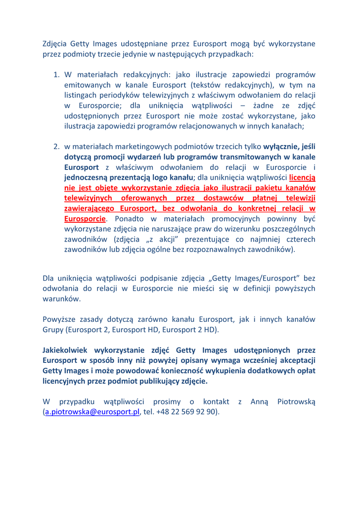 Zdjęcia Getty Images udostępniane przez Eurosport mogą być wykorzystane przez podmioty trzecie jedynie w następujących przypadkach: 1. W materiałach redakcyjnych: jako ilustracje zapowiedzi programów emitowanych w kanale Eurosport (tekstów redakcyjnych), w tym na listingach periodyków telewizyjnych z właściwym odwołaniem do relacji w Eurosporcie; dla uniknięcia wątpliwości – żadne ze zdjęć udostępnionych przez Eurosport nie może zostać wykorzystane, jako ilustracja zapowiedzi programów relacjonowanych w innych kanałach; 2. w materiałach marketingowych podmiotów trzecich tylko wyłącznie, jeśli dotyczą promocji wydarzeń lub programów transmitowanych w kanale Eurosport z właściwym odwołaniem do relacji w Eurosporcie i jednoczesną prezentacją logo kanału; dla uniknięcia wątpliwości licencją nie jest objęte wykorzystanie zdjęcia jako ilustracji pakietu kanałów telewizyjnych oferowanych przez dostawców płatnej telewizji zawierającego Eurosport, bez odwołania do konkretnej relacji w Eurosporcie. Ponadto w materiałach promocyjnych powinny być wykorzystane zdjęcia nie naruszające praw do wizerunku poszczególnych zawodników (zdjęcia „z akcji” prezentujące co najmniej czterech zawodników lub zdjęcia ogólne bez rozpoznawalnych zawodników). Dla uniknięcia wątpliwości podpisanie zdjęcia „Getty Images/Eurosport” bez odwołania do relacji w Eurosporcie nie mieści się w definicji powyższych warunków. Powyższe zasady dotyczą zarówno kanału Eurosport, jak i innych kanałów Grupy (Eurosport 2, Eurosport HD, Eurosport 2 HD). Jakiekolwiek wykorzystanie zdjęć Getty Images udostępnionych przez Eurosport w sposób inny niż powyżej opisany wymaga wcześniej akceptacji Getty Images i może powodować konieczność wykupienia dodatkowych opłat licencyjnych przez podmiot publikujący zdjęcie. W przypadku wątpliwości prosimy o kontakt ([email protected], tel. +48 22 569 92 90). z Anną Piotrowską