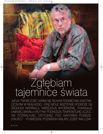 78-83_sztuka WALCZAK:Layout 1 2008-08-20 15:24 Strona 78 Zgłębiam tajemnice świata „MOJA TWÓRCZOŚĆ KARMI SIĘ SILNYMI PODNIETAMI ZAKOTWICZONYMI W REALNOŚCI. STĄD MOJE WSZYSTKIE PODRÓŻE SĄ ŹRÓDŁEM INSPIRACJI. NAPĘDZAJĄ WYOBRAŹNIĘ, POMAGAJĄ UNIKNĄĆ BANAŁU I RUTYNY. PODNOSZĄ TEMPERATURĘ UCZUĆ, NIE POZWALAJĄC OSTYGNĄĆ POD NAPOREM POWSZEDNIOŚCI” – POWIEDZIAŁ POZNAŃSKI MALARZ JÓZEF WALCZAK. 78 WITTCHEN 78-83_sztuka WALCZAK:Layout 1 2008-08-18 10:09 Strona 79 sztuka Fot. Archiwum Józefa Walczaka „Martwa natura z poduszkami” Łatwo być artystą w dzisiejszych czasach? Artystą się bywa. Przede wszystkim trzeba mieć powód do namalowania obrazu. Czuję się artystą wtedy, kiedy wiem, po co tworzę. Lubię podróżować. Jeździłem w Tatry, Himalaje, zmagałem się z siedmiotysięcznikami. I myślę sobie, że każda podróż, bez względu na motyw jej podjęcia, zostawia swój uboczny skutek w postaci kolekcji wrażeń. A dla malarza to rzecz bezcenna, bo przecież malarstwo jest przede wszystkim sztuką oka. Od tego wszystko się zaczyna. Metoda ta jednak bywa dość kłopotliwa. Po pewnym czasie bowiem wyruszenie w podróż może stać się wymówką artystyczną. Dlatego coraz częściej wędruję po obszarach myśli, dzieł i symboli. Nazwałbym to podróżowaniem w ramach własnej zawartości intelektualnej. Po prostu podróżuję w obrazy. I podczas każdej takiej wyprawy staram się być artystą. Tylko podróże motywują Pana do tworzenia? Dominacja natury jest w moim przypadku niezwykle istotna. Zawsze się na niej opieram, korzystając ze wspomnień, które nazywam pamięcią malarską. Wyprawy ku tym właśnie skojarzeniom i towarzyszącym im emocjom uważam za najważniejsze źródło mojej twórczości. Nie dla wszystkich jednak jest to wystarczająco czytelne. Dlatego nieraz muszę tłumaczyć się ze swojego malarstwa. Wtedy jednak mam poczucie pewnego żalu. Można wytłumaczyć obraz? Istnieje pewien metajęzyk sztuki, z którego korzystam w czasie zajęć ze studentami. Muszę z nimi rozmawiać i unaoczniać im pewne zagadnienia. Malarstwo jednak, podobnie jak poezja czy muzyka, jest dyscypliną mało werbalną. Jeśli nie znając prac jakiegokolwiek malarza, przeczytamy opisy jego dzieł, to w chwili, w której je poznamy, rzeczywistość może przekroczyć nasze oczekiwania albo też ich nie spełni – nie ma jednoznacznego przełożenia. Dlatego nikt nigdy nie wytłumaczy obrazu i nie powinno się tego od nikogo oczekiwać. Malarstwo wydaje się dziedziną niezwykle abstrakcyjną i trudno ująć je w ramy nauki. Czy zatem można się go wyuczyć? I tak, i nie. Malarstwo składa się z dwóch elementów. Z jednej strony mamy warsztat, poznawanie podstawowych zasad budowania kompozycji, problem koloru, kreowanie materii i przestrzeni. W ten sposób twórca kształtuje swój rodzaj zapisu. Cała reszta to sfera intelektualna każdego twórcy, tutaj nie wkraczamy już z nauką. Jako wykładowcy nie uczymy malarstwa. My jedynie pomagamy, ingerujemy w proces tworzenia z pełnym poszanowaniem autonomii studenta, jego własnego charakteru i temperamentu. Za podstawę programu uważam autentyczny udział każdego studenta we wspólnych zajęciach w pracowni, która jest miejscem pewnej wspólnoty artystycznej. Miejscem poszukiwania sensu, znaczenia i wartości indywidualnego tworzenia. „Kołysanka” „Akt – Interferencja” WITTCHEN 79 78-83_sztuka WALCZAK:Layout 1 2008-08-18 10:09 Strona 80 sztuka „Wizjoner” „Akt” „Wnętrze II” Jak zdefiniowałby Pan swoją twórczość? Wielu porównuje Pana prace do malarstwa Francisa Bacona… Francis Bacon to było moje wielkie zauroczenie. Również Hugh Davis, dyrektor Muzeum Sztuki Współczesnej w San Diego, dostrzegł w moich pracach skutek zadurzenia się w tym artyście. Uważam jednak, że nie tylko ja uległem urokowi jego dzieł, cała Polska sztuka figuratywna, a zwłaszcza „nowa figuracja”, czerpała z myśli tego twórcy. Te inspiracje to jednak chyba za mało, by pokusić się o jakąkolwiek definicję. Nie potrafiłbym się podjąć tego zadania. Mogę jednak opowiedzieć o tym, jak pracuję. Być może opis tej metody podpowie, jak nazwać to, co robię. Jak zatem pracuje Józef Walczak? Pracę nad obrazem zawsze rozpoczynam w dwóch kierunkach jednocześnie. Na jednej z tych dróg opieram się na rzeczywistości. Cyzeluję formę w sposób zdecydowany, morfologiczny, według wszelkich zasad klasycznego malarstwa. Tworzę iluzję, ale w sposób dosłowny. W tym samym czasie zajmuję się otoczeniem, w które z pełną dezynwolturą wrzucam śmietnik materii, następuje chaos wynikający z gestu, temperamentu i ruchu pędzla. W momencie, w którym forma wybija się z całego obrazu i traci tym samym kontakt z otoczeniem, zaczynam ją niszczyć. To, co zostało doskonale wypracowane, ulega destrukcji. Natomiast okalający formę śmietnik materii, do tej pory pełen niejasności, precyzuję i dopracowuję. Kiedy następuje równowaga między tym, co realne, i tym, co nierealne, zatrzymuję obraz. Nie chcę powiedzieć, że go kończę, ponieważ obrazu nigdy nie można nazwać dziełem skończonym. On zawsze będzie gotowy na kolejne pociągnięcia pędzla. Mówi Pan, że malarstwo jest Pana powinnością… Tak, choć niektórzy traktują je jako obowiązek i misję. Wielu wyznaje zasadę: ani dnia bez kreski. Ja tak nie myślę. Czasami trzeba odpocząć, zebrać siły, uciec od malarstwa, zawsze jednak pamiętając, że się do niego wróci. W momencie oczekiwania na 80 WITTCHEN 78-83_sztuka WALCZAK:Layout 1 2008-08-18 10:09 Strona 81 sztuka „Martwa natura z kieliszkiem” Fot. Archiwum Józefa Walczaka MALOWANIE JEST W PEWNYM SENSIE MOMENTEM, W KTÓRYM SIĘ OBNAŻAM. I CHOĆ JĘZYK, KTÓRYM OPERUJE, JEST BARDZO DELIKATNY I NIEDOSŁOWNY, MALARSTWO JEST RODZAJEM EKSHIBICJONIZMU DLA SAMEGO TWÓRCY. INTERPRETUJĄC OBRAZ, ODBIORCA ANALIZUJE RÓWNIEŻ ARTYSTĘ. 
