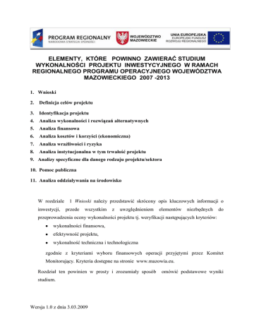 ELEMENTY, KTÓRE POWINNO ZAWIERAĆ STUDIUM WYKONALNOŚCI PROJEKTU INWESTYCYJNEGO W RAMACH REGIONALNEGO PROGRAMU OPERACYJNEGO WOJEWÓDZTWA MAZOWIECKIEGO 2007 -2013 1. Wnioski 2. Definicja celów projektu 3. Identyfikacja projektu 4. Analiza wykonalności i rozwiązań alternatywnych 5. Analiza finansowa 6. Analiza kosztów i korzyści (ekonomiczna) 7. Analiza wrażliwości i ryzyka 8. Analiza instytucjonalna w tym trwałość projektu 9. Analizy specyficzne dla danego rodzaju projektu/sektora 10. Pomoc publiczna 11. Analiza oddziaływania na środowisko W rozdziale inwestycji, 1 Wnioski należy przedstawić skrócony opis kluczowych informacji o przede wszystkim z uwzględnieniem elementów niezbędnych do przeprowadzenia oceny wykonalności projektu tj. weryfikacji następujących kryteriów: wykonalności finansowa, efektywność projektu, wykonalność techniczna i technologiczna zgodnie z kryteriami wyboru finansowych operacji przyjętymi przez Komitet Monitorujący. Kryteria dostępne na stronie www.mazowia.eu. Rozdział ten powinien w prosty i zrozumiały sposób studium. Wersja 1.0 z dnia 3.03.2009 omówić podstawowe wyniki Rozdziały od 2 do 7 należy opracować w oparciu o Wytyczne w zakresie wybranych zagadnień związanych z przygotowaniem projektów inwestycyjnych, w tym projektów generujących dochód Ministerstwa Rozwoju Regionalnego z dnia 15 stycznia 2009 roku. Ponadto rozdział 4 Analiza wykonalności i rozwiązań alternatywnych powinien zostać rozszerzony o analizę i uzasadnienie wyboru zastosowanych w projekcie rozwiązań technologicznych. Rozdział 8 Analiza instytucjonalna w tym trwałość projektu powinien przede wszystkim odpowiedzieć na pytanie: Czy beneficjent posiada zdolność organizacyjną do wdrożenia projektu? Czy beneficjent posiada zdolność organizacyjną i finansową do utrzymania projektu? Kto będzie zarządzał projektem w okresie, co najmniej 5 lat od zakończenia projektu? Rozdział 9 Analizy specyficzne dla danego rodzaju projektu/sektora Należy dokonać analizy projektu pod kątem specyfiki danego sektora np. w przypadku projektów drogowych należy przeprowadzić analizy ruchowe, edukacyjnych analizy efektywności działań dydaktycznych itp. Rozdział 10 Pomoc publiczna Należy uzasadnić czy projekt podlega zasadom pomocy publicznej na podstawie obowiązujących aktów prawnych i wytycznych. W przypadku stwierdzenia, że inwestycja podlega rygorowi pomocy publicznej należy uzasadnić wnioskowany poziom dofinansowania zgodnie z poziomem wskazanym w odpowiednim rozporządzeniu. Wykaz obowiązujących aktów prawnych i wytycznych znajduje się w Uszczegółowieniu RPO WM obowiązującym w chwili ogłoszenia konkursu. Rozdział 11 Analiza oddziaływania na środowisko Dla projektów, dla których wymagane jest zgodnie z prawem polskim oraz unijnym przeprowadzenie postępowania w sprawie uzyskania decyzji o środowiskowych Wersja 1.0 z dnia 3.03.2009 uwarunkowaniach w tym oceny oddziaływania na środowisko należy przedstawić krótką analizę oddziaływania inwestycji na poszczególne komponenty środowiska. Dla wszystkich projektów obligatoryjne jest odniesienie się do przewidywanego wpływu inwestycji na obszary Natura 2000. W obu ww. przypadkach zastosowanie mają Wytyczne Ministra Rozwoju Regionalnego w zakresie postępowania w sprawie oceny oddziaływania na środowisko dla przedsięwzięć współfinansowanych operacyjnych. Wersja 1.0 z dnia 3.03.2009 z krajowych lub regionalnych programów
