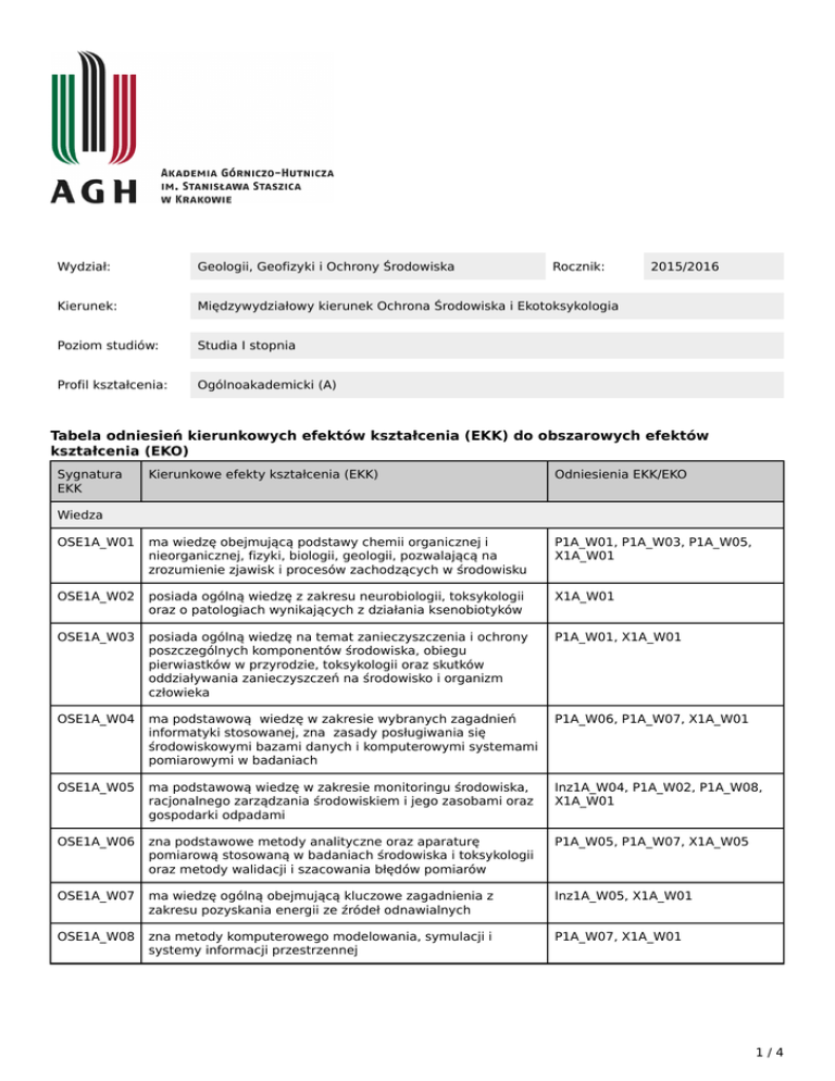 Wydział: Geologii, Geofizyki i Ochrony Środowiska Rocznik: Kierunek: Międzywydziałowy kierunek Ochrona Środowiska i Ekotoksykologia Poziom studiów: Studia I stopnia Profil kształcenia: Ogólnoakademicki (A) 2015/2016 Tabela odniesień kierunkowych efektów kształcenia (EKK) do obszarowych efektów kształcenia (EKO) Sygnatura EKK Kierunkowe efekty kształcenia (EKK) Odniesienia EKK/EKO OSE1A_W01 ma wiedzę obejmującą podstawy chemii organicznej i nieorganicznej, fizyki, biologii, geologii, pozwalającą na zrozumienie zjawisk i procesów zachodzących w środowisku P1A_W01, P1A_W03, P1A_W05, X1A_W01 OSE1A_W02 posiada ogólną wiedzę z zakresu neurobiologii, toksykologii oraz o patologiach wynikających z działania ksenobiotyków X1A_W01 OSE1A_W03 posiada ogólną wiedzę na temat zanieczyszczenia i ochrony poszczególnych komponentów środowiska, obiegu pierwiastków w przyrodzie, toksykologii oraz skutków oddziaływania zanieczyszczeń na środowisko i organizm człowieka P1A_W01, X1A_W01 OSE1A_W04 ma podstawową wiedzę w zakresie wybranych zagadnień informatyki stosowanej, zna zasady posługiwania się środowiskowymi bazami danych i komputerowymi systemami pomiarowymi w badaniach P1A_W06, P1A_W07, X1A_W01 OSE1A_W05 ma podstawową wiedzę w zakresie monitoringu środowiska, racjonalnego zarządzania środowiskiem i jego zasobami oraz gospodarki odpadami Inz1A_W04, P1A_W02, P1A_W08, X1A_W01 OSE1A_W06 zna podstawowe metody analityczne oraz aparaturę pomiarową stosowaną w badaniach środowiska i toksykologii oraz metody walidacji i szacowania błędów pomiarów P1A_W05, P1A_W07, X1A_W05 OSE1A_W07 ma wiedzę ogólną obejmującą kluczowe zagadnienia z zakresu pozyskania energii ze źródeł odnawialnych Inz1A_W05, X1A_W01 OSE1A_W08 zna metody komputerowego modelowania, symulacji i systemy informacji przestrzennej P1A_W07, X1A_W01 Wiedza 1/4 Odniesienia EKK/EKO OSE1A_W09 posiada wiedzę z matematyki, fizyki, chemii wystarczającą do analizy i interpretacji zjawisk występujących w środowisku oraz do formułowania i rozwiązywania praktycznych problemów inżynierskich w zakresie ochrony środowiska i toksykologii Inz1A_W02, P1A_W02, X1A_W02 OSE1A_W10 zna metody statystyczne, informatyczne i kartograficzne opracowywania danych Inz1A_W02, P1A_W07, X1A_W04 OSE1A_W11 zna zasady bezpieczeństwa i higieny pracy w stopniu wystarczającym do pracy na stanowisku inżyniera P1A_W09, X1A_W06 OSE1A_W12 posiada podstawową wiedzę w zakresie przepisów prawnych związanych z ochroną środowiska i toksykologią, Inz1A_W03, X1A_W07 OSE1A_W13 zna zasady etyki zawodowej oraz rozumie społeczne i pozatechniczne aspekty działalności naukowej i inżynierskiej Inz1A_W03, X1A_W07 OSE1A_W14 ma podstawową wiedzę w zakresie ochrony własności przemysłowej i intelektualnej oraz prawa autorskiego; potrafi korzystać z zasobów informacji patentowej P1A_W10, X1A_W08 OSE1A_W15 zna ogólne zasady tworzenia i rozwoju form indywidualnej przedsiębiorczości wykorzystującej wiedzę z zakresu ochrony środowiska i toksykologii Inz1A_W04, P1A_W11, X1A_W09 OSE1A_W16 ma podstawową wiedzę o cyklu życia urządzeń, obiektów i systemów technicznych wykorzystywanych w ochronie środowiska, analizach chemicznych czy toksykologicznych Inz1A_W01 OSE1A_U01 student potrafi integrować uzyskane informacje, dokonywać ich interpretacji, a także wyciągać wnioski oraz formułować i uzasadniać opinie Inz1A_U01, P1A_U07, X1A_U01 OSE1A_U02 potrafi znaleźć rozwiązanie prostych problemów inżynierskich z zakresu ochrony środowiska i toksykologii w oparciu o zdobytą wiedzę z różnych dziedzin nauki Inz1A_U06, Inz1A_U07, X1A_U01 OSE1A_U03 potrafi wykorzystać poznane zasady i metody fizyki oraz odpowiednie narzędzia matematyczne do rozwiązywania typowych zadań z zakresu nauk przyrodniczych i technicznych Inz1A_U02, Inz1A_U06, P1A_U01, X1A_U01 OSE1A_U04 umie posługiwać się regułami ścisłego, logicznego myślenia w analizie procesów fizycznych i technicznych Inz1A_U03, X1A_U01 OSE1A_U05 umie posługiwać się aparaturą analityczną pod kierunkiem opiekuna naukowego w zakresie ochrony środowiska i toksykologii, potrafi wykonać opis i zinterpretować wyniki wykonanych analiz Inz1A_U01, Inz1A_U02, Inz1A_U07, P1A_U04, X1A_U02, X1A_U03 OSE1A_U06 posługuje się podstawowymi narzędziami analizy matematycznej, statystyki i rachunku prawdopodobieństwa Inz1A_U02, P1A_U05, X1A_U01, X1A_U02 OSE1A_U07 potrafi przeprowadzić badania doświadczalne, pomiary lub obserwacje laboratoryjne i terenowe, opisać je oraz zinterpretować ich wyniki Inz1A_U01, P1A_U06, X1A_U03 OSE1A_U08 potrafi zaplanować i zrealizować proste badania doświadczalne oraz wykonać pomiary lub wyznaczyć wartości Inz1A_U01, Inz1A_U02, X1A_U03 OSE1A_U09 potrafi ocenić wiarygodność zmierzonych wielkości fizycznochemicznych, przeprowadzić analizę statystyczną oraz krytycznie ocenić wiarygodność wyników oznaczeń Inz1A_U01, P1A_U05, X1A_U02, X1A_U03 OSE1A_U10 potrafi racjonalnie i wydajnie organizować swoją pracę P1A_U06, X1A_U03 Umiejętności 2/4 Odniesienia EKK/EKO OSE1A_U11 potrafi zastosować podstawowe pakiety oprogramowania oraz wybrane języki programowania do rozwiązywania prostych zadań inżynierskich Inz1A_U01, Inz1A_U02, P1A_U05, X1A_U04 OSE1A_U12 korzysta z fachowej literatury, baz danych oraz innych źródeł informacji w celu pozyskania niezbędnych informacji oraz wykazuje zdolność oceny wiarygodności pozyskanych informacji P1A_U02, P1A_U03, P1A_U07, X1A_U05 OSE1A_U13 potrafi przedstawić wyniki badań własnych w postaci referatu, prezentacji, opracowania projektowego zawierającego opis i uzasadnienie celu pracy, przyjętą metodykę, wyniki oraz ich znaczenie na tle innych podobnych badań P1A_U09, X1A_U05 OSE1A_U14 potrafi skonfrontować dane z istniejącymi normami i przepisami prawa X1A_U05 OSE1A_U15 potrafi w zrozumiały sposób przedstawić podstawowe fakty dotyczące opracowań naukowy