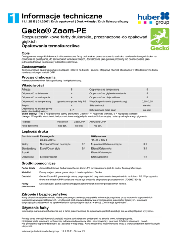 Informacje techniczne 11.1.29 E | 01.2007 | Druk opakowań | Druk wklęsły / Druk fleksograficzny Gecko® Zoom-PE Rozpuszczalnikowe farby drukarskie, przeznaczone do opakowań giętkich Opakowania termokurczliwe Opis Dostępne we wszystkich kolorach nitrocelulozowe farby drukarskie, przeznaczone do zadruku nawierzchniowego i druku na odwrocie na polietylenie, do zastosowań termokurczliwych, dostarczane jako gotowe produkty lub do stosowania jako jednoskładnikowe koncentraty i dodatki systemowe. Zastosowanie Termokurczliwe opakowania typy multipack i sleeve na butelki i puszki. Mogą być równieŜ stosowane w standardowym druku nawierzchniowym na folii OPP. Proces drukowania Nawierzchniowy druk fleksograficzny i wklęsłodrukowy. Właściwości Adhezja 5 Odpornośc na temperaturę 5 Odporność na ścieranie 4 Odporność na głębokie mroŜenie 5 Odporność na zadrapania 4 Odporność na oleje roślinne Odporność na temperaturę ograniczona przez folię PE 5 Współczynnik tarcia (dynamiczny) 0,25–0,35 Połysk 4 Siły laminacji nie dot. Odporność na światło (BWS3–7 Siły laminacji (heat seal) nie dot. skala niebieskiej wełny) Skala oceny: (1 do 5 na podstawie gamy produktów Gecko) 1 = najgorsza wartość, 5 = najlepsza wartość Uwaga: Wszystkie właściwości odpornościowe mają jedynie wartość informacyjną i zaleŜą od wybranego pigmentu. PodłoŜe Folia dolotowa Polietylen CoexOPP Akrylowa OPP nie dot. nie dot. nie dot. - - - Lepkość druku Rozcieńczalniki Fleksografia Wklęsłodruk 20–25 s DIN 4 15–20 s DIN 4 Wolny N-propanol/Octan n-propylu 9:1 N-propanol/Octan n-propylu 3:1 Standardowy Etanol/Octan etylu 9:1 Etanol/Octan etylu 3:1 Szybki Opóźniacz Etanol/Octan etylu Etoksypropanol Etoksypropanol 1:1 Środki pomocnicze Farba biała Jednoskładnikowa farba biała Gecko Zoom-PE przeznaczona jest do druku fleksograficznego. Metaliki Dostępna jest pełna gama złotych i srebrnych farb Gecko. Dodatki Gecko Zoom-PE gwarantuje dobrą przyczepność przy drukowaniu bezpośrednio na foliach PE. W przypadku druku na foliach OPP konieczne moŜe być dodanie aktywatora przyczepności (70GH278345). Farby procesowe Dostępna jest gama wolnoschnących półtonowych kolorów procesowych flekso. Zdrowie i bezpieczeństwo Karty charakterystyki materiału niebezpiecznego zawierają wszystkie informacje przydatne przy tworzeniu odpowiednich instrukcji wewnątrzzakładowych. UŜytkownik jest odpowiedzialny za przestrzeganie przepisów lokalnych. Informacji dotyczących zastosowań na opakowaniach spoŜywczych szukaj w sekcji „Deklaracja zgodności”. UŜywanie farby Informacje na temat obchodzenia się z farbą przeznaczoną do opakowań giętkich znajdują się w sekcji Ogólne wytyczne. Porady oraz więcej informacji znaleźć moŜna pod adresami podanymi na stronie www.hubergroup.de. Niniejsza karta informacji technicznej odzwierciedla obecny stan naszej wiedzy. Jest ona źródłem informacji i porad. Nie ponosimy odpowiedzialności za zawarte w niej błędy. Karta moŜe być modyfikowana wraz z wprowadzaniem technicznych ulepszeń. Informacja techniczna hubergroup · 11.1.29 E · Strona 1/1