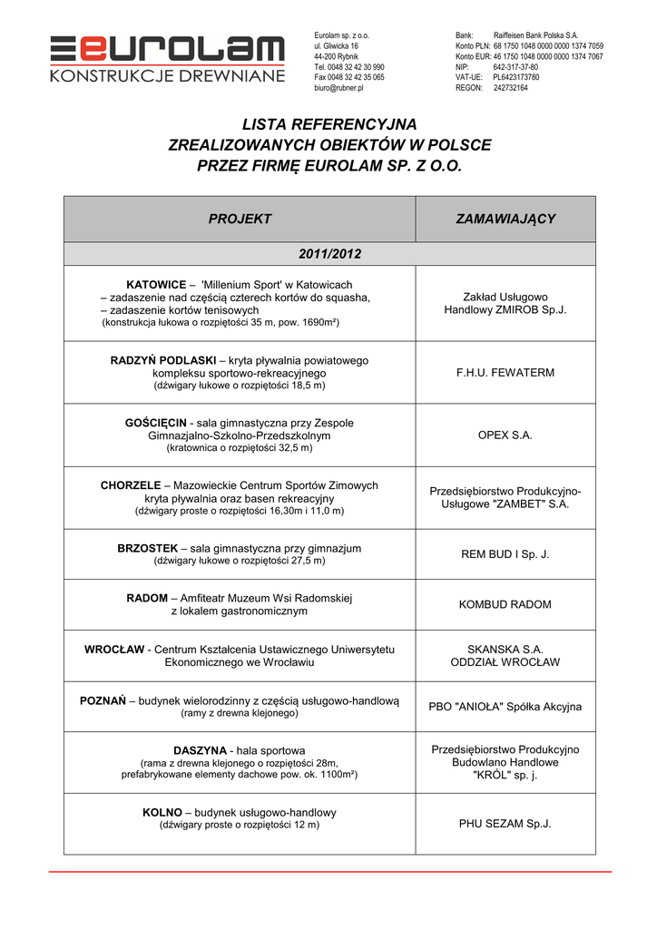 Eurolam sp. z o.o. ul. Gliwicka 16 44-200 Rybnik Tel. 0048 32 42 30 990 Fax 0048 32 42 35 065 [email protected] Bank: Raiffeisen Bank Polska S.A. Konto PLN: 68 1750 1048 0000 0000 1374 7059 Konto EUR: 46 1750 1048 0000 0000 1374 7067 NIP: 642-317-37-80 VAT-UE: PL6423173780 REGON: 242732164 LISTA REFERENCYJNA ZREALIZOWANYCH OBIEKTÓW W POLSCE PRZEZ FIRMĘ EUROLAM SP. Z O.O. PROJEKT ZAMAWIAJĄCY 2011/2012 KATOWICE – 'Millenium Sport' w Katowicach – zadaszenie nad częścią czterech kortów do squasha, – zadaszenie kortów tenisowych Zakład Usługowo Handlowy ZMIROB Sp.J. (konstrukcja łukowa o rozpiętości 35 m, pow. 1690m²) RADZYŃ PODLASKI – kryta pływalnia powiatowego kompleksu sportowo-rekreacyjnego F.H.U. FEWATERM (dźwigary łukowe o rozpiętości 18,5 m) GOŚCIĘCIN - sala gimnastyczna przy Zespole Gimnazjalno-Szkolno-Przedszkolnym OPEX S.A. (kratownica o rozpiętości 32,5 m) CHORZELE – Mazowieckie Centrum Sportów Zimowych kryta pływalnia oraz basen rekreacyjny (dźwigary proste o rozpiętości 16,30m i 11,0 m) BRZOSTEK – sala gimnastyczna przy gimnazjum (dźwigary łukowe o rozpiętości 27,5 m) Przedsiębiorstwo ProdukcyjnoUsługowe "ZAMBET" S.A. REM BUD I Sp. J. RADOM – Amfiteatr Muzeum Wsi Radomskiej z lokalem gastronomicznym KOMBUD RADOM WROCŁAW - Centrum Kształcenia Ustawicznego Uniwersytetu Ekonomicznego we Wrocławiu SKANSKA S.A. ODDZIAŁ WROCŁAW POZNAŃ – budynek wielorodzinny z częścią usługowo-handlową (ramy z drewna klejonego) DASZYNA - hala sportowa (rama z drewna klejonego o rozpiętości 28m, prefabrykowane elementy dachowe pow. ok. 1100m²) PBO "ANIOŁA" Spółka Akcyjna Przedsiębiorstwo Produkcyjno Budowlano Handlowe "KRÓL" sp. j. KOLNO – budynek usługowo-handlowy (dźwigary proste o rozpiętości 12 m) PHU SEZAM Sp.J. Eurolam sp. z o.o. ul. Gliwicka 16 44-200 Rybnik Tel. 0048 32 42 30 990 Fax 0048 32 42 35 065 [email protected] Bank: Raiffeisen Bank Polska S.A. Konto PLN: 68 1750 1048 0000 0000 1374 7059 Konto EUR: 46 1750 1048 0000 0000 1374 7067 NIP: 642-317-37-80 VAT-UE: PL6423173780 REGON: 242732164 2011/2012 PCIM – budynek gastronomiczno-hotelowy „NEDAN” (ramy z drewna klejonego o rozpiętości 24,6 m) BESTWINA - dom prywatny (konstrukcja z drewna klejonego modrzewiowego) USTROŃ – Centrum biurowo-handlowo-usługowo-szkoleniowego z artykułami instalacyjnymi Firma Handlowo Produkcyjno Usługowa „Spyrka” INWESTOR PRYWATNY INWESTOR PRYWATNY (dźwigary proste o rozpiętości 13 m) WARSZAWA – sala gimnastyczna przy XXIII LO (dźwigary bumerangowe o rozpiętości 18,5 m) GLIWICE – sala sportowa przy Zespole Szkół EkonomicznoUsługowych przy ul. Kozielskiej (dźwigary bumerangowe o rozpiętości 29 m, pow. 1335 m²) GLIWICE – sala sportowa przy Zespole Szkół Ogólnokształcących nr 11 przy ul. Górnych Wałów (dźwigary bumerangowe o rozpiętości 29 m, pow. 1203 m²) KOLNO – budynek usługowo-handlowy przy ul. Kolejowej (hala dwunawowa o rozpiętości dźwigarów 14 m) RACIBÓRZ – Aquapark H2Ostróg kryta pływalnia oraz basen rekreacyjny dla dzieci (nad basenem głównym dźwigary typu „brzuch ryby” rozpiętości 36,0 m, nad basenem rekreacyjnym 2 dźwigary proste o rozpiętości 18,0 m, powierzchnia 2.000 m ) JASTRZĘBIE-ZDRÓJ – budynek usługowo-handlowy (dźwigary proste oparte na słupach żelbetowych na siatce o wymiarach 6,00 x 6,00 m) TARNOWSKIE GÓRY – Centrum Sportowo-Rekreacyjne (hala do badmintona dźwigary proste o rozpiętości 9,9 m, hala do squasha – dźwigary proste o rozpiętości 12,2 m) INSTALBUD Sp. z o.o. Przedsiębiorstwo Budowlane "DOMBUD" S.A. Przedsiębiorstwo Budowlane "DOMBUD" S.A. PHU SEZAM Sp.J. Przedsiębiorstwo Usługowe BORBUD sp. z o.o. Przedsiębiorstwo Ogólnobudowlane J.P.B. INWESTOR PRYWATNY (niesymetryczne dźwigary dwutrapezowe o łukowej krawędzi dolnej o rozpiętości 18,6 m) Gliwickie Przedsiębiorstwo Budownictwa Przemysłowego S.A. BYTOM – ogród zimowy INWESTOR PRYWATNY USTROŃ – dostawa elementów do budowy basenu przy Domu Wypoczynkowym SASANKA P.B. MOLBUD Sp. z o.o. KACZORY – kryta pływalnia przy ul. Dziembowskiej Eurolam sp. z o.o. ul. Gliwicka 16 44-200 Rybnik Tel. 0048 32 42 30 990 Fax 0048 32 42 35 065 [email protected] POLITECHNIKA WROCŁAWSKA – dostawa belek z drewna klejonego do badań Bank: Raiffeisen Bank Polska S.A. Konto PLN: 68 1750 1048 0000 0000 1374 7059 Konto EUR: 46 1750 1048 0000 0000 1374 7067 NIP: 642-317-37-80 VAT-UE: PL6423173780 REGON: 242732164 POLITECHNIKA WROCŁAWSKA 2013 PSZCZYNA – budynek magazynowo-produkcyjny (otwarta hala dwunawowa. W nawie wyższej dźwigary bumerangowe o rozpiętości 20,2 m, w nawie niższej dźwigary typu „brzuch ryby” o rozpiętości 12,0 m) Zakład Usługowo-handlowy I-BUD S.C. I.T. Matusińscy WROCŁAW – Afrykarium–Oceanarium (dźwigary łukowe o dł. 40,5 m, 31,0 m oraz 21,0 m, pow. całkowita 2 konstrukcji dachu z drewna klejonego ok. 8 000m , 740m³ drewna klejonego, pokrycie w postaci poduszek z folii ETFE) Przedsiębiorstwo Budowlane INTER-SYSTEM S.A. MIĘDZYBRODZIE ŻYWIECKIE – Centrum Edukacyjno-Kulturalne obiekt poprzemysłowy po elektrowni szczytowo pompowej Zakład Budowlano Montażowy PROBUD sp. z o.o. PONISZOWICE – hala sportowa na terenie Szkoły Podstawowej przy ul. Gliwickiej Przedsiębiorstwo HandlowoUsługowe PROFECTUS Sp. z o.o. KRAKÓW – Centrum Targowo-Kongresowe EXPO, (pow. zabudowy ok 10 000 m², rozpiętość kratownic 42 m) JASTRZĘBIE-ZDRÓJ – budynek produkcyjno-biurowy – hala PRYMAT (dźwigary proste o rozpiętości 17,6 m, 2 prefabrykowane elementy dachowe 600 m ) RE-Bau Sp. z o.o. Ogólnobudowlane Przedsiębiorstwo Produkcji i Usług REMBUD Sp. z o. o. KNURÓW – zadaszenie targowiska miejskiego (główna konstrukcja nośna - dźwigary bumerangowe o rozpiętości 20,0 m i 21,0 m, dźwigary drugorzędne w kształcie typu „rybi brzuch” i rozpiętości 15 m) WROCŁAW – dach nad basenem Dziecięca Zatoka przy Wrocławskim Parku