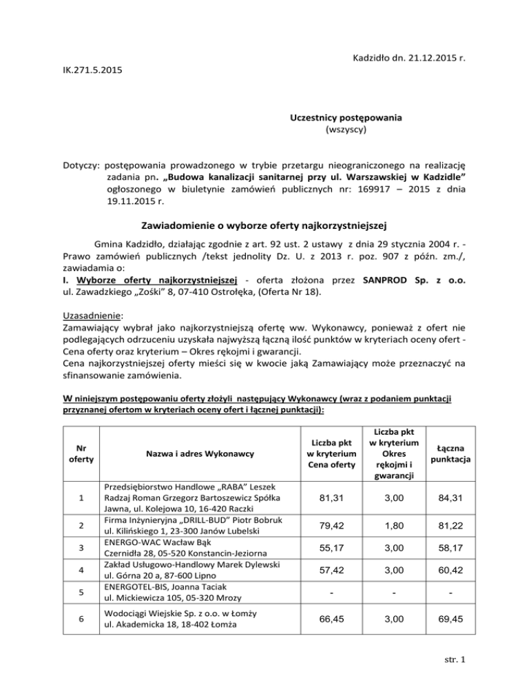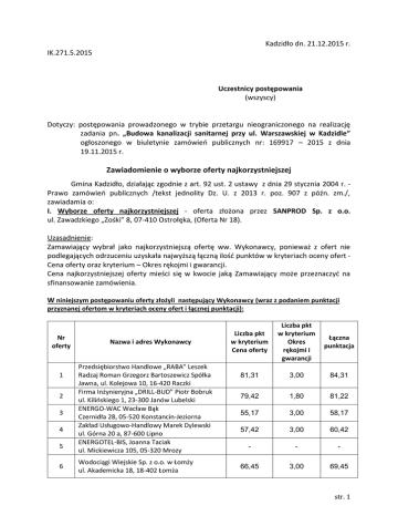 Kadzidło dn. 21.12.2015 r. IK.271.5.2015 Uczestnicy postępowania (wszyscy) Dotyczy: postępowania prowadzonego w trybie przetargu nieograniczonego na realizację zadania pn. „Budowa kanalizacji sanitarnej przy ul. Warszawskiej w Kadzidle” ogłoszonego w biuletynie zamówień publicznych nr: 169917 – 2015 z dnia 19.11.2015 r. Zawiadomienie o wyborze oferty najkorzystniejszej Gmina Kadzidło, działając zgodnie z art. 92 ust. 2 ustawy z dnia 29 stycznia 2004 r. Prawo zamówień publicznych /tekst jednolity Dz. U. z 2013 r. poz. 907 z późn. zm./, zawiadamia o: I. Wyborze oferty najkorzystniejszej - oferta złożona przez SANPROD Sp. z o.o. ul. Zawadzkiego „Zośki” 8, 07-410 Ostrołęka, (Oferta Nr 18). Uzasadnienie: Zamawiający wybrał jako najkorzystniejszą ofertę ww. Wykonawcy, ponieważ z ofert nie podlegających odrzuceniu uzyskała najwyższą łączną ilość punktów w kryteriach oceny ofert Cena oferty oraz kryterium – Okres rękojmi i gwarancji. Cena najkorzystniejszej oferty mieści się w kwocie jaką Zamawiający może przeznaczyć na sfinansowanie zamówienia. W niniejszym postępowaniu oferty złożyli następujący Wykonawcy (wraz z podaniem punktacji przyznanej ofertom w kryteriach oceny ofert i łącznej punktacji): Nr oferty 1 2 3 4 5 6 Nazwa i adres Wykonawcy Przedsiębiorstwo Handlowe „RABA” Leszek Radzaj Roman Grzegorz Bartoszewicz Spółka Jawna, ul. Kolejowa 10, 16-420 Raczki Firma Inżynieryjna „DRILL-BUD” Piotr Bobruk ul. Kilińskiego 1, 23-300 Janów Lubelski ENERGO-WAC Wacław Bąk Czernidła 28, 05-520 Konstancin-Jeziorna Zakład Usługowo-Handlowy Marek Dylewski ul. Górna 20 a, 87-600 Lipno ENERGOTEL-BIS, Joanna Taciak ul. Mickiewicza 105, 05-320 Mrozy Wodociągi Wiejskie Sp. z o.o. w Łomży ul. Akademicka 18, 18-402 Łomża Liczba pkt w kryterium Cena oferty Liczba pkt w kryterium Okres rękojmi i gwarancji Łączna punktacja 81,31 3,00 84,31 79,42 1,80 81,22 55,17 3,00 58,17 57,42 3,00 60,42 - - - 66,45 3,00 69,45 str. 1 7 8 9 10 11 12 13 14 15 16 17 18 19 20 21 Konsorcjum: Roboty Ziemne Mirosław Majka ul. Ks. J. Hanowskiego 26/3, 11-042 Jonkowo MSI TELEKOM Spółka z o.o. Spółka Komandytowa, ul. Kard. St. Wyszyńskiego 1B lok. 202, 10-457 Olsztyn Przedsiębiorstwo Zaopatrzenia Rolnictwa w Wodę „Wodrol-Olsztyn” w Dywitach Sp. z o.o. ul. Spółdzielcza 23, 11-001 Dywity Konsorcjum: Przedsiębiorstwo Instalacyjne „PRIM” Spółka Akcyjna, ul. Suwalska 84, 19-300 Ełk ELMO S.A., ul. Akacjowa 1, Żelków Kolonia, 08-110 Siedlce Przedsiębiorstwo Budowlane „BUDOMONT” Sp. z o.o., ul. Polna 3a, 37-100 Łańcut Zakład Projektowo Wykonawczy WOD-KAN, CO, Gazu „ART-HAUS” Artur Hausman ul. Okólna 33, 06-500 Mława IŁAWSKIE PRZEDSIĘBIORSTWO INSTALACYJNO – BUDOWLANE Sp. z o.o., ul. Usługowa 8, 14-200 Iława Przedsiębiorstwo Usługowo – Handlowe „WODMEL” Sp. z o.o., ul. Zambrowska 8, 18-200 Wysokie Mazowieckie Przedsiębiorstwo Inżynierii Sanitarnej „ENERGAS”s.c. Paweł i Andrzej Ochenkowscy, ul. Warszawska 2, 07-410 Ostrołęka JR-SANBUD Jarosław Radgowski ul. Olsztyńska 3, 05-825 Grodzisk Mazowiecki MK INSTAL Kowalczyk Mieczysław ul. Komisji Edukacji Narodowej 34, 07-410 Ostrołęka MULTI-KOM Andrzej Nakielski ul. Kolejowa 103, 07-410 Ostrołęka SANPROD Sp. z o.o. ul. Zawadzkiego „Zośki” 8, 07-410 Ostrołęka Konsorcjum: SERWIS TELEKOM Leszek Bartela Gościszewo 63b, 82-400 Sztum PRZEDSIĘBIORSTWO USŁUGOWE HYDROCOMPLEX s.c. Janusz Krakowiak, Paulina Wiejak ul. Łąkowa 15, 82-200 Malbork Zakład Instalacji Sanitarnych Mróz Spółka Jawna ul. Bohaterów Westerplatte 5, 07-410 Ostrołęka KRUSZ-BET S.C. Zakład Inżynieryjno-Budowlany Dariusz Kruszewski, Adam Chmieliński ul. Dobra 6, 06-500 Mława 80,38 1,80 82,18 74,52 3,00 77,52 76,92 1,80 78,72 60,21 3,00 63,21 86,41 3,00 89,41 83,67 3,00 86,67 54,27 3,00 57,27 93,91 3,00 96,91 85,31 3,00 88,31 74,11 2,40 76,51 96,26 3,00 99,26 97,00 3,00 100,00 76,66 3,00 79,66 70,76 3,00 73,76 - - - Podpisał: /-/ Dariusz Łukaszewski Wójt Gminy Kadzidło str. 2