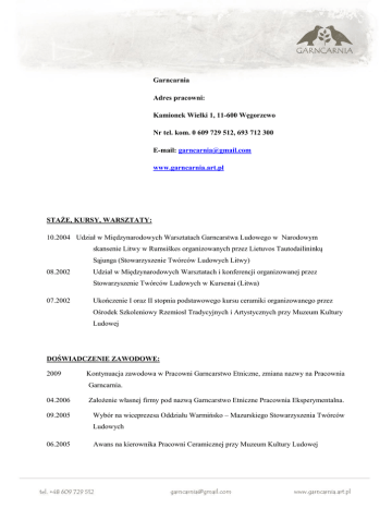 Garncarnia Adres pracowni: Kamionek Wielki 1, 11-600 Węgorzewo Nr tel. kom. 0 609 729 512, 693 712 300 E-mail: [email protected] www.garncarnia.art.pl STAŻE, KURSY, WARSZTATY: 10.2004 Udział w Międzynarodowych Warsztatach Garncarstwa Ludowego w Narodowym skansenie Litwy w Rumsińkes organizowanych przez Lietuvos Tautodailininkų Sąjunga (Stowarzyszenie Twórców Ludowych Litwy) 08.2002 Udział w Międzynarodowych Warsztatach i konferencji organizowanej przez Stowarzyszenie Twórców Ludowych w Kursenai (Litwa) 07.2002 Ukończenie I oraz II stopnia podstawowego kursu ceramiki organizowanego przez Ośrodek Szkoleniowy Rzemiosł Tradycyjnych i Artystycznych przy Muzeum Kultury Ludowej DOŚWIADCZENIE ZAWODOWE: 2009 Kontynuacja zawodowa w Pracowni Garncarstwo Etniczne, zmiana nazwy na Pracownia Garncarnia. 04.2006 Założenie własnej firmy pod nazwą Garncarstwo Etniczne Pracownia Eksperymentalna. 09.2005 Wybór na wiceprezesa Oddziału Warmińsko – Mazurskiego Stowarzyszenia Twórców Ludowych 06.2005 Awans na kierownika Pracowni Ceramicznej przy Muzeum Kultury Ludowej 03.2004 Przyjęcie do Stowarzyszenia Twórców Ludowych 03.2002 Zatrudnienie na stanowisku garncarza w Muzeum Kultury Ludowej w Węgorzewie od 2001 Organizacja własnej pracowni garncarskiej w Kamionku Wielkim WYSTAWY, NAGRODY, PLENERY, STYPENDIA: 04-09.2016 stypendium w zakresie twórczości artystycznej pt. Rekonstrukcja wybranego garnituru naczyń ceramicznych (stołowych i kuchennych) z terenu Warmii i Mazur powstałych na przestrzeni XVIII-XIX w., Urząd Marszałkowski Województwa WarmińskoMazurskiego, Departament Kultury, 16.05.2015 30.04.2016 Muzeum Okręgowe im. Leona Wyczółkowskiego w Bydgoszczy, miejsce ekspozycji Europejskie Centrum Pieniądza, wystawa pt. „Dzieje pieniądza. Średniowiecze”, wykonanie replik naczyń do karczmy średniowiecznej grudzień 2014 r. Muzeum Warmii i Mazur w Olsztynie, wystawa archeologiczna pt. „Nie tylko Stare Miasto. Pradzieje Olsztyna”, przygotowanie replik naczyń średniowiecznych 23.07.2014 wystawa w Muzeum in. Wojciecha Kętrzyńskiego w Kętrznie pt. „W średniowiecznej kuchni”, repliki użytkowe naczyń średniowiecznych. Projekt „W średniowiecznej kuchni – nowy produkt transgranicznej turystyki kulturowej” wdrażany w ramach Celu 3: Europejska Współpraca Terytorialna Program Współpracy Transgranicznej „Litwa-Polska”. Program współfinansowany z Europejskiego Funduszu Rozwoju Regionalnego. 12.06.2009 Wystawa autorskiej użytkowej ceramiki średniowiecznej w ramach Festiwalu ITA w Szamotułach 31-6.07.2008 Międzynarodowy Plener Garncarski w Dworze Zypliai, w Lukńiai, koło Ńakiai na Litwie 27-29.06.2008 Udział w XXXIV Jarmarku Garncarskim w Niemczech w mieście Bürgeler (Töpfermarkt - Bürgeler) 2-5.07.2007 Udział w plenerze ceramicznym organizowanym przez Stowarzyszenie Twórców Ludowych Litwy (Lietuvos Tautodailininku Sajungos Kauno Bendrija) 4.05.2007 Nagroda w VIII Regionalnej Wystawie Rękodzieła Artystycznego „Po warmińskomazurskiej ziemi” Kętrzyn 2007 (Kętrzyńskie Centrum Kultury) 09.2006 Udział w XXXVI Dorocznej Wystawie Sztuki Ludowej i Rzemiosła w Węgorzewie 09.2005 Udział w XXXV Dorocznej Wystawie Sztuki Ludowej i Rzemiosła w Węgorzewie 09.2004 Udział w XXXIV Dorocznej Wystawie Sztuki Ludowej i Rzemiosła w Węgorzewie 09.2004 Udział w Ogólnopolskiej pokonkursowej wystawie „A to Polska właśnie” o organizowanej przez Zarząd Główny STL w Lublinie 11.2003 Udział w IV Regionalnej Wystawie Rękodzieła Artystycznego w Kętrzynie 09.2003 Udział w Międzynarodowych Targach Turystycznych w Berlinie 09.2003 Udział w XXXIII Dorocznej Wystawie Sztuki Ludowej i Rzemiosła w Węgorzewie 11.2002 Nagroda w III Regionalnej Wystawie Rękodzieła Artystycznego w Kętrzynie 09.2002 Udział w XXXII Dorocznej Wystawie Sztuki Ludowej i Rzemiosła w Węgorzewie PROWADZENIE AUTORSKICH WARSZTATÓW, KURSÓW FESTYNY, WYDARZENIA, PROJEKTY: 17.09.2016 Targi Chłopskie w Muzeum Budownictwa Ludowego w Olsztynku 10.09.2016 Codzienność w podolsztyńskiej pruskiej XV-wiecznej wsi, projekt realizowany przez Towarzystwo Naukowe Pruthenia. Warsztat garncarski, lanie świec. 25-26.08.2016 Grodzisko Żmijowiska, Muzeum Nadwiślańskie w Kazimierzu Dolnym, Warsztaty Archeologii Doświadczalnej, spotkanie rekonstruktorów wczesnośredniowiecznego garncarstwa 15.08.2016 Regionalne Święto Ziół w Muzeum Budownictwa Ludowego w Olsztynku. 13.08.2016 Reszel, Festyn Średniowieczny organizowany przez Mrągowskie Stowarzyszenie GALINDIA. Warsztat garncarski i pokaz kuchni średniowiecznej z przewoźnym piecem taborowym do wypieku chleba. 6-7.08.2016, XXXIX Jarmark Folkloru w Węgorzewie, organizowany przez Muzeum Kultury Ludowej w Węgorzewie. Stanowisko Garncarni zajęło I miejsce w Konkursie na najładniejsze stanowisko wystawiennicze. 3.08.2016 warsztaty garncarskie w świetlicy w Sińcu w ramach realizacji projektu zajęć wakacyjnych dla dzieci z terenów wiejskich, przez Stowarzyszenie Rozwoju Sołectwa Siniec „Blusztyn”. 08-11.2016 realizacja projektu pn.: „Starszy czy młodszy, chłopak czy dziewczyna ….- warsztaty międzypokoleniowe” dofinansowanego ze środków Rządowego Programu na rzecz Aktywności Społecznej Osób Starszych na lata 2014-2020 Ministerstwa Rodziny, Pracy i Polityki Społecznej, realizowanego przez Stowarzyszenie Przyjaciół Szkoły Podstawowej w Dąbrównie „Nasze Dzieci”. Warsztaty garncarskie, wyposażenie i aranżacja pracowni garncarskiej. 30-31.07.2016 Gniezno, wydarzenie pt. Chrzest Polski i Koronacja Królewska, rekonstrukcje historyczne w okresu wczesnego średniowiecza. Przeprowadzone pokazy: Poznawanie smaków średniowiecza – warsztaty kulinarne; Warsztaty i prezentacja historycznych kół garncarskich; Światło w średniowiecznym domu – produkcja świec i prezentacja różnych technik niecenia ognia 24-26.07.2016 Jarmark Jakubowy w Kętrzynie, organizowany przez Muzeum im.