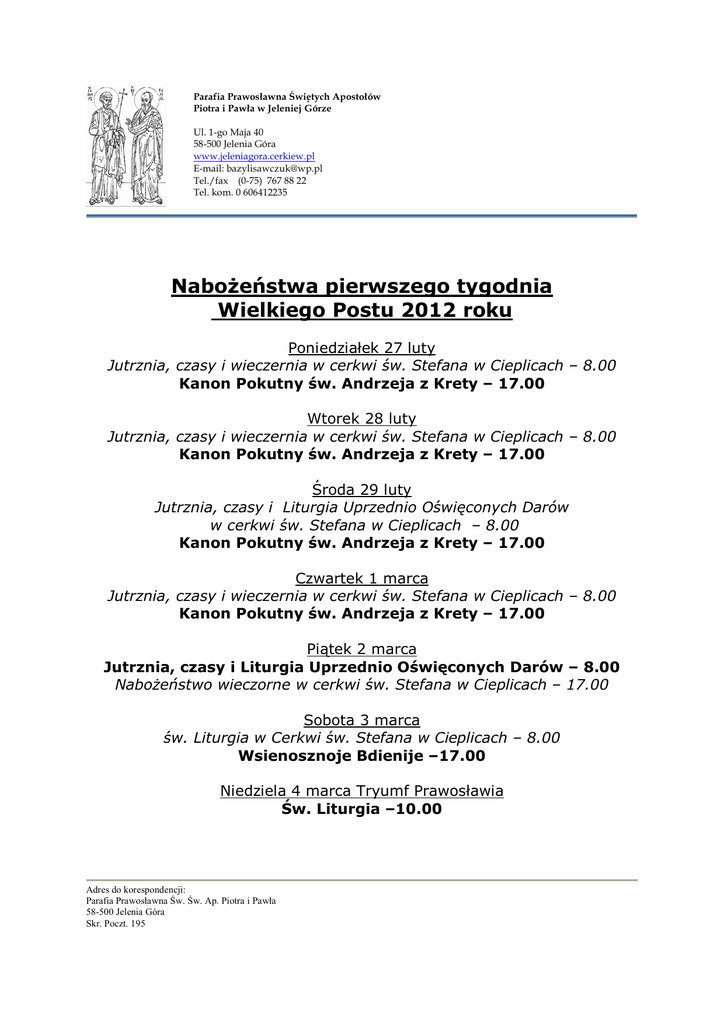 Parafia Prawosławna Świętych Apostołów Piotra i Pawła w Jeleniej Górze Ul. 1-go Maja 40 58-500 Jelenia Góra www.jeleniagora.cerkiew.pl E-mail: [email protected] Tel./fax (0-75) 767 88 22 Tel. kom. 0 606412235 Nabożeństwa pierwszego tygodnia Wielkiego Postu 2012 roku Poniedziałek 27 luty Jutrznia, czasy i wieczernia w cerkwi św. Stefana w Cieplicach – 8.00 Kanon Pokutny św. Andrzeja z Krety – 17.00 Wtorek 28 luty Jutrznia, czasy i wieczernia w cerkwi św. Stefana w Cieplicach – 8.00 Kanon Pokutny św. Andrzeja z Krety – 17.00 Środa 29 luty Jutrznia, czasy i Liturgia Uprzednio Oświęconych Darów w cerkwi św. Stefana w Cieplicach – 8.00 Kanon Pokutny św. Andrzeja z Krety – 17.00 Czwartek 1 marca Jutrznia, czasy i wieczernia w cerkwi św. Stefana w Cieplicach – 8.00 Kanon Pokutny św. Andrzeja z Krety – 17.00 Piątek 2 marca Jutrznia, czasy i Liturgia Uprzednio Oświęconych Darów – 8.00 Nabożeństwo wieczorne w cerkwi św. Stefana w Cieplicach – 17.00 Sobota 3 marca św. Liturgia w Cerkwi św. Stefana w Cieplicach – 8.00 Wsienosznoje Bdienije –17.00 Niedziela 4 marca Tryumf Prawosławia Św. Liturgia –10.00 Adres do korespondencji: Parafia Prawosławna Św. Św. Ap. Piotra i Pawła 58-500 Jelenia Góra Skr. Poczt. 195 Parafia Prawosławna Świętych Apostołów Piotra i Pawła w Jeleniej Górze Ul. 1-go Maja 40 58-500 Jelenia Góra www.jeleniagora.cerkiew.pl E-mail: [email protected] Tel./fax (0-75) 767 88 22 Tel. kom. 0 606412235 Nabożeństwa drugiego i trzeciego tygodnia Wielkiego Postu 2012 roku Środa 7 marca Czasy i Liturgia Uprzednio Oświęconych Darów w cerkwi św. Stefana w Cieplicach – 7.30 Czwartek 8 marca Świętego Jana Chrzciciela Czasy i Liturgia Uprzednio Oświęconych Darów – 7.30 Piątek 9 marca Czasy i Liturgia Uprzednio Oświęconych Darów – 7.30 Nabożeństwo wieczorne w cerkwi św. Stefana w Cieplicach – 17.00 Sobota 10 marca Modlitwa za zmarłych św. Liturgia w Cerkwi św. Stefana w Cieplicach – 8.00 Wsienosznoje Bdienije –17.00 Niedziela 11 marca Świętego Grzegorza Palamasa Św. Liturgia –10.00 Środa 14 marca Czasy i Liturgia Uprzednio Oświęconych Darów w cerkwi św. Stefana w Cieplicach – 7.30 Piątek 16 marca Czasy i Liturgia Uprzednio Oświęconych Darów – 7.30 Nabożeństwo wieczorne w cerkwi św. Stefana w Cieplicach – 17.00 Sobota 17 marca Modlitwa za zmarłych św. Liturgia w Cerkwi św. Stefana w Cieplicach – 8.00 Wsienosznoje Bdienije –17.00 Niedziela 18 marca Adoracji Krzyża Pańskiego Św. Liturgia –10.00 Adres do korespondencji: Parafia Prawosławna Św. Św. Ap. Piotra i Pawła 58-500 Jelenia Góra Skr. Poczt. 195