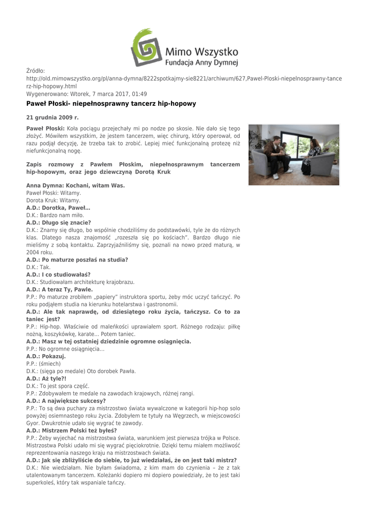 Źródło: http://old.mimowszystko.org/pl/anna-dymna/8222spotkajmy-sie8221/archiwum/627,Pawel-Ploski-niepelnosprawny-tance rz-hip-hopowy.html Wygenerowano: Wtorek, 7 marca 2017, 01:49 Paweł Płoski- niepełnosprawny tancerz hip-hopowy 21 grudnia 2009 r. Paweł Płoski: Koła pociągu przejechały mi po nodze po skosie. Nie dało się tego złożyć. Mówiłem wszystkim, że jestem tancerzem, więc chirurg, który operował, od razu podjął decyzję, że trzeba tak to zrobić. Lepiej mieć funkcjonalną protezę niż niefunkcjonalną nogę. Zapis rozmowy z Pawłem Płoskim, niepełnosprawnym hip-hopowym, oraz jego dziewczyną Dorotą Kruk tancerzem Anna Dymna: Kochani, witam Was. Paweł Płoski: Witamy. Dorota Kruk: Witamy. A.D.: Dorotka, Paweł… D.K.: Bardzo nam miło. A.D.: Długo się znacie? D.K.: Znamy się długo, bo wspólnie chodziliśmy do podstawówki, tyle że do różnych klas. Dlatego nasza znajomość „rozeszła się po kościach”. Bardzo długo nie mieliśmy z sobą kontaktu. Zaprzyjaźniliśmy się, poznali na nowo przed maturą, w 2004 roku. A.D.: Po maturze poszłaś na studia? D.K.: Tak. A.D.: I co studiowałaś? D.K.: Studiowałam architekturę krajobrazu. A.D.: A teraz Ty, Pawle. P.P.: Po maturze zrobiłem „papiery” instruktora sportu, żeby móc uczyć tańczyć. Po roku podjąłem studia na kierunku hotelarstwa i gastronomii. A.D.: Ale tak naprawdę, od dziesiątego roku życia, tańczysz. Co to za taniec jest? P.P.: Hip-hop. Właściwie od maleńkości uprawiałem sport. Różnego rodzaju: piłkę nożną, koszykówkę, karate… Potem taniec. A.D.: Masz w tej ostatniej dziedzinie ogromne osiągnięcia. P.P.: No ogromne osiągnięcia… A.D.: Pokazuj. P.P.: (śmiech) D.K.: (sięga po medale) Oto dorobek Pawła. A.D.: Aż tyle?! D.K.: To jest spora część. P.P.: Zdobywałem te medale na zawodach krajowych, różnej rangi. A.D.: A największe sukcesy? P.P.: To są dwa puchary za mistrzostwo świata wywalczone w kategorii hip-hop solo powyżej osiemnastego roku życia. Zdobyłem te tytuły na Węgrzech, w miejscowości Gyor. Dwukrotnie udało się wygrać te zawody. A.D.: Mistrzem Polski też byłeś? P.P.: Żeby wyjechać na mistrzostwa świata, warunkiem jest pierwsza trójka w Polsce. Mistrzostwa Polski udało mi się wygrać pięciokrotnie. Dzięki temu miałem możliwość reprezentowania naszego kraju na mistrzostwach świata. A.D.: Jak się zbliżyliście do siebie, to już wiedziałaś, że on jest taki mistrz? D.K.: Nie wiedziałam. Nie byłam świadoma, z kim mam do czynienia – że z tak utalentowanym tancerzem. Koleżanki dopiero mi dopiero powiedziały, że to jest taki superkoleś, który tak wspaniale tańczy. A.D.: Kiedy go poznałaś, był na świecie czterdziesty drugi. Rok później – pierwszy. D.K.: Tak. A.D.: Masz więc jakąś niezwykłą moc. D.K.: Staram się Pawła motywować. A.D.: Jesteście radośni, weseli. Czego Wam brakuje? D.K.: Mnie niczego nie brakuje (śmiech) P.P.: Mnie również. Bardzo serdecznie dziękuję za zaproszenie do programu. A.D.: Wszystko masz takie zwyczajne, Pawle, jak każdy człowiek? P.P.: Może nie do końca (śmiech). Jestem szczęśliwym posiadaczem takiej protezki (prezentuje protezę nogi). A.D.: Przecież się z tym nie urodziłeś. P.P.: No nie... Tak się zdarzyło, że był wypadek. Wpadłem pod pociąg we Wrocławiu. No i tak się to skończyło. Jest to stopa wytworzona w Stanach Zjednoczonych dla żołnierzy, którzy stracili nogi, głównie w Iraku. Z tą oto stopą wracają do czynnej służby wojskowej. To o czymś świadczy. A.D.: Ale Ty się z nią nie urodziłeś ani jej od kosmitów nie dostałeś. Coś więc w Twoim życiu musiało się wydarzyć. P.P.: Tak się wydarzyło, że 2 lutego 2007 roku wracałem z Głogowa, gdzie prowadziłem warsztaty taneczne. We Wrocławiu miałem przesiadkę. Pociąg do Warszawy, w który miałem wsiąść, już ruszył. Zdążyłem do niego dobiec, otworzyć drzwi. Miałem jednak ciężką torbę i to ona wciągnęła mnie pod pociąg. No i tak… A.D.: To był ostatni wagon? P.P.: Nie, to było gdzieś na środku pociągu. Koła pociągu przejechały mi po nodze po skosie. Nie dało się tego złożyć. Mówiłem wszystkim, że jestem tancerzem, więc chirurg, który operował, od razu podjął decyzję, że trzeba tak to zrobić. Lepiej mieć funkcjonalną protezę niż niefunkcjonalną nogę. A.D.: Pociąg zatrzymał się? Co się działo? P.P.: Pociąg odjechał i to też duże szczęście. W momencie, gdyby się zatrzymał, mógłbym zostać oskarżony o nieumyślne spowodowanie zagrożenia dla pasażerów. Na dworcu było jednak sporo osób, które przybiegły mi z pomocą. A.D.: Widział ktoś to zajście? P.P.: Samego zajścia chyba nikt. D.K.: Nikt. Dopiero później, kiedy Paweł wyczołgiwał się na peron, ludzie zauważyli jego białą czapkę. A.D.: Krzyczałeś? P.P.: Ten peron jest dosyć wysoki. Zanim zacząłem krzyczeć, na prawej nodze się podniosłem, wczołgałem na peron, przepełznąłem trochę i dopiero wtedy zawołałem: „Pomocy! Ratunku! Pali się!”. Od małego byłem uczony, że jak krzyczy się „Pomocy!”, to ludzie nie zawsze reagują. Na okrzyk „Pożar!” reagują inaczej, zwracają uwagę. A.D.: Nie straciłeś przytomności? P.P.: Cały czas byłem przytomny. To też duże szczęście, bo sam mogłem zdjąć pasek od spodni i obwiązać nogę, żeby się nie wykrwawić. Ktoś dociskał, żeby było mocniej. Kilka osób brało ubrania, żeby zatamować krew. Ktoś dzwonił po karetkę. Paru ludzi było przy mnie, żeby ze mną rozmawiać, bym nie stracił przytomności. Potem zabrała mnie karetka. Zawieziono mnie prosto na blok operacyjny. Tam też byłem świadomy. Dopiero kiedy wszystko popodpisywałem, wyraziłem zgodę na operację, usłyszałem: „Do zobaczenia, kiedy się obudzisz”. I tyle. A.D.: Strasznie przytomnym człowiekiem jesteś. Pamiętałeś, mówiłeś… P.P.: A co innego robić? 