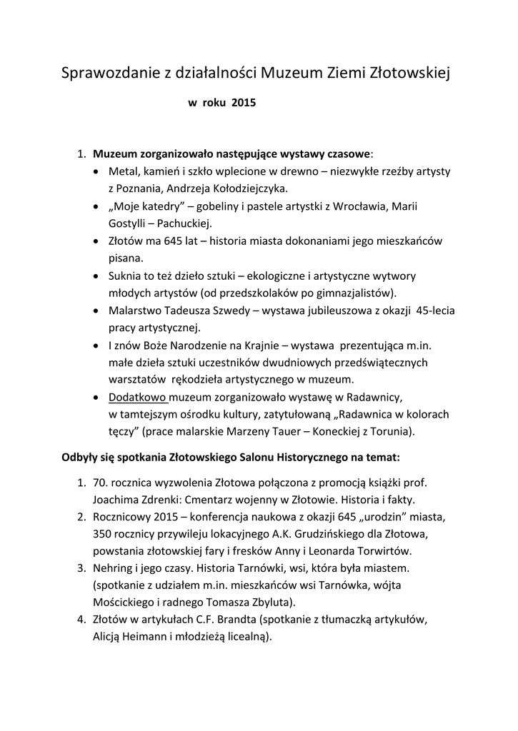 Sprawozdanie z działalności Muzeum Ziemi Złotowskiej w roku 2015 1. Muzeum zorganizowało następujące wystawy czasowe:  Metal, kamień i szkło wplecione w drewno – niezwykłe rzeźby artysty z Poznania, Andrzeja Kołodziejczyka.  „Moje katedry” – gobeliny i pastele artystki z Wrocławia, Marii Gostylli – Pachuckiej.  Złotów ma 645 lat – historia miasta dokonaniami jego mieszkańców pisana.  Suknia to też dzieło sztuki – ekologiczne i artystyczne wytwory młodych artystów (od przedszkolaków po gimnazjalistów).  Malarstwo Tadeusza Szwedy – wystawa jubileuszowa z okazji 45-lecia pracy artystycznej.  I znów Boże Narodzenie na Krajnie – wystawa prezentująca m.in. małe dzieła sztuki uczestników dwudniowych przedświątecznych warsztatów rękodzieła artystycznego w muzeum.  Dodatkowo muzeum zorganizowało wystawę w Radawnicy, w tamtejszym ośrodku kultury, zatytułowaną „Radawnica w kolorach tęczy” (prace malarskie Marzeny Tauer – Koneckiej z Torunia). Odbyły się spotkania Złotowskiego Salonu Historycznego na temat: 1. 70. rocznica wyzwolenia Złotowa połączona z promocją książki prof. Joachima Zdrenki: Cmentarz wojenny w Złotowie. Historia i fakty. 2. Rocznicowy 2015 – konferencja naukowa z okazji 645 „urodzin” miasta, 350 rocznicy przywileju lokacyjnego A.K. Grudzińskiego dla Złotowa, powstania złotowskiej fary i fresków Anny i Leonarda Torwirtów. 3. Nehring i jego czasy. Historia Tarnówki, wsi, która była miastem. (spotkanie z udziałem m.in. mieszkańców wsi Tarnówka, wójta Mościckiego i radnego Tomasza Zbyluta). 4. Złotów w artykułach C.F. Brandta (spotkanie z tłumaczką artykułów, Alicją Heimann i młodzieżą licealną). 5. 25 lat samorządu w Złotowie (prezentacja historii ostatniego ćwierćwiecza zatytułowana „Ja. Ty. My= Samorząd. 25 lat gminy miasta Złotów”) Muzeum wydało trzy publikacje: 1. Cmentarz wojenny w Złotowie. 2. Złotów na Krajnie. 3. Złotów nasz i wasz, część I, wydanie II oraz nagraliśmy dwie audycje historyczne w ramach cyklu Tajemnice Piły (o feldmarszałku Blucherze oraz o Janie Kociku i powojennym Złotowie). Ponadto muzeum zleciło konserwację:  obrazu olejnego o tematyce sakralnej „Trójca św.” z XVIII wieku, (70cm x 138cm)  obrazu olejnego „Panorama Złotowa” z 1953 roku Tadeusza Sypniewskiego (130 cm x 200 cm). Prace konserwatorskie w/w dzieł sztuki zostały wykonane w terminie. Muzeum odzyskało też część najbardziej atrakcyjnych eksponatów przekazanych do skansenu w Osieku w latach 90-tych XX wieku i we własnym zakresie je naprawia, konserwuje, poddaje renowacji. Również we własnym zakresie muzeum wykonało prace remontowe przy elewacji budynku od strony ulicy. Zwiedzających ogółem – 4228 ( w tym młodzież szkolna – 702, pozostali – 1107, zwiedzający bezpłatnie – 1804, uczestnicy wydarzeń muzealnych typu Noc Muzeów – 615). Lekcje muzealne – 64. Plan pracy Muzeum Ziemi Złotowskiej na rok 2016 (pierwsze półrocze) Wystawy czasowe: 1. Broń i barwa Wojska Polskiego 1939-1945 (ze zbiorów Muzeum Okręgowego w Pile i własnych). 2. Kraina w kratkę, czyli pejzaż szachulcowy (nie tylko na Krajnie) – prace w technice collage Grety Grabowskiej z Koszalina. 3. Ozdoby z brązu z IX/VIII wieku p.n.e. – ozdobą złotowskiego muzeum (Archeologiczny skarb z Okonka na tle wystawy fotograficznej Barbary Chodery „Moja Złotowszczyzna”). 4. Znam swoje miasto – wystawa komiksowa – spacer po Złotowie. Złotowski Salon Historyczny: 1. O Krajnie Złotowskiej i wybitnych ludziach Złotowszczyzny – w świetle kolejnych publikacji (Krystyna Nita z Krakowa, laureatka konkursu historycznego, autorka pracy „Moje Piecewo”; prof. J. Kęcińska i Roman Rożeński o książce „Jan Rożeński”) 2. Archeologia w prasie dawnej prowincji Grenzmark Posen – Westpreussen na podstawie książki prof. Andrzeja Kokowskiego „Na tropie zaginionych odkryć”. 3. Czy ks. dr Bolesław Domański zechce usiąść na ławeczce w Złotowie? 4. Film Leszka Sawickiego „Gra w butelkę” w ocenie twórców (aktorów). Historia hotelu Lamberz w Złotowie. Plany inwestycyjne: 1. Konserwacja czterech sztandarów (trzy przedwojenne, jeden z 1947 roku). 2. Zakup gablot na przyjęcie archeologicznego skarbu z Okonka. Plany wydawnicze: 1. Przewodnik po Złotowie – dla dzieci i nie tylko. („Złotów krok po kroku”/ „Złotów na zwiedzanie gotów”). 2. „Smaki Krajny” – wydanie II poprawione i uzupełnione.