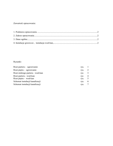 Zawartość opracowania: 1. Podstawa opracowania. .........................................................................................................2 2. Zakres opracowania...............................................................................................................2 3. Dane ogólne...........................................................................................................................2 4. Instalacje grzewcze , instalacja wod-kan,.............................................................................2 Rysunki: Rzut parteru - ogrzewanie Rzut piętra - ogrzewanie Rzut niskiego parteru - wod-kan Rzut parteru - wod-kan Rzut piętra - wod-kan Schemat instalacji kanalizacji Schemat instalacji kanalizacji rys. rys. rys rys rys. rys. rys. 1 2 3 4 5 6 7 OPIS TECHNICZNY Adaptacji ogrzewania i instalacji wod-kan dla przebudowy oddziału rehabilitacji na oddział chirurgii. 1. Podstawa opracowania. - - zlecenie Inwestora inwentaryzacja dla potrzeb projektowych podkłady architektoniczno-budowlane technologia Rozporządzenie Ministra zdrowia w sprawie wymagań jakim powinny odpowiadać pod względem fachowym i sanitarnym pomieszczenia i urządzenia zakładu opieki zdrowotnej obowiązujące normy i normatywy techniczne. 2. Zakres opracowania Niniejsze opracowanie obejmuje projekt przystosowania instalacji grzewczej, oraz wodnokanalizacyjnej, dla pomieszczeń adaptowanych na oddział chirurgii. 3. Dane ogólne Oddział chirurgii zostanie zlokalizowany na kondygnacji wysokiego parteru . Obecnie pomieszczenia posiadają instalacje grzewcze oraz wodno-kanalizacyjne, które zostaną zaadaptowane do nowych rozwiązań funkcjonalo-użytkowych. 4. Instalacje grzewcze , instalacja wod-kan, Instalacje grzewcze Dla pomieszczeń projektuje się wymianę grzejników z istniejących żeliwnych (członowych) na płytowe w wykonaniu higienicznym np. Cosmo-Nova. Grzejniki podłączyć gałązkami do istniejących pionów c.o , na zasilaniu zainstalować zawory termostatyczne z głowicami f-my Danfoss oraz na powrocie zawory odcinające typ RLV DN-15 mm. Instalację wykonać jako krytą , piony jak i gałązki należy wkuć w ściany, natomiast instalację rozdzielczą zabudować. Gałązki należy wykonać z rur stalowych instalacyjnych wg. PN-74/H-74200, ze szwem, typu S czarnych, ze stali gatunku 10 BX, łączonych przez spawanie. Nowe podejścia do grzejników wykonać przewodami polietylenowymi evalPex wg technologii Wirsbo łączonymi metodą Quick&Easy lub polipropylenowymi Boryszew łączonymi poprzez zgrzewanie. Istniejące przewody C.O zbezpieczyć ciepłochronnie izolacją Thermaflex o grubościach: Przewody DN 15-25 mm izolacja grubości 20 mm. Przewody w przegrodach budowlanych grubość izolacji 6 mm. Próby i płukanie. Instalację po zmontowaniu należy oczyścić z rdzy i zgorzeliny przez szczotkowanie i zabezpieczyć antykorozyjnie farbą Cekor. Instalację C.O należy przepłukać wodą z prędkością min 1.5m/s oraz poddać próbie ciśnieniowej na 0.6 MPa. Próbę na gorąco należy przeprowadzić na ciśnienie robocze. Zapotrzebowanie ciepła : Qco=37,7 kW - Instalacja zimnej wody, ciepłej wody i kanalizacji Instalacja zimnej i ciepłej wody Instalację wewnętrzną wody zimnej i ciepłej prowadzi się od istniejących pionów do nowoprojektowanych przyborów. Instalacja wody ciepłej zostanie rozprowadzona przewodami polipropylenowymi PN 20 z wkładką aluminiową Stabi firmy Boryszew. Instalacja wody zimnej z uwagi na hydranty wykonać w technologii rur stalowych podwójnie ocynkowanych. Na instalacji stosować zawory odcinające kulowe wodociągowe na PN 1,0 MPa oraz zawory antyskażeniowe, na każdym zaworze czerpalnym ze złączką na wąż. Instalację z.w i c.w poddać próbie ciśnieniowej na 0,9 MPa. Po próbach instalację należy przepłukać i zdezynfekować roztworem podchlorynu sodu o stężeniu 10 mg C1/1. Przewody zaizolować ciepłochronnie Termaflexem gr 13 mm. UWAGA: Instalację p.poż do hydrantu wykonać z rur stalowych podwójnie ocynkowanych. Hydrant HP-25 z wężem półsztywnym. Instalacja kanalizacji sanitarnej Remont instalacji wod-kan polega na zaadoptowaniu istniejących pionów kanalizacji sanitarnej do nowej funkcji pomieszczeń. Na kondygnacji wysokiego parteru należy wykonać piony o średnicy Ks-110 mm , oraz wykonać odpowietrzenia ponad dach budynku. Podejścia do przyborów wykonane na niższej kondygnacji należy zabudować. Wyposażenie : biały montaż – Koło , zlewozmywaki KO Franki, armatura Oras – KliwiaDelabie. Projektuje się nowe podejścia do przyborów sanitarnych z rur PVC Wawin od istniejących pionów kanalizacyjnych . Przewody winny być schowane w bruzdy ścienne , bądź zakryte. Podejścia wykonać z przewodów PVC według technologii Wavin. Średnice pionów i podejść oraz spadki wykonać zgodnie z PN-92/B-01707. Wykonaną instalację należy poddać próbie szczelności. Uwagi: - instalację z rur Wavin wykonać w oparciu o instrukcję tego systemu. stosować materiały i urządzenia posiadające atesty instalacje należy wykonać zgodnie z obowiązującymi przepisami i normami oraz przy spełnieniu wymogów określonych w „Warunkach technicznych wykonania i odbioru robót budowlano-montażowych”
