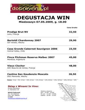 DEGUSTACJA WIN Miedzeszyn 07.05.2009, g. 18.00 Cena brutto Prodige Brut NV 32,50 Loire, Francja Bertoldi Chardonnay 2007 29,90 IGT Veneto, Włochy Casa Grande Cabernet Sauvignon 2006 23,50 Central Valley, Chile Finca Flichman Reserva Malbec 2007 45,00 Mendoza, Argentyna Vieux Clocher 48,00 AOC Beaume de Venise, Francja Cantine San Gaudenzio Moscato 26,50 DOC Piemonte, Włochy Rabaty: 6 but. – 5%, 12 but. – 10%, 24 but. – 11%, 36 but. – 12%, 60 but. – 14%, 120 but. – 16%, 240 but. – 18% Sklep z Winami In Vino: 04-844 Warszawa ul. Patriotów 110 Witold Falkowski tel.: 22 3322110 kom: 601 396020 e-mail: [email protected] Godziny otwarcia pon - 14:00 - 19:00, wt.-pt. - 11:00 - 19:00, sobota - 10:00 - 15:00.