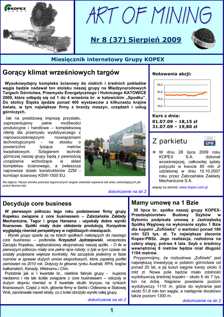 Nr 8 (37) Sierpień 2009 Miesięcznik internetowy Grupy KOPEX Gorący klimat wrześniowych targów Notowania akcji: Wysokowydajny kompleks ścianowy do niskich i średnich pokładów węgla będzie nadawał ton stoisku naszej grupy na Międzynarodowych Targach Górnictwa, Przemysłu Energetycznego i Hutniczego KATOWICE 2009, które odbędą się od 1 do 4 września br. w katowickim „Spodku”. Do stolicy Śląska zjedzie ponad 400 wystawców z kilkunastu krajów świata, w tym największe firmy z branży maszyn, urządzeń i usług górniczych. Jak na prestiżową imprezę przystało, zaprezentujemy pełne możliwości produkcyjne i handlowe – kompleksową ofertę dla przemysłu wydobywczego z najnowocześniejszymi rozwiązaniami technologicznymi - na stoisku o powierzchni tysiąca metrów kwadratowych. Szlagierem techniki górniczej naszej grupy będą z pewnością urządzenia wchodzące w skład kompleksu ścianowego, a zwłaszcza najnowsze dzieło konstruktorów ZZM kombajn ścianowy KSW-1500 EU. 25,0 20,0 15,0 10,0 Kurs z dnia: 01.07.09 – 18,15 zł 31.07.09 – 19,80 zł Z parkietu Na zdjęciu: Nasze stoisko podczas tegorocznych targów odwiedzi zapewne tak wielu zwiedzających jak przed dwoma laty dokończenie na str.2 W dniu 28 lipca 2009 roku KOPEX S.A. dokonał wcześniejszej, całkowitej spłaty pożyczki w kwocie 85 mln zł udzielonej w dniu 10.10.2007 roku przez Zabrzańskie Zakłady Mechaniczne S.A. więcej na stronie: www.kopex.com.pl Decyduje core business Mamy umowę na 1 Bzie W pierwszym półroczu tego roku podstawowe firmy grupy Kopeksu związane z core businessem – Zabrzańskie Zakłady Mechaniczne, Tagor i grupa Hansena - uzyskały dobre wyniki finansowe. Spółki miały duże obłożenie produkcją. Korzystnie wyglądają również perspektywy w najbliższych miesiącach. - Wyniki grupy oparte są na trzech spółkach należących do naszego core businessu – podkreśla Krzysztof Jędrzejewski, wiceprezes Zarządu Kopeksu, większościowy akcjonariusz naszej spółki. - O ile w pierwszym półroczu miały one pełne ręce roboty, o tyle w tym czasie nie zostały podpisane większe kontrakty. Na szczęście jesteśmy w fazie rozmów w sprawie dużych umów eksportowych, które zapełnią portfel zamówień na 2010 rok. Dotyczy to głównie rynku Australii, RPA, krajów bałkańskich, Kanady, Wietnamu i Chin. Podobnie jak w I kwartale br., niektóre fabryki grupy - kupione niedawno i nie tak ściśle związane z core businessem – odczuły w dużym stopniu również w II kwartale skutki kryzysu na rynkach finansowych. Część z nich, głównie firmy w Serbii i Odlewnia w Stalowej Woli, zanotowała nawet straty, co z kolei obniżyło wyniki całej grupy. 30 lipca br. spółka naszej grupy KOPEXPrzedsiębiorstwo Budowy Szybów w Bytomiu podpisała umowę z Jastrzębską Spółką Węglową na wykonanie szybu 1 Bzie dla kopalni „Zofiówka” o wartości ponad 180 mln 523 tys. zł. To największe zlecenie Kopex-PBSz. Jego realizacja, rozłożona na cztery etapy, potrwa 4 lata. Szyb o średnicy wewnętrznej 8 metrów będzie miał długość 1164 metrów. Przypomnijmy, że rozbudowa „Zofiówki” jest największą inwestycją w polskim górnictwie od ponad 20 lat, a jej koszt sięgnie kwoty około 3 mld zł. Nowe pole będzie miało zdolność wydobywczą średniej kopalni - około 6 do 7 tys. ton na dobę. Najpierw powstanie poziom wydobywczy 1110 m, gdzie do wybrania jest około 51,8 mln ton węgla, a następnie docelowo także poziom 1300 m. dokończenie na str.2 dokończenie na str.2 1 Miesięcznik internetowy Grupy KOPEX dokończenie ze str. 1 dokończenie ze str. 1 Gorący klimat wrześniowych targów Decyduje core business To najnowszej generacji maszyna z elektrycznym napędem posuwu przeznaczona do dwukierunkowego urabiania i ładowania urobku w ścianach o dużych nachyleniach: poprzecznym do 20 stopni i podłużnym do 35 stopni. Obsługa może sterować nią lokalnie z pulpitów i zespołu napędowo-sterującego oraz zdalnie przez radio. Kombajn wyposażony jest w system pozycjonowania w ścianie oraz układ tzw. skrawu kontrolnego. Możliwość przesyłania sygnału bezpośrednio do dyspozytorni ZZM pozwala na stałe monitorowanie i diagnozowanie pracy w ścianie, dzięki czemu służby serwisowe ZZM mają możliwość wcześniejszego wykrywania nieprawidłowości i przeciwdziałania awariom. Kombajn jest tak skonstruowany, że radzić sobie powinien w najtrudniejszych warunkach eksploatacyjnych. Wchodzić będzie w skład kompleksów ścianowych o dużej wydajności wydobycia, na które składać się będą sekcje zmechanizowanych obudów Tagoru, wyposażone w stojaki hydrauliczne wykonane w unikalnej technologii DURACHROM. Na stoisku prezentowane będą obudowy, jakie pracują w górnictwie Rosji i Chin. Trzecim elementem kompleksu będzie nowy przenośnik ścianowy TAGOR-3/1100 oraz urządzenia do elektrycznego podłączenia ściany pochodzące z firmy Elgór+Hansen. Zainteresowanie specjalistów wzbudzi zapewne oferta energoelektryki i elektroniki dla górnictwa. Do obejrzenia będą m. in. ognioszczelne stacje transformatorowe, zestaw manewrowy i wyłącznik stycznikowy Elgór+Hansena. Tyski ZEG zademonstruje agregat kogeneracyjny wytwarzający energię elektryczną z metanu. Wałbrzyski Wamag pokaże przesiewacz wibracyjny WE2 do pracy w instalacjach wzbogacania węgla kamiennego oraz odwadniarkę Nael 1,1, przeznaczoną na eksport. Modele sprzętu dla górnictwa odkrywkowego: gąsienicowe urządzenie przerzutowo-zwałujące GUPZ-9400.210, koparkę KWK-1400 i zwałowarkę ZGOT-8000.100 przedstawi Kopex-FAMAGO. Stoisko naszej grupy na terenach otwartych „Spodka” - 05/S4 tak, jak podczas poprzednich edycji targów, zwracać będzie uwagę szykowną aranżacją architektoniczną. Będzie sporo miejsca do spotkań, prowadzenia rozmów biznesowych, przyjmowania gości i zwiedzających. Już serdecznie zapraszamy! Uroczyste otwarcie targów 