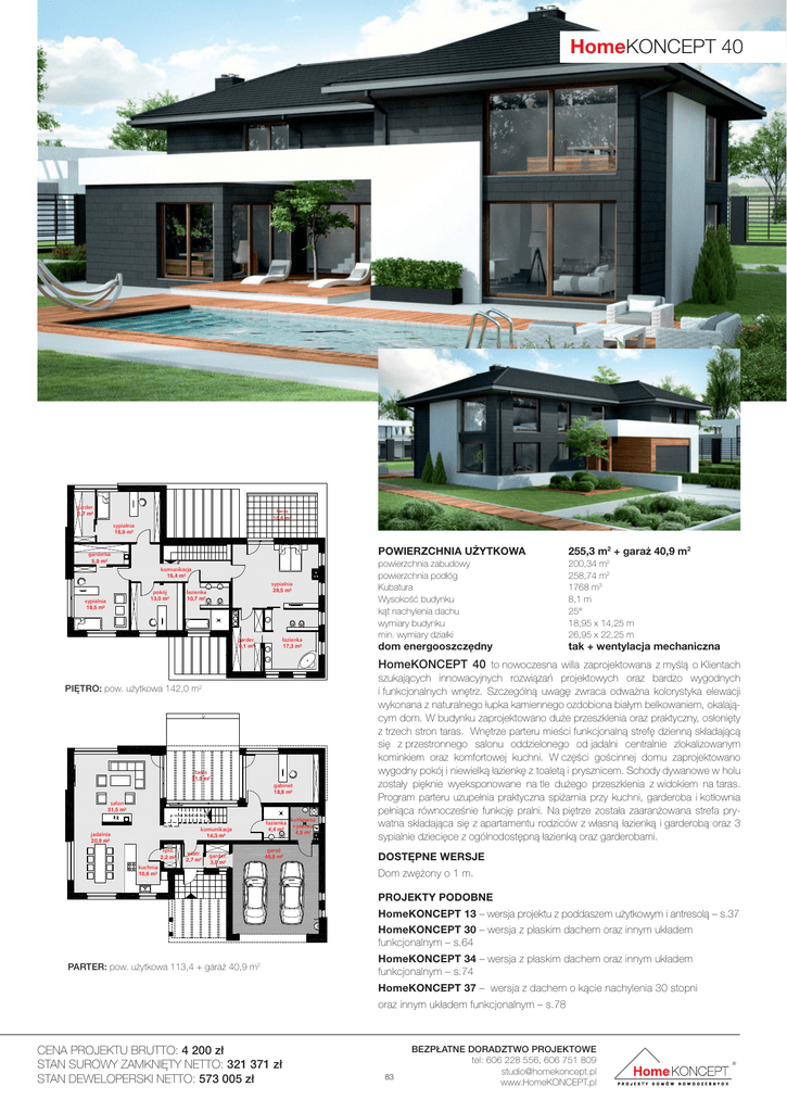 HomeKONCEPT 40 garder. 5,7 m² taras 16,6 m² sypialnia 16,9 m² POWIERZCHNIA UŻYTKOWA garderba 5,9 m² komunikacja 16,4 m² pokój 13,0 m² sypialnia 18,5 m² sypialnia 28,5 m² łazienka 10,7 m² garder. 9,1 m² łazienka 17,3 m² 255,3 m2 + garaż 40,9 m2 powierzchnia zabudowy 200,34 m2 powierzchnia podłóg 258,74 m2 Kubatura1768 m3 Wysokość budynku 8,1 m kąt nachylenia dachu 25° wymiary budynku 18,95 x 14,25 m min. wymiary działki 26,95 x 22,25 m dom energooszczędny tak + wentylacja mechaniczna HomeKONCEPT 40 to nowoczesna willa zaprojektowana z myślą o Klientach PIĘTRO: pow. użytkowa 142,0 m2 taras 31,5 m² gabinet 18,8 m² salon 31,5 m² komunikacja 14,3 m² jadalnia 20,9 m² spiż. 2,2 m² kuchnia 10,6 m² wiatr. 2,7 m² garder. 3,0 m² łazienka 4,4 m² garaż 40,9 m² kotłownia +pralnia 4,9 m² szukających innowacyjnych rozwiązań projektowych oraz bardzo wygodnych i funkcjonalnych wnętrz. Szczególną uwagę zwraca odważna kolorystyka elewacji wykonana z naturalnego łupka kamiennego ozdobiona białym belkowaniem, okalającym dom. W budynku zaprojektowano duże przeszklenia oraz praktyczny, osłonięty z trzech stron taras. Wnętrze parteru mieści funkcjonalną strefę dzienną składającą się z przestronnego salonu oddzielonego od jadalni centralnie zlokalizowanym kominkiem oraz komfortowej kuchni. W części gościnnej domu zaprojektowano wygodny pokój i niewielką łazienkę z toaletą i prysznicem. Schody dywanowe w holu zostały pięknie wyeksponowane na tle dużego przeszklenia z widokiem na taras. Program parteru uzupełnia praktyczna spiżarnia przy kuchni, garderoba i kotłownia pełniąca równocześnie funkcję pralni. Na piętrze została zaaranżowana strefa prywatna składająca się z apartamentu rodziców z własną łazienką i garderobą oraz 3 sypialnie dziecięce z ogólnodostępną łazienką oraz garderobami. DOSTĘPNE WERSJE Dom zwężony o 1 m. PROJEKTY PODOBNE HomeKONCEPT 13 – wersja projektu z poddaszem użytkowym i antresolą – s.37 HomeKONCEPT 30 – wersja z płaskim dachem oraz innym układem funkcjonalnym – s.64 PARTER: pow. użytkowa 113,4 + garaż 40,9 m2 HomeKONCEPT 34 – wersja z płaskim dachem oraz innym układem funkcjonalnym – s.74 HomeKONCEPT 37 – wersja z dachem o kącie nachylenia 30 stopni oraz innym układem funkcjonalnym – s.78 CENA PROJEKTU BRUTTO: 4 200 zł STAN SUROWY ZAMKNIĘTY NETTO: 321 371 zł STAN DEWELOPERSKI NETTO: 573 005 zł 83 BEZPŁATNE DORADZTWO PROJEKTOWE tel: 606 228 556, 606 751 809 [email protected] www.HomeKONCEPT.pl ®