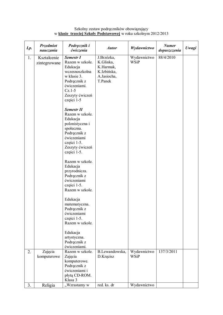 Szkolny zestaw podręczników obowiązujący w klasie trzeciej Szkoły Podstawowej w roku szkolnym 2012/2013 Lp. 1. Przedmiot nauczania Podręcznik i ćwiczenia Kształcenie Semestr I zintegrowane Razem w szkole. Edukacja wczesnoszkolna w klasie 3. Podręcznik z ćwiczeniami. Cz.1-5 Zeszyty ćwiczeń części 1-5 Autor Wydawnictwo J.Brzózka, K.Glinka, K.Harmak, K.Izbińska, A.Jasiocha, T.Panek Wydawnictwo WSiP Numer dopuszczenia 88/4/2010 Semestr II Razem w szkole. Edukacja polonistyczna i społeczna. Podręcznik z ćwiczeniami części 1-5. Zeszyty ćwiczeń części 1-5. Razem w szkole. Edukacja przyrodnicza. Podręcznik z ćwiczeniami części 1-5. Razem w szkole. Edukacja matematyczna. Podręcznik z ćwiczeniami części 1-5. Razem w szkole. 2. Zajęcia komputerowe 3. Religia Edukacja artystyczna. Podręcznik z ćwiczeniami. Razem w szkole. Zajęcia komputerowe. Podręcznik z ćwiczeniami i płytą CD-ROM. Klasa 3 „Wzrastamy w B.Lewandowska, Wydawnictwo D.Kręcisz WSiP red. ks. dr Wydawnictwo 137/3/2011 Uwagi przyjaźni z Jezusem” zeszyt ćwiczeń 4. Język angielski „English Adventure 3” (nowa podstawa programowa) – wydanie uzupełnione T. Śmiech, ks. dr A. Kaszycki, E. Kondrak, B. Nosek A. Worrall, M. Bogucka JEDNOŚĆ Kielce Pearson Central Europe sp. z o.o. 67/4/2010/z1 Szkolny zestaw podręczników obowiązujący w klasie drugiej Szkoły Podstawowej w roku szkolnym 2012/2013 Lp. 1. Przedmiot nauczania Podręcznik i ćwiczenia Kształcenie „Razem w szkole. zintegrowane Edukacja wczesno-szkolna w klasie 2. Podręcznik z ćwiczeniami. Części 1-4.” „Razem w szkole klasa 2. Zeszyt 14” „Razem w szkole. Edukacja wczesnoszkolna w klasie 2. Podręcznik z ćwiczeniami Cz. 5-10. ” ,,Razem w szkole klasa 2 Zeszyt 510.” 2. Zajęcia komputerowe 3. Religia 4. Język angielski „Razem w szkole. Zajęcia komputerowe” Podręcznik z ćwiczeniami. Klasa 2 (z płytą CD-ROM) ,,Jezus jest z nami” ‘English Adventure 2’ (nowa podstawa programowa – wydanie uzupełnione) Autor J. Brzózka, K. Glinka, K. Hamak, K. Izbińska, A. Jasiocha, W. Went Wydawnictwo Numer dopuszczenia Wydawnictwo WSiP 88/2/2009 88/2/2009 K. LenartowiczAbon-Ali, M. Warakomska 88/3/2010 J. Brzózka, K. Glinka, K. Hamak, K. Izbińska, A. Jasiocha, W. Went 88/3/2010 K. MenartowiczAbon- Ali, M. Warakomska D. Kręcisz, B. Lewandowska M. WalczakSarao’ red. ks. dr T. Śmiech, M. Piątek A. Worrall, M. Bogucka Wydawnictwo WSiP 137/2/2010 Wydawnictwo JEDNOŚĆ Kielce Pearson Central Europe sp. z o.o. 67/3/2010/z1 Uwagi Szkolny zestaw podręczników obowiązujący w klasie pierwszej Szkoły Podstawowej w roku szkolnym 2012/2013 Lp. 1. Przedmiot nauczania Podręcznik i ćwiczenia Kształcenie „Nasze Razem w zintegrowane szkole”. Edukacja Zajęcia komputerowe 3. Religia 4. Język angielski Wydawnictwo Numer dopuszczenia Uwagi J. Brzózka, K. Harmak, K. Izbińska, A. Jasiocka, W. Went Wydawnictwo WSiP 484/1/2012 Nowy podręcznik „Nasze Razem w szkole”. Edukacja wczesnoszkolna w klasie 1. Podręcznik z ćwiczeniami część 6,7,8,9,10 J. Brzózka, K. Harmak, K. Izbińska, A. Jasiocka, W. Went Wydawnictwo WSiP 484/2/2012 Nowy podręcznik „Galeria możliwości”. Zajęcia komputerowe. Podręcznik z ćwiczeniami. Edukacja wczesnoszkolna w klasie 1. A. Kulesza Wydawnictwo WSiP 518/1/2012 Nowy podręcznik „Bóg naszym Ojcem” red. ks. dr T. Śmiech, E. Fret, M. Piątek, s. M. Najmowicz L. A. Erocak, B. Michałowski Wydawnictwo JEDNOŚĆ Kielce wczesnoszkolna w klasie 1. Podręcznik z ćwiczeniami część 1,2,3,4,5. Wyprawka część 1 2. Autor ‘Our Discovery Island” część 1 + zeszyt ćwiczeń Pearson Central Europe sp. z o.o. 393/1/2011 Szkolny zestaw podręczników obowiązujący w oddziale przedszkolnym – 6-cio latki w roku szkolnym 2012/2013 Lp. Przedmiot nauczania Podręcznik i ćwiczenia „Razem w przedszkolu” – wyprawka cz. 1-5 1. „Razem w przedszkolu” – karty pracy cz. 1-5 2. Religia „Kocham Dobrego Boga” – podręcznik do nauki religii dla dzieci sześcioletnich Autor Wydawnictwo D. ŁadaGrodzicka, D. Piotrowska Wydawnictwo WSiP red. E. Osewska, ks. J.Stala Wydawnictwo JEDNOŚĆ, Kielce Numer dopuszczenia Uwagi Rok wydania 2010 Szkolny zestaw podręczników obowiązujący w oddziale przedszkolnym – 5-cio latki w roku szkolnym 2012/2013 Lp. Przedmiot nauczania Podręcznik i ćwiczenia „Wesołe przedszkole i przyjaciele – Opowiadania Szpaka Mądraka” 1. Autor Wydawnictwo M. WalczakSarao’ Wydawnictwo WSiP D. Kręcisz „Wesołe przedszkole i przyjaciele – karty pięciolatka cz. 14” 2. Religia „Jestem dzieckiem Bożym” – podręcznik do nauki religii dla dzieci pięcioletnich red. E. Osewska, ks. J. Stala Wydawnictwo JEDNOŚĆ, Kielce Numer dopuszczenia Uwagi Szkolny zestaw podręczników obowiązujący w oddziale przedszkolnym – 4-ro latki w roku szkolnym 2012/2013 Lp. Przedmiot nauczania Podręcznik i ćwiczenia „Wesołe Przedszkole Czterolatka” 1. Autor Wydawnictwo M. WalczakSarao’ Wydawnictwo WSiP Numer dopuszczenia Uwagi D. Kręcisz Szkolny zestaw podręczników obowiązujący w oddziale przedszkolnym – 3-latki w roku szkolnym 2012/2013 Lp. 1. Przedmiot nauczania Podręcznik i ćwiczenia „Wesołe Przedszkole Trzylatka” Autor Wydawnictwo M. WalczakSarao’ Wydawnictwo WSiP D. Kręcisz Numer dopuszczenia Uwagi
