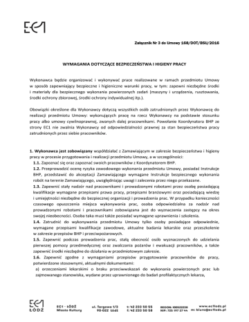 Załącznik Nr 3 do Umowy 168/DOT/BSU/2016 WYMAGANIA DOTYCZĄCE BEZPIECZEŃSTWA I HIGIENY PRACY Wykonawca będzie organizować i wykonywać prace realizowane w ramach przedmiotu Umowy w sposób zapewniający bezpieczne i higieniczne warunki pracy, w tym: zapewni niezbędne środki i materiały dla bezpiecznego wykonania powierzonych zadań (maszyny i urządzenia, rusztowania, środki ochrony zbiorowej, środki ochrony indywidualnej itp.). Obowiązki określone dla Wykonawcy dotyczą wszystkich osób zatrudnionych przez Wykonawcę do realizacji przedmiotu Umowy: wykonujących pracę na rzecz Wykonawcy na podstawie stosunku pracy albo umowy cywilnoprawnej, zwanych dalej pracownikami. Powołanie Koordynatora BHP ze strony EC1 nie zwalnia Wykonawcy od odpowiedzialności prawnej za stan bezpieczeństwa pracy zatrudnionych przez siebie pracowników. 1. Wykonawca jest zobowiązany współdziałać z Zamawiającym w zakresie bezpieczeństwa i higieny pracy w procesie przygotowania i realizacji przedmiotu Umowy, a w szczególności: 1.1. Zapoznać się oraz zapoznać swoich pracowników z Koordynatorem BHP. 1.2. Przeprowadzić ocenę ryzyka zawodowego wykonania przedmiotu Umowy, posiadać Instrukcje BHP, przedstawić do akceptacji Zamawiającego wymagane Instrukcje bezpiecznego wykonania robót na terenie Zamawiającego, uwzględniając uwagi i zalecenia przez niego przekazane. 1.3. Zapewnić stały nadzór nad pracownikami i prowadzonymi robotami przez osobę posiadającą kwalifikacje wymagane przepisami prawa pracy, przepisami branżowymi oraz posiadającą wiedzę i umiejętności niezbędne do bezpiecznej organizacji i prowadzenia prac. W przypadku konieczności czasowego opuszczenia miejsca wykonywania prac, osoba odpowiedzialna za nadzór nad prowadzonymi robotami i pracownikami zobowiązana jest do wyznaczenia zastępcy na okres swojej nieobecności. Osoba taka musi także posiadać wymagane uprawnienia i szkolenia. 1.4. Zatrudnić do wykonywania przedmiotu Umowy tylko osoby posiadające odpowiednie, wymagane przepisami kwalifikacje zawodowe, aktualne badania lekarskie oraz przeszkolenie w zakresie przepisów BHP i przeciwpożarowych. 1.5. Zapewnić podczas prowadzenia prac, stałą obecność osób wyznaczonych do udzielania pierwszej pomocy przedmedycznej oraz zwalczania pożarów i ewakuacji pracowników, a także zapewnić środki niezbędne do działania w przedmiotowym zakresie. 1.6. Zapewnić zgodne z wymaganiami przepisów przygotowanie pracowników do pracy, potwierdzone stosownymi, aktualnymi dokumentami: a) orzeczeniami lekarskimi o braku przeciwwskazań do wykonania powierzonych prac lub zajmowanego stanowiska, wydane przez uprawnionego do badań profilaktycznych lekarza, b) dokumentami potwierdzającymi ważność szkoleń pracowników w zakresie BHP i przepisów przeciwpożarowych, w tym szkolenia informacyjnego BHP przeprowadzonego w siedzibie zleceniodawcy przed rozpoczęciem robót, szkoleń na stanowisku pracy, a dla pracowników zatrudnionych na stanowiskach robotniczych wykonujących prace szczególnie niebezpieczne, przeprowadzanie szkolenia okresowego nie rzadziej niż raz do roku, c) świadectwami i dokumentami potwierdzającymi dodatkowe kwalifikacje niezbędne do wykonania powierzonych prac, obsługi sprzętu lub kierowania maszynami i pojazdami, d) kartami oceny ryzyka zawodowego wraz z oświadczeniami potwierdzającymi zapoznanie pracowników z zagrożeniami wynikającymi z oceny ryzyka zawodowego, występującymi na określonych stanowiskach pracy, e) potwierdzeniami zapoznania pracownika z DTR maszyn i innych urządzeń technicznych lub ich instrukcją obsługi, f) potwierdzeniami dokonywania okresowych kontroli urządzeń elektrycznych pod względem bezpieczeństwa, g) wykazami osób wyznaczonych i przeszkolonych w zakresie udzielania pomocy przedmedycznej, h) wykazami maszyn, urządzeń i elektronarzędzi używanych w trakcie realizacji przedmiotu umowy. Wykonawca zobowiązany jest do przechowywania powyższych dokumentów na terenie wykonywania prac i okazania ich na żądanie Zamawiającego. 1.7. Zapewnić maszyny, urządzenia i sprzęt niezbędny do wykonania robót, spełniający wymagania przepisów i norm bezpieczeństwa. Wykonawca zobowiązany jest udostępnić na żądanie Zamawiającego dokumentację potwierdzającą sprawność i bezpieczeństwo eksploatacji urządzeń, maszyn oraz instalacji użytkowanych w związku z realizacją przedmiotu Umowy. 1.8. Niezwłocznie zgłaszać Zamawiającemu incydenty, zdarzenia wypadkowe, potencjalnie wypadkowe oraz zagrożenia dla zdrowia i życia zaistniałe na terenie „EC1 Łódź-Miasto Kultury” w Łodzi lub w związku z realizacją przedmiotu umowy, a gdy zawiadomienie o zdarzeniu dokonano w formie ustnej, potwierdzać to pisemnie nie później niż w ciągu 24 godzin po zdarzeniu. 1.9. Zapewnić przeprowadzenie postępowania powypadkowego w sytuacji zaistnienia wypadków pracowników oraz umożliwić obecność przedstawiciela Zamawiającego podczas postępowania powypadkowego a także udostępnić mu dokumentację powypadkową. 1.10. Zapewnić odzież roboczą i ochronną, obuwie robocze oraz niezbędne środki ochrony, dbać o sprawność środków ochrony indywidualnej oraz ich stosowanie zgodnie z przeznaczeniem. 1.12. Zapewnić ład i porządek na stanowiskach pracy oraz w ich otoczeniu, a także bezpieczny stan urządzeń i wyposażenia oraz środków ochrony zbiorowej stosowanych w związku z realizacją przedmiotu Umowy. 1.13. Egzekwować od pracowników przestrzeganie przepisów i zasad bezpieczeństwa i higieny pracy, instrukcjach BHP, sporządzonych na okoliczność realizacji Umowy. 1.14. Uczestniczyć w spotkaniach, kontrolach i inspekcjach organizowanych przez Zamawiającego dotyczących bezpieczeństwa i higieny pracy oraz koordynacji robót. 1.15. Terminowo realizować zalecenia z przeprowadzonych kontroli i inspekcji BHP i ppoż. 2. Wykonawca jest uprawniony do: 2.1. Wizytacji stanowisk