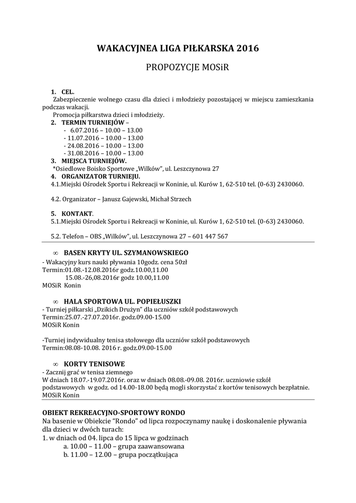 WAKACYJNEA LIGA PIŁKARSKA 2016 PROPOZYCJE MOSiR 1. CEL. Zabezpieczenie wolnego czasu dla dzieci i młodzieży pozostającej w miejscu zamieszkania podczas wakacji. Promocja piłkarstwa dzieci i młodzieży. 2. TERMIN TURNIEJÓW – - 6.07.2016 – 10.00 – 13.00 - 11.07.2016 – 10.00 – 13.00 - 24.08.2016 – 10.00 – 13.00 - 31.08.2016 – 10.00 – 13.00 3. MIEJSCA TURNIEJÓW. *Osiedlowe Boisko Sportowe „Wilków”, ul. Leszczynowa 27 4. ORGANIZATOR TURNIEJU. 4.1.Miejski Ośrodek Sportu i Rekreacji w Koninie, ul. Kurów 1, 62-510 tel. (0-63) 2430060. 4.2. Organizator – Janusz Gajewski, Michał Strzech 5. KONTAKT. 5.1.Miejski Ośrodek Sportu i Rekreacji w Koninie, ul. Kurów 1, 62-510 tel. (0-63) 2430060. 5.2. Telefon – OBS „Wilków”, ul. Leszczynowa 27 – 601 447 567 • BASEN KRYTY UL. SZYMANOWSKIEGO - Wakacyjny kurs nauki pływania 10godz. cena 50zł Termin:01.08.-12.08.2016r godz.10.00,11.00 15.08.-26,08.2016r godz 10.00,11.00 MOSiR Konin • HALA SPORTOWA UL. POPIEŁUSZKI - Turniej piłkarski „Dzikich Drużyn” dla uczniów szkół podstawowych Termin:25.07.-27.07.2016r. godz.09.00-15.00 MOSiR Konin -Turniej indywidualny tenisa stołowego dla uczniów szkół podstawowych Termin:08.08-10.08. 2016 r. godz.09.00-15.00 • KORTY TENISOWE - Zacznij grać w tenisa ziemnego W dniach 18.07.-19.07.2016r. oraz w dniach 08.08.-09.08. 2016r. uczniowie szkół podstawowych w godz. od 14.00-18.00 będą mogli skorzystać z kortów tenisowych bezpłatnie. MOSiR Konin OBIEKT REKREACYJNO-SPORTOWY RONDO Na basenie w Obiekcie “Rondo” od lipca rozpoczynamy naukę i doskonalenie pływania dla dzieci w dwóch turach: 1. w dniach od 04. lipca do 15 lipca w godzinach a. 10.00 – 11.00 – grupa zaawansowana b. 11.00 – 12.00 – grupa początkująca c. 15.00 – 16.00 – grupa początkująca d.16.00 – 17.00 – grupa zaawansowana 2. tura od 18 lipca do 29 lipca a. 10.00 – 11.00 – grupa zaawansowana b. 11.00 – 12.00 – grupa początkująca c. 15.00 – 16.00 – grupa początkująca d.16.00 – 17.00 – grupa zaawansowana Osoba prowadząca – instruktor Robert Szczygłowski. Wakacje w Miejskim Ośrodku Wypoczynkowym „Przystań Gosławice” w Koninie, ul. Rybacka 24-26.06. 2016 Rodzinny Park Rozrywki 01-03.07.2016 02-03.07.2016 Rodzinny Park Rozrywki Aktywne wakacje z klubem PERSONA SPORT 08-10.07.2016 09-10.07.2016 09.07.2016 Rodzinny Park Rozrywki Aktywne wakacje z klubem PERSONA SPORT Muzyczna Przystań – koncert 15-17.07.2016 16-17.07.2016 Rodzinny Park Rozrywki Aktywne wakacje z klubem PERSONA SPORT 22-24.07.2016 23-24.07.2016 24.07.2016 Rodzinny Park Rozrywki Aktywne wakacje z klubem PERSONA SPORT Złote Plaże Radia ZET GOLD 29-31.07.2016 30-31.07.2016 30.07.2016 Rodzinny Park Rozrywki Aktywne wakacje z klubem PERSONA SPORT Muzyczna Przystań – koncert 05.08.2016 05-07.08.2016 06-07.08.2016 Kino letnie na Przystani ?? Rodzinny Park Rozrywki Aktywne wakacje z klubem PERSONA SPORT 12-15.08.2016 13-14.08.2016 14.08.2016 Rodzinny Park Rozrywki Aktywne wakacje z klubem PERSONA SPORT Muzyczna Przystań - koncert i/lub 12.08. kino ?? 19-21.08.2016 20-21.08.2016 20.08.2016 Rodzinny Park Rozrywki Aktywne wakacje z klubem PERSONA SPORT Ugotowani na Przystani ?? 26-28.08.2016 27-28.08.2016 Rodzinny Park Rozrywki Aktywne wakacje z klubem PERSONA SPORT 02-04.09.2016 Pożegnanie wakacji?? REJSY TRAMWAJEM WODNYM Z „PRZYSTANI GOSŁAWICE” W maju i czerwcu: - od wtorku do piątku w godz. 16:00 – 18:00 - w soboty i niedziele w godz. 12:00 – 18:00 W lipcu i sierpniu: - od wtorku do piątku w godz. 12:00 – 18:00 - w soboty i niedziele w godz. 11:00 – 18:00 W poniedziałki rejsy nie obywają się. Rejs trwa 45 minut i może się odbyć się przy min. 8 chętnych pasażerach. Cena biletu normalnego: 13 zł Cena biletu ulgowego dla dzieci do lat 12: 7 zł Wynajem tramwaju – rezerwacja na wyłączność 1 godz. - 150,00 zł Rezerwacje pod numerem telefonu 885-63-63-00 REGULAMIN REJSÓW