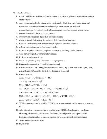 Pierwiastki bloku s 1. metale wyjątkowo reaktywne, silne reduktory, występują głównie w postaci związków chemicznych; 2. wraz ze wzrostem liczby atomowej wzrasta zdolność do jonizacji, która może być wywołana czynnikami chemicznymi (reakcja chemiczna), czynnikami niechemicznymi (promieniowanie elektromagnetyczne lub wysoka temperatura); 3. stopień utlenienia: litowce +1, berylowce +2; 4. otrzymywanie poprzez elektrolizę stopionych soli; 5. niskie gęstości, duże objętości molowe, duże promienie atomowe; 6. litowce – niskie temperatury topnienia; berylowce znacznie wyższe; 7. dobrze przewodzą prąd elektryczny i ciepło; 8. litowce: miękkie, kowalne i ciągliwe, berylowce: bardziej kruche i twarde 9. wraz ze wzrostem l.a. wzrasta toksyczność; 10. Fr, Ra – promieniotwórcze; 11. Na, K – najbardziej rozpowszechnione w przyrodzie; 12. bezpośrednio reagują z P, As, Sb, chlorowcami; 13. tworzą: wodorki: XH, XH2 (silne reduktory), tlenki: X2O, XO, nadtlenki: X2O2, XO2, ponadtlenki: XO2, azotki: Li3N, X3N2 (spalanie w azocie) 14. reakcja z wodą: azotki + H2O LiO/X(OH)2 + NH3 XH + H2O XOH + H2 XH2 + 2H2O X(OH)2 + 2H2 2X + 2H2O 2XOH + H2, X + 2H2O X(OH)2 + H2 X2O + H2O 2XOH, XO + H2O X(OH)2 X2O2 +2H2O 2XOH + H2O2, XO2 + 2H2O X(OH)2 + H2O2 2XO2 + 2H2O 2XOH + H2O2 + O2 15. XOH – rozpuszczalne w wodzie; X(OH)2 – rozpuszczalność rośnie wraz ze wzrostem l.a.; 16. sole: litowców – rozpuszczalne w wodzie (wyj. KClO4); berylowców - węglany, siarczany, chromiany, szczawiany, fosforany, fluorki prawie nierozpuszczalne (rozpuszczalność maleje wraz ze wzrostem l.a.), pozostałe sole rozpuszczalne; 17. znane związki kompleksowe 18. krystalizują Pierwiastki bloku p Metale 1. znacznie mniej aktywne niż metale bloku s; 2. najczęściej występują na dwóch stopniach utlenienia; niższy stopień utlenienia – właściwości redukujące, wyższy stopień utlenienia – właściwości utleniające; 3. wzrost l.a. – wzrost: gęstości, temperatura topnienia i wrzenia, właściwości metalicznych; 4. występują metale o właściwościach amfoterycznych; 5. mogą tworzyć związki kompleksowe Niemetale 1. występują w postaci związków chemicznych i w stanie wolnym; 2. występują na kilku stopniach utlenienia – dodatnich lub ujemnych, w różnych stanach skupienia, kilku odmianach alotropowych; 3. właściwości utleniające; 4. wraz ze wzrostem l.a. maleje zdolność do jonizacji; 5. wraz ze wzrostem nr grupy wzrasta aktywność; 6. fluorowce, tlen, siarka, azot, fosfor – stosunkowo niskie temperatury topnienia i wrzenia, które wzrastają wraz ze wzrostem l.a. 7. C, Si, B – kryształy kowalencyjne; 8. tlenki o charakterze obojętnym (np. CO, NO) i kwasowym które z H2O tworzą kwasy tlenowe; 9. fluorowce i tlenowce tworzą kwasy beztlenowe (moc wzrasta wraz ze wzrostem l.a.); 10. z pierwiastkami I gr tworzą związki jonowe, z pozostałymi kowalencyjne; Gazy szlachetne 1. bezbarwne, jednoatomowe gazy; 2. konfiguracja elektronowa: He 1s2, Ne, Ar ns2np6, Kr, Xe ns2np6 nd10, Rn ns2np6nd10f14 3. wysokie energie jonizacji; 4. tworzenie związków chemicznych wymaga: m.in. napromieniowania UV, , strumieni e-, n Sól mocnego kwasu i słabej zasady MA M n Am M n H 2O MOH ( n 1) H K [ H ][ MOH ( n 1) ] [ M n ][ H 2O] [ H ][ MOH ( n 1) ] K h K [ H 2O ] [M n ] ( n 1) [ H ][ MOH ( n 1) ] [OH ] ] [ MOH Kh [ H ][OH ] n n [M ] [OH ] [ M ][OH ] [ M n ][OH ] Kz ( n 1) [ MOH ] [ H ][ OH ] K w Kh Kw Kz Sól słabego kwasu i mocnej zasady M m A n mM n nA m A m H 2 O HA ( m 1) OH K [OH ][ HA ( m 1) ] [ A m ][ H 2 O] K h K [ H 2 O] Kh [OH ][ HA ( m 1) ] [A m ] [OH ][ HA ( m 1) ] [ H ] [ HA ( m 1) ] [ H ][OH ] [A m ] [H ] [ A m ][ H ] [ Am ][ H ] Kk [ HA( m 1) ] [ H ][OH ] K w Kw Kh Kk Pierwiastki bloku d 1. metale; 2. kilka dodatnich stopni utlenienia; 3. prawie wszystkie to ciała stałe; 4. kowalne, ciągliwe, tworzą stopy; 5. znaczna gęstość; 6. wysokie temperatury topnienia i wrzenia (wyj. Zn, Cd, Hg, La, Ag) 7. dobra przewodność cieplna i prądu; 8. wraz ze wzrostem l.a. aktywność maleje (metale szlachetne) 9. na niższym stopniu utlenienia – tworzą związki o charakterze jonowym, na wyższym stopniu utlenienia – wzrost udziału kowalencyjnego w wiązaniu; 10. właściwości kwasowo-zasadowe, utleniająco-redukcyjne zmieniają się: a. niższy - właściwości zasadowe b. pośredni – właściwości amfoteryczne c. wyższy – właściwości kwasowe d. niższy - właściwości redukujące e. wyższy – właściwości utleniające 11. tworzą związki kompleksowe:) Pierwiastki bloku f 1. typowe metale; 2. lantanowce głównie występują na +3 stopniu utlenia, aktynowce od +2 do +4; 3. gwałtownie reagują z woda i tlenem (przechowywane w atmosferze gazu obojętnego); 4. niezbyt rozpowszechnione w skorupie ziemskiej, występują w postaci minerałów tworzących złoża wspólne, niektóre otrzymano sztucznie, które to mają właściwości promieniotwórcze