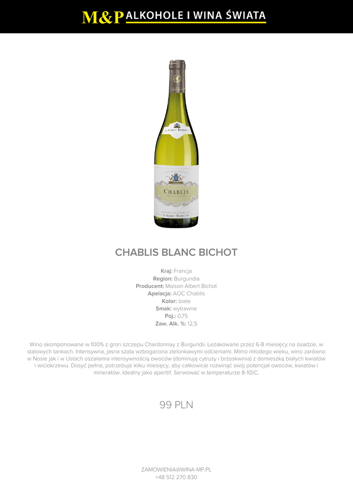 CHABLIS BLANC BICHOT Kraj: Francja Region: Burgundia Producent: Maison Albert Bichot Apelacja: AOC Chablis Kolor: białe Smak: wytrawne Poj.: 0,75 Zaw. Alk. %: 12,5 Wino skomponowane w 100% z gron szczepu Chardonnay z Burgundii. Leżakowane przez 6-8 miesięcy na osadzie, w stalowych tankach. Intensywna, jasna szata wzbogacona zielonkawymi odcieniami. Mimo młodego wieku, wino zarówno w Nosie jak i w Ustach oszałamia intensywnością owoców (dominują cytrusy i brzoskwinia) z domieszką białych kwiatów i wiciokrzewu. Dosyć pełne, potrzebuje kilku miesięcy, aby całkowicie rozwinąć swój potencjał owoców, kwiatów i minerałów. Idealny jako aperitif. Serwować w temperaturze 8-10°C. 99 PLN [email protected] +48 512 270 830