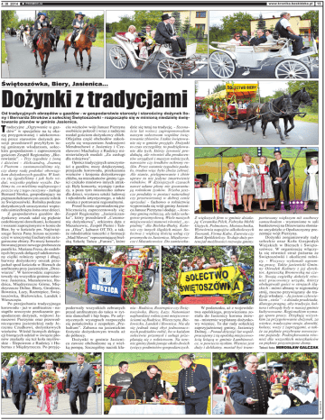 www.kronika.beskidzka.pl 4 IX 2014 I ● PROMOCJA 15 Świętoszówka, Biery, Jasienica... Dożynki z tradycjami Od tradycyjnych obrzędów u gazdów - w gospodarstwie starosty i starościny dożynek Ilony i Bernarda Stroków z sołeckiej Świętoszówki - rozpoczęło się w minioną niedzielę świętowanie plonów w gminie Jasienica. radycyjne „Ogrywanie u gaz- ciu wieńców wójt Janusz Pierzyna dzie się tutaj na tradycję. - Szesnadów” w specjalnie na tę oka- osobiście pokroił i wraz z radnymi ście lat wstecz zaproponowałem zję przygotowanej i udekorowa- rozdał gościom dożynkowy chleb. naszym sołectwom wspólne święnej przez starostów dożynek po- Oficjalna część obchodów zakoń- towanie zbiorów. I takie świętowasesji przedstawił przybyłym tu- czyła się wręczeniem Andrzejowi nie się w gminie przyjęło. Dożynki taj gminnym włodarzom, sołec- Mendrochowi z Jasienicy i Cze- to czas szczególny, to podziękowakim gospodarzom i zaproszonym sławowi Machalicy z Rudzicy mi- nie dla tych, którzy żywność progościom Zespół Regionalny „Bie- nisterialnych medali „Za zasługi dukują, ale również dla producentów urządzeń i maszyn rolniczych, rowianie”. - Trzy tygodnie z żoną dla rolnictwa”. Oprócz tradycyjnych uroczysto- nawozów czy środków ochrony roi dziećmi - Aleksandrą, Joanną i Piotrem - zastanawialiśmy się, ści u gazdów, mszy dziękczynnej, ślin. Przez ostatnie tygodnie padaczy damy radę podołać obowiąz- przejazdu korowodu, przekazania ło, trudno więc było zboża zebrać. kom dożynkowych gazdów. W koń- wieńców i krojenia dożynkowego Ale sianie, pielęgnowanie i zbiór cu się zgodziliśmy i jak było wi- chleba, na mieszkańców gminy i go- upraw to nie jedyne zmartwienie dać, wszystko pięknie wyszło. Da- ści czekało mnóstwo innych atrak- rolników. W dzisiejszych czasach liśmy to, co mieliśmy najlepszego i cji. Były koncerty, występy i poka- nawet udane plony nie gwarantujeszcze się z tego cieszymy - żartuje zy, a poza tym miasteczko zabaw ją rolnikom zysków. Trzeba jeszBernard Stroka, gospodarujący na dla dzieci, wystawa sztuki ludowej cze produkty w postaci naturalnej piętnastohektarowym areale rolnik i rękodzieła artystycznego, a także czy przetworzonej w dobrej cenie ze Świętoszówki. Rolnika podczas stoiska z potrawami regionalnymi. sprzedać - fachowo o rolnictwie Przed licznie zgromadzoną pu- wypowiada się wójt gminy Jasienidożynkowych uroczystości wspierała uśmiechnięta żona oraz dzieci. blicznością zaprezentowały się: ca Janusz Pierzyna i dodaje. - JesteZ gospodarstwa gazdów do- Zespół Regionalny „Jasieniczan- śmy gminą rolniczą, ale także usłużynkowy orszak udał się pięknie ka”, który przedstawił „Ceremo- gowo-przemysłową. Wiele naszych ozdobionymi dorożkami, kolasami nię dożynkową”, orkiestra dęta z miejscowości stanowi również „syi wozami zaprzężonymi w konie do Mazańcowic, Zespół Pieśni i Tań- pialnię” dla Bielska-Białej, KatoBier, by w kościele pw. Najświęt- ca „Olza”, kabaret OT.TO, a tak- wic czy innych śląskich miast. Soszego Serca Pana Jezusa uczestni- że młodziutkie tancerki z formacji łectwa z większą ilością usług czy czyć w uroczystej Eucharystii za te- „Mad Moves” reprezentującej biel- przemysłu to Jasienica, Międzyrzegoroczne zbiory. Po mszy koncele- ską Szkołę Tańca „Furora”, które cze i Mazańcowice. Do zamieszkabrowanej przez nowego proboszcza parafii ks. Mariana Fresa, do ozdobnych bryczek dołączył udekorowany ciężki rolniczy sprzęt i długi, barwny dożynkowy orszak przejechał spod kościoła w Bierach do amfiteatru przy jasienickim „Drzewiarzu”. W korowodzie zaprezentowały się wszystkie gminne sołectwa: Jasienica, Mazańcowice, Rudzica, Międzyrzecze Górne, Międzyrzecze Dolne, Biery, Grodziec, Iłownica, Łazy, Roztropice, Świętoszówka, Bielowicko, Landek i Wieszczęta. Po przejechaniu tradycyjnego korowodu - już w amfiteatrze - na- poderwały wszystkich zebranych nia - Rudzica, Roztropice czy Święstąpiło uroczyste przekazanie go- przed amfiteatrem do tańca w ryt- toszówka, Biery, Łazy. Natomiast spodarzom dożynek, wójtowi Ja- mie dancehall i hip hopu. Po arty- najbardziej rolniczymi miejscowonuszowi Pierzynie oraz przewod- stycznych występach rozpoczęła ściami są Rudzica, Wieszczęta, Bieniczącemu jasienickiej rady Je- się potańcówka z zespołem „Pre- lowicko, Landek i Iłownica. Nie da rzemu Czudkowi, dożynkowych ludium”. Zabawa na jasienickim się jednak tutaj zbyt jednoznaczwieńców. Wśród licznych delega- festynie dożynkowym trwała aż nych podziałów robić, bo w każdym cji biorących udział w święcie plo- do północy. sołectwie przemysł i usługi przenów znalazły się też koła myśliwDożynki w gminie Jasieni- platają się z rolnictwem. Na tereskie - Ślepowron z Rudzicy i Hu- ca zawsze obchodzone są z wiel- nie gminy funkcjonuje około dwóch bertus z Międzyrzecza. Po przyję- ką pompą. Szczególny nacisk kła- tysięcy podmiotów gospodarczych. T W podarunku, aż z województwa opolskiego, przywieziona została do Jasienicy korona żniwna - misternie wyplatany dożynkowy wieniec. To dar rady sołeckiej zaprzyjaźnionej gminy, Jasienicy Dolnej. - Ponad dziesięć lat współpracujemy z tą opolską miejscowością leżącą w gminie Łambinowice, w powiecie nyskim. Wieniec jest duży i delikatny, musiał być trans- portowany większym niż osobowy samochodem - wystawione w sali bankietowej na Drzewiarzu słomiane arcydzieło z Opolszczyzny prezentuje wójt Pierzyna. Dożynki zorganizowały rady sołeckie oraz Koła Gospodyń Wiejskich w Bierach i Świętoszówce. W organizację włączyła się również straż pożarna ze Świętoszówki i okoliczni rolnicy. - Wszyscy wykonali ogromną pracę. Także jasienicki Gminny Ośrodek Kultury z jej dyrektor, Agnieszką Bronowską na czele. Swoją cegie