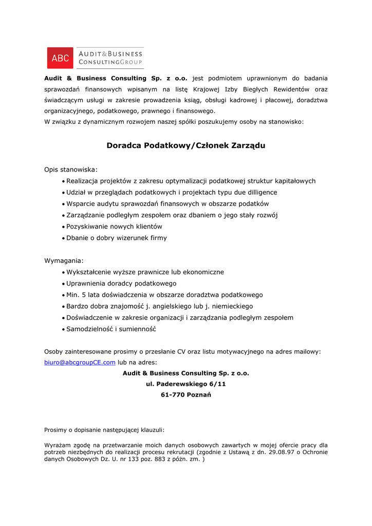 Audit & Business Consulting Sp. z o.o. jest podmiotem uprawnionym do badania sprawozdań finansowych wpisanym na listę Krajowej Izby Biegłych Rewidentów oraz świadczącym usługi w zakresie prowadzenia ksiąg, obsługi kadrowej i płacowej, doradztwa organizacyjnego, podatkowego, prawnego i finansowego. W związku z dynamicznym rozwojem naszej spółki poszukujemy osoby na stanowisko: Doradca Podatkowy/Członek Zarządu Opis stanowiska: • Realizacja projektów z zakresu optymalizacji podatkowej struktur kapitałowych • Udział w przeglądach podatkowych i projektach typu due dilligence • Wsparcie audytu sprawozdań finansowych w obszarze podatków • Zarządzanie podległym zespołem oraz dbaniem o jego stały rozwój • Pozyskiwanie nowych klientów • Dbanie o dobry wizerunek firmy Wymagania: • Wykształcenie wyższe prawnicze lub ekonomiczne • Uprawnienia doradcy podatkowego • Min. 5 lata doświadczenia w obszarze doradztwa podatkowego • Bardzo dobra znajomość j. angielskiego lub j. niemieckiego • Doświadczenie w zakresie organizacji i zarządzania podległym zespołem • Samodzielność i sumienność Osoby zainteresowane prosimy o przesłanie CV oraz listu motywacyjnego na adres mailowy: [email protected] lub na adres: Audit & Business Consulting Sp. z o.o. ul. Paderewskiego 6/11 61-770 Poznań Prosimy o dopisanie następującej klauzuli: Wyrażam zgodę na przetwarzanie moich danych osobowych zawartych w mojej ofercie pracy dla potrzeb niezbędnych do realizacji procesu rekrutacji (zgodnie z Ustawą z dn. 29.08.97 o Ochronie danych Osobowych Dz. U. nr 133 poz. 883 z póżn. zm. )
