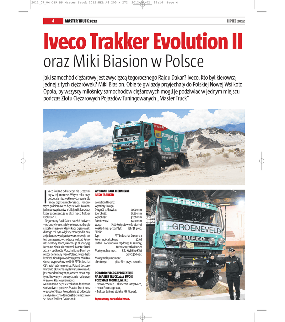 2012_07_04 OTR RP Master Truck 2012:WKL A4 205 x 272 4 2012-07-02 12:16 Page 4 MASTER TRUCK 2012 LIPIEC 2012 Iveco Trakker Evolution II oraz Miki Biasion w Polsce Jaki samochód ciężarowy jest zwycięzcą tegorocznego Rajdu Dakar? Iveco. Kto był kierowcą jednej z tych ciężarówek? Miki Biasion. Obie te gwiazdy przyjechały do Polskiej Nowej Wsi koło Opola, by wszyscy miłośnicy samochodów ciężarowych mogli je podziwiać w jednym miejscu podczas Zlotu Ciężarowych Pojazdów Tuningowanych „Master Truck” veco Poland od lat czynnie uczestniczy w tej imprezie. W tym roku przygotowała niezwykłe wydarzenie dla fanów ciężkiej motoryzacji. Honorowym gościem Iveco będzie Miki Biasion, jeden ze zwycięzców 33. Rajdu Dakar 2012, który zaprezentuje w akcji Iveco Trakker Evolution II. – Tegoroczny Rajd Dakar należał do Iveco – pojazdy Iveco zajęły pierwsze, drugie i szóste miejsce w klasyfikacji ciężarówek, dlatego też tym większy zaszczyt dla nas, że jeden ze zwycięzców wraz ze swoją potężną maszyną, wchodzącą w skład Petronas de Rooy Team, ukoronuje ekspozycję Iveco na zlocie ciężarówek Master Truck 2012 – podkreśla Massimiliano Perri, dyrektor generalny Iveco Poland. Iveco Trakker Evolution II prowadzony przez Miki Biasiona, wyposażony w silnik FPT Industrial C13, zajął szóste miejsce. Pojazd dostosowany do ekstremalnych warunków rajdu jest standardowym pojazdem Iveco zoptymalizowanym do uzyskania najlepszej w swojej klasie sprawności. Miki Biasion będzie czekał na fanów na stoisku Iveco podczas Master Truck 2012 w sobotę 7 lipca. Po godzinie 17 odbędzie się dynamiczna demonstracja możliwości Iveco Trakker Evolution II. I WYBRANE DANE TECHNICZNE IVECO TRAKKER Evolution II (4x4): Wymiary i waga: Długość całkowita: 7000 mm Szerokość: 2550 mm Wysokość: 3200 mm Rozstaw osi: 4400 mm Waga: 9500 kg (gotowy do startu) Rozkład mas przód/tył: 55/45 proc. Silnik: Typ: FPT Industrial Cursor 13 Pojemność skokowa: 12,9 l Układ: 6 cylindrów, rzędowy, 24 zawory, turbosprężarka Holset Maksymalna moc: 880 KM (630 KW) przy 2900 obr. Maksymalny moment obrotowy: 3600 Nm przy 1200 obr. PONADTO IVECO ZAPREZENTUJE NA MASTER TRUCK 2012 SWOJE POZOSTAŁE MODELE, M.IN.: – Iveco EcoStralis – Akademia Jazdy Iveco, – Iveco Eurocargo 4x4, – Trakker 6x6 (na stoisku KH Kipper). Zapraszamy na stoisko Iveco.