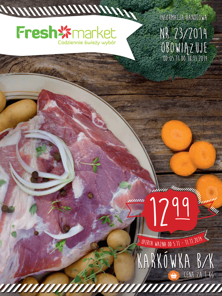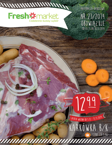 Informacja handlowa .................................. NR 23/2014 Obowiązuje od 05.11 do 18.11.2014 99 12 oferta ważna od 5.11 - 11.11.2014 karkówkacena b/k za 1 kg Smaki dla koneserów 1522 99-30% 99 Ser Gouda Mlekpol Cena za 1 kg 1622 49-28% 99 Ser rolada Ustrzycka Mlekpol Cena za 1 kg 18 99 Szynka Chłopska Cena za 1 kg 1015 99-31% 99 szynka królewiecka tarczyński Cena za 1 kg 2599 kurczak gotowany tarczyński Cena za 1 kg 2 Wszystkie ceny są cenami maksymalnymi. Każdy sklep ma prawo stosować własne ceny, nie wyższe niż ceny maksymalne. 1216 99-24% Kiełbasa śląska Morliny 91299-23% Pasztet Gospodarza Indykpol Cena za 1 kg 99 99 cena za 1 kg 2934 -14% 99 99 Kiełbasa Krakowska Sucha Olewnik 2429 99-17% 99 Kiełbaski z fileta Tarczyński Cena za 1 kg cena za 1 KG 11 99 Mięso gulaszowe z indyka Cena za 1 kg cena obowiązuje 12.11 - 18.11 Produkt dostępny w wybranych sklepach. Sprawdź na www.freshmarket.pl. 3 promocja weEkendowa 6.11-9.11 a Gruszka Cena za 1 kg 2 99 mandarynka cena za 1 kg 5 4 89 49 Pieczarka a cena za 1 kg a KAPUSTA KWASZONA jako nieodłączny element kuchni polskiej doskonale sprawdza się w okresie jesienno-zimowym. Dzięki zawartej w niej dużej ilości witaminy C wzmacnia organizm zapobiegając tym samym zachorowaniu na grypę. Witaminy z grupy B i E, które zawiera kapusta kwaszona dotleniają ciało i poprawiają wygląd skóry, włosów i paznokci. Dietetycy podkreślają również jej właściwości odchudzające – 100 g kapusty kwaszonej dostarcza tylko 16 kcal. Co więcej, kapusta reguluje przemianę tłuszczową oraz obniża poziom cholesterolu. 4 199 Kapusta kwaszona cena za 1 kg, paczka Wszystkie ceny są cenami maksymalnymi. Każdy sklep ma prawo stosować własne ceny, nie wyższe niż ceny maksymalne. Rogal z Białym Makiem 113 9949 150 g / 1 kg = 26,60 zł 13 114999 Ciasto jabłecznik tradycyjny Bizon cena za 1 kg Kawa FreshcafÉ 200 ml różne rodzaje Ciasto sernik tradycyjny Bizon 15 114999 cena za 1 kg + wie w zesta ! taniej !! 50 4 Ciastko z nadzieniem jabłkowym cena za 1 szt. = 2,49 zł 100 g / 1 kg = 24,90 zł 15 114999 ciasto Kremówka Bizon cena za 1 kg 5 CHRUPIĄCY CHLEB WYPIECZONY Z DODATKIEM MĄKI ŻYTNIEJ, ZIAREN SŁONECZNIKA, SOI I SIEMIENIA LNIANEGO Idealne na jesienną słotę. Pysznie, słodkie, chrupiące ciastko obsypane migdałami 2 19-12% CHLEB 3 ZIARNA OMAR 249 280 g / 1 KG = 7,82 zł 179 Ciastko ze słodkim nadzieniem i migdałami 90 G / 1 KG = 19,89 zł 059 Bułka wieloziarnista 229 70 g / 1 KG = 8,43 zł Tost Tostatto pesto 250 g / 1 kg = 9,16 ZŁ 2 2 ZŁ szt. za Wafle kukurydziane Good Food 2 x 35 g / 1 kg = 28,57 zł 6 199 Chleb razowy krojony 400 g / 1 kg = 4,98 ZŁ Wszystkie ceny są cenami maksymalnymi. Każdy sklep ma prawo stosować własne ceny, nie wyższe niż ceny maksymalne. Zacznij dzień od... 379 199 Powidła węgierkowe Łowicz Twarożek delikatny PrÉsident naturalny, ze szczypiorkiem 150 g / 1 kg = 13,27 zł 290 g / 1 kg = 13,07 zł 11 49-25% 99 Jogurt activia naturalna różne rodzaje 106 - 122 g / 1 kg = 12,21 - 14,06 zł BOHATER GAZETKI 180 g / 1 kg = 8,28 zł 2 99 Margaryna Smakowita z masłem 500 g / 1 kg = 5,98 ZŁ 149 Jogurt fantasia Masło extra łaciate mlekpol 200 g / 1 kg = 19,95 zł 3 99 7 Przysmak dnia 179 Szynka: polska, wielkopolska; gulasz angielski agrico 110 - 135 g / 1 KG = 13,26 - 16,27 zł 349 Mielonka wieprzowa Sokołów 300 g / 1 KG = 11,63 zł 299 Polędwica Sopocka Tradycyjne Smaki 100 g / 1 KG = 29,90 zł BOHATER GAZETKI 4 8 99 Kabanos Tarczyński wieprzowy, drobiowy, chilli, serowy 120 g / 1 KG = 41,58 zł 399 Parówki z szynki Krakus 200 g / 1 KG = 19,95 zł Wszystkie ceny są cenami maksymalnymi. Każdy sklep ma prawo stosować własne ceny, nie wyższe niż ceny maksymalne. Coś na ząb! 2 79 Tuńczyk rozdrobniony w wodzie Graal 185 g / 1 kg = 15,08 zł Śledzik na raz Lisner różne rodzaje 100 g / 1 kg = 19,90 zł 199 269 Szproty King Oscar 2 w sosie pomidorowym, w oleju caro 170 g / 1 kg = 15,82 ZŁ 49 Płaty śledziowe seko bismarck, rolmopsy 400 g / 1 kg = 11,23 zł Paprykarz Szczeciński z łososiem Graal BOHATER GAZETKI 330 g / 1 kg = 7,55 ZŁ 449 miruna patagońska abramczyk 500 g / 1 kg = 19,98 zł 9 99 9 1,2,3 obiad gotowy! 2 99 Makaron Pudliszki spaghetti, rurki 500 g / 1 KG = 5,98 zł 429 Sos Pudliszki różne smaki 500 g / 1 KG = 8,58 zł 169 Koncentrat pomidorowy Dawtona 499 włoskiej, meksykańskiej 520 g / 1 KG = 9,60 zł BOHATER GAZETKI Szybkie danie, palce lizać! Na zimno i na ciepło, z kurczakiem i z orzeszkami lub z oliwkami, chrupiącymi paluszkami, hummusem i ciecierzycą. Sałatka Cupito to szybki sposób na zdrowy obiad. 8 200 g / 1 KG = 8,45 zł Danie Świat od kuchni Pudliszki 99 Sałatka Cupito azjatycka, orientalna 280 - 290 g / 1 KG = 31,00 - 32,11 zł 099 Zupa Sam Smak Ajinomoto różne rodzaje 60 - 69 g / 1 KG = 14,35 - 16,50 zł 2 99 surówki Marwit różne rodzaje 300 g / 1 KG = 9,97 zł 469 Żurawina Łowicz do mięs i serów 230 g / 1 KG = 20,39 zł 10 Wszystkie ceny są cenami maksymalnymi. Każdy sklep ma prawo stosować własne ceny, nie wyższe niż ceny maksymalne. Sprawnie i smacznie 299 Szpinak siekany Frosta 450 g / 1 kg = 6,64 ZŁ Włoszczyzna paski Hortex 450 g / 1 kg = 7,76 ZŁ 5 49 lasagne bolognese alberto 34 49-24% 59 lasagne to tradycyjna włoska potrawa na bazie makaronu w postaci dużych płatów. Zapieka na razem z sosem pomidorow ym, mięsnym farszem i serem. z wołowiną 400 g / 1 kg = 13,73 ZŁ Hot Dog FreshcafÉ + wie a t s e z w ! PEPSI Puszka 330 ML taniej !! 99 3 różne rodzaje 1 szt. 249 Burger Drobiowowieprzowy Morliny 200 g / 1 kg = 12,45 ZŁ 11 Idealne na Rozgrzanie! 379 279 Herbata Herbapol malina, malina z żurawiną , owoce lasu; 1 opak. - 20 torebek 50 - 60 g / 1 kg = 63,17 - 75,80 zł Herbata Rooibos Astra 1 opak. - 25 torebek 37,5 g / 1 kg = 74,40 zł 499 Herbata Yellow Label Lipton 3 Herbata Earl Grey strong Loyd 99 1 opak. - 25 torebek 50 g / 1 kg = 79,80 zł 1 opak. - 80 torebek 120 g / 1 
