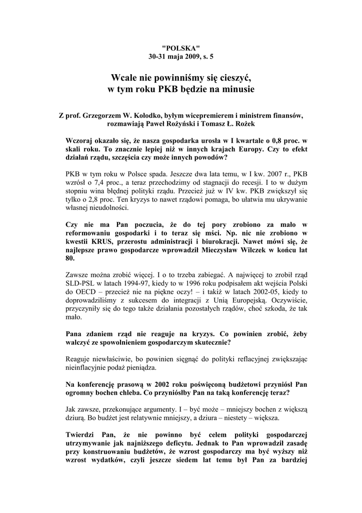 "POLSKA" 30-31 maja 2009, s. 5 Wcale nie powinniśmy się cieszyć, w tym roku PKB będzie na minusie Z prof. Grzegorzem W. Kołodko, byłym wicepremierem i ministrem finansów, rozmawiają Paweł RoŜyński i Tomasz Ł. RoŜek Wczoraj okazało się, Ŝe nasza gospodarka urosła w I kwartale o 0,8 proc. w skali roku. To znacznie lepiej niŜ w innych krajach Europy. Czy to efekt działań rządu, szczęścia czy moŜe innych powodów? PKB w tym roku w Polsce spada. Jeszcze dwa lata temu, w I kw. 2007 r., PKB wzrósł o 7,4 proc., a teraz przechodzimy od stagnacji do recesji. I to w duŜym stopniu wina błędnej polityki rządu. PrzecieŜ juŜ w IV kw. PKB zwiększył się tylko o 2,8 proc. Ten kryzys to nawet rządowi pomaga, bo ułatwia mu ukrywanie własnej nieudolności. Czy nie ma Pan poczucia, Ŝe do tej pory zrobiono za mało w reformowaniu gospodarki i to teraz się mści. Np. nic nie zrobiono w kwestii KRUS, przerostu administracji i biurokracji. Nawet mówi się, Ŝe najlepsze prawo gospodarcze wprowadził Mieczysław Wilczek w końcu lat 80. Zawsze moŜna zrobić więcej. I o to trzeba zabiegać. A najwięcej to zrobił rząd SLD-PSL w latach 1994-97, kiedy to w 1996 roku podpisałem akt wejścia Polski do OECD – przecieŜ nie na piękne oczy! – i takiŜ w latach 2002-05, kiedy to doprowadziliśmy z sukcesem do integracji z Unią Europejską. Oczywiście, przyczyniły się do tego takŜe działania pozostałych rządów, choć szkoda, Ŝe tak mało. Pana zdaniem rząd nie reaguje na kryzys. Co powinien zrobić, Ŝeby walczyć ze spowolnieniem gospodarczym skutecznie? Reaguje niewłaściwie, bo powinien sięgnąć do polityki reflacyjnej zwiększając nieinflacyjnie podaŜ pieniądza. Na konferencję prasową w 2002 roku poświęconą budŜetowi przyniósł Pan ogromny bochen chleba. Co przyniósłby Pan na taką konferencję teraz? Jak zawsze, przekonujące argumenty. I – być moŜe – mniejszy bochen z większą dziurą. Bo budŜet jest relatywnie mniejszy, a dziura – niestety – większa. Twierdzi Pan, Ŝe nie powinno być celem polityki gospodarczej utrzymywanie jak najniŜszego deficytu. Jednak to Pan wprowadził zasadę przy konstruowaniu budŜetów, Ŝe wzrost gospodarczy ma być wyŜszy niŜ wzrost wydatków, czyli jeszcze siedem lat temu był Pan za bardziej restrykcyjną polityką gospodarczą. Czy zmienił Pan poglądy, czy sytuacja się zmieniła? BudŜet i jego deficyt oraz sposób finansowania to instrumenty polityki gospodarczej, a nie jej cele. A sytuacja obecnie jest zaiste inna. Wtedy bowiem produkcja rosła coraz szybciej, a ceny coraz wolniej. Teraz jest odwrotnie. Prezydent proponuje obniŜkę VAT. Czy to moŜe pomóc budŜetowi gospodarce, czy raczej zaszkodzi? i Nie tędy droga. To jeszcze bardziej obniŜyłoby dochody budŜetu, co byłoby fatalnym błędem. Dochody moŜna zmniejszać, ale tylko wtedy gdy wcześniej potrafi się ograniczyć wydatki. W innym wypadku musi to prowadzić to szkodliwego i bezproduktywnego narastania deficytowi. Gdyby Prezydent był Premierem, z pewnością nie zgłaszałby takiego nieracjonalnego postulatu… A moŜe do ratowania budŜetu wykorzystać 20 mld dol. z linii kredytowej MFW, wprowadzić 50-proc. podatek dla najbogatszych, jak chce doradca prezydenta Ryszard Bugaj, uszczelnić system przyznawania rent i zreformować podatki? ZadłuŜać się w MFW nie trzeba. Są granice zewnętrznego uzaleŜniania się. Niech te 20 miliardów spokojnie tam leŜy i robi dobre wraŜenie. Poprawiać system zawsze warto, zwłaszcza jeśli daje to dodatkowe wpływy bez podnoszenia podatków. A do konieczności przywrócenia trzeciego progu podatkowego moŜe dojść, ale wtedy to juŜ nie ten rząd będzie to niepopularne rozwiązanie wprowadzał. Kryzys jest okazją, by oczyścić się z niepotrzebnych, rozdmuchanych wydatków i marnotrawstwa. MoŜe nagle się okaŜe, Ŝe oszczędności są moŜliwe, bo przez lata w resortach pieniądze przeciekały przez palce. Miejmy nadzieję. Ale kryzys to takŜe sposobność do kolejnych nacisków, roszczeń, pretensji. Trzeba uwaŜać. Trudna sztuka polityki finansów publicznych w tych warunkach polega na tym, Ŝe trzeba zarówno więcej oszczędzać – ale nie ciąć na siłę tu i tam! – jak i więcej w niektórych sferach – takŜe na trafnie zaadresowaną osłonę socjalną – wydawać. W szczególności zaś więcej naleŜy wydawać tam, gdzie daje to efekty mnoŜnikowe w sferze zatrudnienia i uruchamiania krajowej produkcji. W takiej sytuacji nie naleŜy oszczędzać na nakładach publicznych na infrastrukturę, a wręcz odwrotnie. Gdzie Pan by szukał oszczędności? W resorcie obrony narodowej, gdyŜ im mniej idzie na tego rodzaju aktywność, tym lepiej. Jak zawsze, w sferze źle adresowanych – powtórzymy: nietrafionych – transferów socjalnych. I, co oczywiste, w administracji. Tu chyba nie pozostaje nic innego jak na wiele lat zamrozić nominalnie nakłady, co wymusi dostosowanie. Dlaczego Ŝaden z rządów nie decydował się na tworzenie poduszki 2 powietrznej na gorsze czasy i nie wypracował nadwyŜki budŜetowej. Dotyczy to rządu, w którym był Pan wicepremierem, podczas prosperity w połowie lat 90. Prosperity, do której doprowadziła "Strategia dla Polski" w latach 1994-97, kiedy to wskutek dobrej koordynacji polityki makroekonomicznej i reform strukturalnych PKB na mieszkańca skoczył realnie aŜ o 28 proc., wykorzystałem do radykalnego obniŜenia długu publicznego oraz do zasadniczego zmniejszenia podatków. Przesądzono obniŜenie CIT wpierw z 40 do 32 proc. (a później, w ramach "Programu Naprawy Finansów Rzeczypospolitej" z 28 proc., do których zredukował go rząd Premiera Buzka, do zaledwie 19 proc., gdy ponownie koordynowałem politykę ekonomiczną w latach 2002-03), zlikwidowany został podatek importowy, obniŜyłem PIT z 45, 33 i 21 do odpowiednio 40, 30 i 19 proc., obcięta została akcyza. I temu wszystkiemu towarzyszył spadek deficytu b
