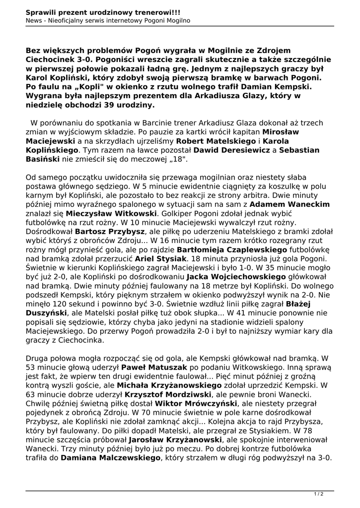 Sprawili prezent urodzinowy trenerowi!!! News - Nieoficjalny serwis internetowy Pogoni Mogilno Bez większych problemów Pogoń wygrała w Mogilnie ze Zdrojem Ciechocinek 3-0. Pogoniści wreszcie zagrali skutecznie a także szczególnie w pierwszej połowie pokazali ładną grę. Jednym z najlepszych graczy był Karol Kopliński, który zdobył swoją pierwszą bramkę w barwach Pogoni. Po faulu na „Kopli" w okienko z rzutu wolnego trafił Damian Kempski. Wygrana była najlepszym prezentem dla Arkadiusza Glazy, który w niedzielę obchodzi 39 urodziny. W porównaniu do spotkania w Barcinie trener Arkadiusz Glaza dokonał aż trzech zmian w wyjściowym składzie. Po pauzie za kartki wrócił kapitan Mirosław Maciejewski a na skrzydłach ujrzeliśmy Robert Matelskiego i Karola Koplińskiego. Tym razem na ławce pozostał Dawid Deresiewicz a Sebastian Basiński nie zmieścił się do meczowej „18". Od samego początku uwidoczniła się przewaga mogilnian oraz niestety słaba postawa głównego sędziego. W 5 minucie ewidentnie ciągnięty za koszulkę w polu karnym był Kopliński, ale pozostało to bez reakcji ze strony arbitra. Dwie minuty później mimo wyraźnego spalonego w sytuacji sam na sam z Adamem Waneckim znalazł się Mieczysław Witkowski. Golkiper Pogoni zdołał jednak wybić futbolówkę na rzut rożny. W 10 minucie Maciejewski wywalczył rzut rożny. Dośrodkował Bartosz Przybysz, ale piłkę po uderzeniu Matelskiego z bramki zdołał wybić któryś z obrońców Zdroju... W 16 minucie tym razem krótko rozegrany rzut rożny mógł przynieść gola, ale po rajdzie Bartłomieja Czaplewskiego futbolówkę nad bramką zdołał przerzucić Ariel Stysiak. 18 minuta przyniosła już gola Pogoni. Świetnie w kierunki Koplińskiego zagrał Maciejewski i było 1-0. W 35 minucie mogło być już 2-0, ale Kopliński po dośrodkowaniu Jacka Wojciechowskiego główkował nad bramką. Dwie minuty później faulowany na 18 metrze był Kopliński. Do wolnego podszedł Kempski, który pięknym strzałem w okienko podwyższył wynik na 2-0. Nie minęło 120 sekund i powinno być 3-0. Świetnie wzdłuż linii piłkę zagrał Błażej Duszyński, ale Matelski posłał piłkę tuż obok słupka... W 41 minucie ponownie nie popisali się sędziowie, którzy chyba jako jedyni na stadionie widzieli spalony Maciejewskiego. Do przerwy Pogoń prowadziła 2-0 i był to najniższy wymiar kary dla graczy z Ciechocinka. Druga połowa mogła rozpocząć się od gola, ale Kempski główkował nad bramką. W 53 minucie głową uderzył Paweł Matuszak po podaniu Witkowskiego. Inną sprawą jest fakt, że wpierw ten drugi ewidentnie faulował... Pięć minut później z groźną kontrą wyszli goście, ale Michała Krzyżanowskiego zdołał uprzedzić Kempski. W 63 minucie dobrze uderzył Krzysztof Mordziwski, ale pewnie broni Wanecki. Chwilę później świetną piłkę dostał Wiktor Mrówczyński, ale niestety przegrał pojedynek z obrońcą Zdroju. W 70 minucie świetnie w pole karne dośrodkował Przybysz, ale Kopliński nie zdołał zamknąć akcji... Kolejna akcja to rajd Przybysza, który był faulowany. Do piłki dopadł Matelski, ale przegrał ze Stysiakiem. W 78 minucie szczęścia próbował Jarosław Krzyżanowski, ale spokojnie interweniował Wanecki. Trzy minuty później było już po meczu. Po dobrej kontrze futbolówka trafiła do Damiana Malczewskiego, który strzałem w długi róg podwyższył na 3-0. 1/2 Sprawili prezent urodzinowy trenerowi!!! News - Nieoficjalny serwis internetowy Pogoni Mogilno W 87 minucie szczęście dopisało pogonistom. Piłkę z linii bramkowej wybił Przybysz a głową za linię końcową wyekspediował ją Kempski. W 89 minucie czerwony kartonik za brutalny faul na Maciejewskim ujrzał Michał Krzyżanowski a chwilę później za dyskusję swoją drugą żółtą dostał Witkowski. Już w doliczonym czasie goście powinni stracić czwartego gola, ale Malczewski mając trzech nieobstawionych kolegów z drużyny nie potrafił dokładnie podać... Pogoń zasłużenie wygrała 3-0 i wreszcie swoją przewagę udokumentowała golami. Trzy punkty wprowadzą trochę spokoju w Mogilnie, bowiem „prezentów" dla rywali jak z Flisakiem czy Dębem było już za dużo. W tabeli trzeba gonić rywali, bowiem wbrew pozorom liga jest dość wyrównana. Najbliższa okazja w Lubaniu z LTP, gdzie trzeba będzie przysłowiowo gryźć trawę by wywieźć jakiekolwiek punkty. Jeśli Pogoń do swojej gry dołączy skuteczność, to będziemy mogli cieszyć się ze zwycięstw. Pogoń Mogilno - Zdrój Ciechocinek 3-0 (2-0) gole: 18' Kopliński, 37' Kempski (wolny), 81' Malczewski Pogoń: Wanecki, Duszyński, Arent, Kempski żk, Przybysz, Kopliński (70' Deresiewicz), Maciejewski, Malczewski żk, Matelski (77' Konopiński), Czaplewski (63' Mrówczyński), Wojciechowski (70' Szutkowski) Zdrój: Stysiak, Wojnowski, Mordziwski, Niedziałek, Kraska, J. Krzyżanowski, Witkowski 2 x żk, M. Krzyżanowski, Majchrzak, Łuczyński, Matuszak Autor: Rado 2/2 Powered by TCPDF (www.tcpdf.org)