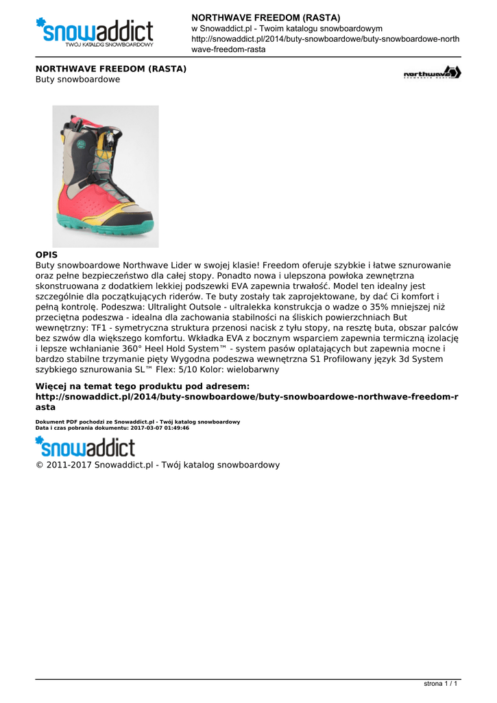 NORTHWAVE FREEDOM (RASTA) w Snowaddict.pl - Twoim katalogu snowboardowym http://snowaddict.pl/2014/buty-snowboardowe/buty-snowboardowe-north wave-freedom-rasta NORTHWAVE FREEDOM (RASTA) Buty snowboardowe OPIS Buty snowboardowe Northwave Lider w swojej klasie! Freedom oferuje szybkie i łatwe sznurowanie oraz pełne bezpieczeństwo dla całej stopy. Ponadto nowa i ulepszona powłoka zewnętrzna skonstruowana z dodatkiem lekkiej podszewki EVA zapewnia trwałość. Model ten idealny jest szczególnie dla początkujących riderów. Te buty zostały tak zaprojektowane, by dać Ci komfort i pełną kontrolę. Podeszwa: Ultralight Outsole - ultralekka konstrukcja o wadze o 35% mniejszej niż przeciętna podeszwa - idealna dla zachowania stabilności na śliskich powierzchniach But wewnętrzny: TF1 - symetryczna struktura przenosi nacisk z tyłu stopy, na resztę buta, obszar palców bez szwów dla większego komfortu. Wkładka EVA z bocznym wsparciem zapewnia termiczną izolację i lepsze wchłanianie 360° Heel Hold System™ - system pasów oplatających but zapewnia mocne i bardzo stabilne trzymanie pięty Wygodna podeszwa wewnętrzna S1 Profilowany język 3d System szybkiego sznurowania SL™ Flex: 5/10 Kolor: wielobarwny Więcej na temat tego produktu pod adresem: http://snowaddict.pl/2014/buty-snowboardowe/buty-snowboardowe-northwave-freedom-r asta Dokument PDF pochodzi ze Snowaddict.pl - Twój katalog snowboardowy Data i czas pobrania dokumentu: 2017-03-07 01:49:46 © 2011-2017 Snowaddict.pl - Twój katalog snowboardowy strona 1 / 1 Powered by TCPDF (www.tcpdf.org)