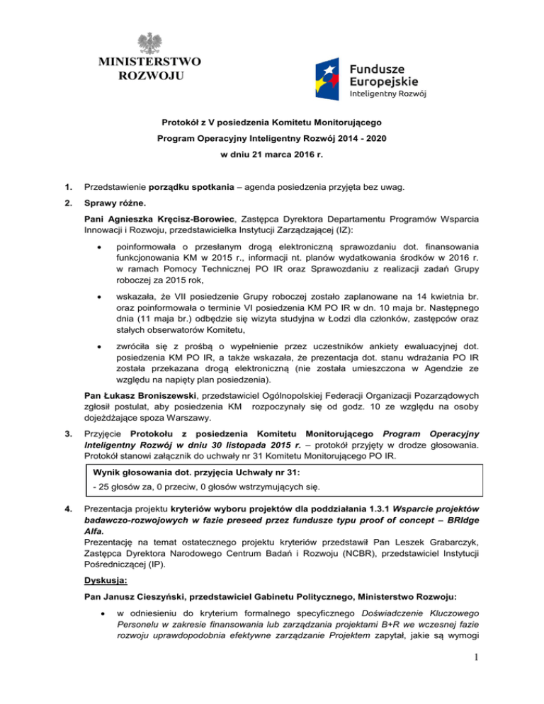 MINISTERSTWO ROZWOJU Protokół z V posiedzenia Komitetu Monitorującego Program Operacyjny Inteligentny Rozwój 2014 - 2020 w dniu 21 marca 2016 r. 1. Przedstawienie porządku spotkania – agenda posiedzenia przyjęta bez uwag. 2. Sprawy różne. Pani Agnieszka Kręcisz-Borowiec, Zastępca Dyrektora Departamentu Programów Wsparcia Innowacji i Rozwoju, przedstawicielka Instytucji Zarządzającej (IZ): poinformowała o przesłanym drogą elektroniczną sprawozdaniu dot. finansowania funkcjonowania KM w 2015 r., informacji nt. planów wydatkowania środków w 2016 r. w ramach Pomocy Technicznej PO IR oraz Sprawozdaniu z realizacji zadań Grupy roboczej za 2015 rok, wskazała, że VII posiedzenie Grupy roboczej zostało zaplanowane na 14 kwietnia br. oraz poinformowała o terminie VI posiedzenia KM PO IR w dn. 10 maja br. Następnego dnia (11 maja br.) odbędzie się wizyta studyjna w Łodzi dla członków, zastępców oraz stałych obserwatorów Komitetu, zwróciła się z prośbą o wypełnienie przez uczestników ankiety ewaluacyjnej dot. posiedzenia KM PO IR, a także wskazała, że prezentacja dot. stanu wdrażania PO IR została przekazana drogą elektroniczną (nie została umieszczona w Agendzie ze względu na napięty plan posiedzenia). Pan Łukasz Broniszewski, przedstawiciel Ogólnopolskiej Federacji Organizacji Pozarządowych zgłosił postulat, aby posiedzenia KM rozpoczynały się od godz. 10 ze względu na osoby dojeżdżające spoza Warszawy. 3. Przyjęcie Protokołu z posiedzenia Komitetu Monitorującego Program Operacyjny Inteligentny Rozwój w dniu 30 listopada 2015 r. – protokół przyjęty w drodze głosowania. Protokół stanowi załącznik do uchwały nr 31 Komitetu Monitorującego PO IR. Uchwała nr 40 Komitetu POnr IG31: w sprawie przyjęcia Protokołu z posiedzenia Wynik głosowania dot. Monitorującego przyjęcia Uchwały - 25 głosów za, 0 przeciw, 0 głosów wstrzymujących się. 4. Prezentacja projektu kryteriów wyboru projektów dla poddziałania 1.3.1 Wsparcie projektów badawczo-rozwojowych w fazie preseed przez fundusze typu proof of concept – BRIdge Alfa. Prezentację na temat ostatecznego projektu kryteriów przedstawił Pan Leszek Grabarczyk, Zastępca Dyrektora Narodowego Centrum Badań i Rozwoju (NCBR), przedstawiciel Instytucji Pośredniczącej (IP). Dyskusja: Pan Janusz Cieszyński, przedstawiciel Gabinetu Politycznego, Ministerstwo Rozwoju: w odniesieniu do kryterium formalnego specyficznego Doświadczenie Kluczowego Personelu w zakresie finansowania lub zarządzania projektami B+R we wczesnej fazie rozwoju uprawdopodobnia efektywne zarządzanie Projektem zapytał, jakie są wymogi 1 względem osób, które mogą zostać uznane za Zarządzających. Zwrócił uwagę, że sformułowanie „prowadzenie spraw oraz reprezentacja danego podmiotu” ogranicza zakres osób spełniających kryterium do członków zarządu i wyklucza menedżerów inwestycyjnych, zgłosił postulat, aby ww. kryterium przenieść do kryteriów merytorycznych, zadał pytanie, skąd wynika okres 3 lat, w czasie którego przedstawiciele Kluczowego Personelu zarządzali funduszami typu seed bądź venture capital, zapytał, czy kryterium formalne Doświadczenie Kluczowego Personelu w zakresie finansowania lub zarządzania projektami B+R we wczesnej fazie rozwoju dopuszcza jedynie aniołów biznesu, którzy inwestowali we własnym imieniu, czy również tych, którzy inwestowali za pośrednictwem kontrolowanego przez siebie podmiotu. Pan Łukasz Dyba, przedstawiciel Konfederacji Lewiatan: zgłosił postulat, aby w kryterium formalnym specyficznym Strategia Inwestycyjna Wnioskodawcy zakłada finansowanie projektów B+R wpisujących się w Krajowe Inteligentne Specjalizacje (KIS) uzupełnić, że finansowane będą projekty B+R zgodne z KIS w wersji obowiązującej, wskazanej w dokumentacji konkursowej oraz w wersjach późniejszych, zwrócił uwagę na konieczność poprawienia punktacji w kryterium oceny merytorycznej Proponowana Strategia Inwestycyjna z „0 pkt – 5 pkt” na „0 pkt – 3 pkt”. Pan Włodzimierz Hausner, przedstawiciel Krajowej Izby Gospodarczej: zapytał, ile środków zostało przeznaczonych na poddziałanie 1.3.1. Pan Ryszard Pregiel, przedstawiciel Polskiej Izby Gospodarczej Zaawansowanych Technologii: odnośnie kryterium formalnego Wnioskowana kwota wsparcia jest zgodna z zasadami finansowania projektów obowiązującymi dla poddziałania, zapytał ile wynosi budżet inwestycyjny w poddziałaniu, wskazał, że w przypadku, gdy minimalna wartość projektu wynosi 10 mln PLN przy wymaganym wkładzie prywatnym min. 20% na poziomie Budżetu Operacyjnego, kryterium łącznie z wkładem NCBR nie pokrywa kosztów projektu o wartości minimalnej, w odniesieniu do treści kryterium formalnego specyficznego Doświadczenie Kluczowego Personelu w zakresie finansowania lub zarządzania projektami B+R we wczesnej fazie rozwoju uprawdopodobnia efektywne zarządzanie Projektem zapytał, co oznacza wyrażenie „wnioskodawca powinien posiadać zespół specjalistów”. Poprosił o doprecyzowanie, czy te osoby powinny być zatrudnione na umowę o pracę, umowę zlecenie, czy też wystarczy wiążąca deklaracja, że wnioskodawca będzie posiadał zespół specjalistów, zapytał, w jaki sposób będzie kontrolowane, czy dany specjalista jest zatrudniany 30 h tygodniowo, zadał pytanie, jaki jest maksymalny wkład NCBR na poziomie budżetu inwestycyjnego. Pan Michał Pietras, przedstawiciel Fundacji na rzecz Nauki Polskiej: zapytał, czy możliwy do dofinansowania byłby projekt tylko z komponentem inwestycyjnym, bez komponentu operacyjnego, zadał pytanie, czy proporcja: wkład prywatny - wkład publiczny jest ruchoma i może wynosić np. 50 na 50 oraz czy kryteria przewidują ten sposób docenienia zaangażowania wkładu prywatnego. 2 Pani Magdalena Szymańska, Niepełnosprawnych: przedstawicielka Pełnomocnika Rządu ds. Osób zgłosiła postulat, aby w ramach d