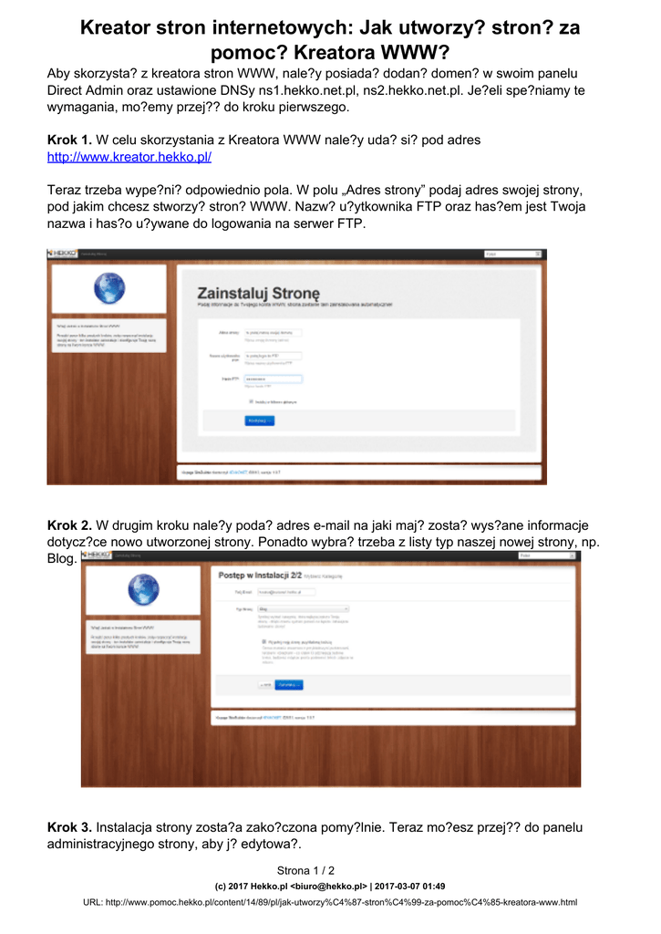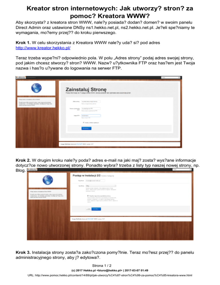 Kreator stron internetowych: Jak utworzy? stron? za pomoc? Kreatora WWW? Aby skorzysta? z kreatora stron WWW, nale?y posiada? dodan? domen? w swoim panelu Direct Admin oraz ustawione DNSy ns1.hekko.net.pl, ns2.hekko.net.pl. Je?eli spe?niamy te wymagania, mo?emy przej?? do kroku pierwszego. Krok 1. W celu skorzystania z Kreatora WWW nale?y uda? si? pod adres http://www.kreator.hekko.pl/ Teraz trzeba wype?ni? odpowiednio pola. W polu „Adres strony” podaj adres swojej strony, pod jakim chcesz stworzy? stron? WWW. Nazw? u?ytkownika FTP oraz has?em jest Twoja nazwa i has?o u?ywane do logowania na serwer FTP. Krok 2. W drugim kroku nale?y poda? adres e-mail na jaki maj? zosta? wys?ane informacje dotycz?ce nowo utworzonej strony. Ponadto wybra? trzeba z listy typ naszej nowej strony, np. Blog. Krok 3. Instalacja strony zosta?a zako?czona pomy?lnie. Teraz mo?esz przej?? do panelu administracyjnego strony, aby j? edytowa?. Strona 1 / 2 (c) 2017 Hekko.pl <[email protected]> | 2017-03-07 01:49 URL: http://www.pomoc.hekko.pl/content/14/89/pl/jak-utworzy%C4%87-stron%C4%99-za-pomoc%C4%85-kreatora-www.html Kreator stron internetowych: Jak utworzy? stron? za pomoc? Kreatora WWW? Krok 4. Po przej?ciu do panelu zarz?dzania stron? nale?y ustawi? login oraz has?o dzi?ki którym b?dziesz móg? logowa? si?, aby edytowa? swoj? stron? www. Unikalny ID rozwi?zania: #1088 Autor: : Hekko.pl Zaktualizowano: 2013-11-23 23:35 Strona 2 / 2 (c) 2017 Hekko.pl <[email protected]> | 2017-03-07 01:49 URL: http://www.pomoc.hekko.pl/content/14/89/pl/jak-utworzy%C4%87-stron%C4%99-za-pomoc%C4%85-kreatora-www.html Powered by TCPDF (www.tcpdf.org)