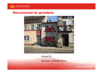 Nieruchomość do sprzedania Gostyń 52 Szczecin, czerwiec 2014 r. Przedmiot sprzedaży: Prawo własności lokalu użytkowego nr 2 o powierzchni użytkowej 42,78 m2, usytuowanego na parterze budynku mieszkalno-usługowego, do którego przynależy usytuowane w budynku gospodarczym pomieszczenie gospodarcze wc o powierzchni użytkowej 0,81 m2, położonego miejscowości Gostyń nr 52, gmina Świerzno, powiat kamieński, województwo zachodniopomorskie. Z własnością lokalu związany jest udział wynoszący 1355/10000 części we współużytkowaniu wieczystym działki gruntu oznaczonej numerem 49/6 obszaru 961 m2 oraz w częściach wspólnych budynków i urządzeniach, które nie służą wyłącznie do użytku właściciela lokalu. Przewidywana cena wywoławcza: 30.000,00 zł Przewidywana data przetargu: grudzień 2014 r. Przedmiot sprzedaży: Miejscowość Gostyń, woj. zachodniopomorskie Gmina / Powiat Świerzno / kamieński Nr budynku i lokalu Gostyń 52, lokal nr 2 Powierzchnia użytkowa lokalu Lokal użytkowy o powierzchni użytkowej 42,78 m kw., usytuowany na parterze budynku mieszkalno-usługowego, do którego przynależy usytuowane w budynku gospodarczym pomieszczenie gospodarcze – wc o powierzchni użytkowej 0,81 m kw. Działka ewidencyjna Nr 49/6 z obrębu 0002, Gostyń o obszarze 961 m kw. Księga wieczysta Sąd Rejonowy w Świnoujściu IX Zamiejscowy Wydział Ksiąg Wieczystych z siedzibą w Kamieniu Pomorskim prowadzi dla lokalu księgę wieczystą KW Nr SZ1K / 00028860 / 3 Gostyń Grunt Teren sprzedawanej nieruchomości składa się z: • działki nr 49/6 oznaczonej w ewidencji gruntów B-RIIIa, kształt zbliżony do prostokąta. • Działka zabudowana budynkiem mieszkalno-usługowym, częściowo podpiwniczonym oraz trzema budynkami gospodarczym. • Teren działki nieogrodzony. • Nieruchomość uzbrojona jest w energię elektryczną, wodną, kanalizacyjną, gazową. • Konfiguracja terenu: teren płaski, wokół budynku utwardzony. • Działka zabudowana jest budynkiem o funkcji mieszkalno - usługowej, dwukondygnacyjnym, ze stromym dachem. Budynek wykonany w technologii tradycyjnej. • Stan techniczny budynku zadawalający. • Usytuowanie budynku zgodnie z wyrysem z mapy ewidencyjnej. Zespół budynków W tabeli zamieszczono zestawienie powierzchni obiektów znajdujących się na terenie nieruchomości. pow. zabudowy (m kw) Obiekt 1 Budynek mieszkalno- usługowy 72,0 2 Budynek gospodarczy 34,0 3 Budynek gospodarczy 7,0 4 Budynek gospodarczy 10,0 Razem: 123,0 Dostępność komunikacyjna • Nieruchomość zlokalizowana jest w centralnej części wsi przy głównej drodze wiejskiej. Odległość w prostej linii od Morza Bałtyckiego wynosi około 5 kilometrów. • Dojazd dogodny drogą utwardzoną asfaltową. • Najbliższe otoczenie nieruchomości to budynki zabudowy wielorodzinnej, a także typu siedliskowego, kościół, sklep i agencja pocztowa. i grunty rolne. • Odległość od siedziby gminy wynosi około 6 km. W dalszej odległości znajdują się zabudowa mieszkaniowa typu siedliskowego i grunty rolne. • Nieruchomość nie jest objęta aktualnym miejscowym planem zagospodarowania przestrzennego, natomiast w Studium uwarunkowań i kierunków zagospodarowania przestrzennego gminy Świerzno, uchwalonym Uchwałą Nr XIV/62/07 Rady Gminy Świerzno z dnia 10 grudnia 2007 r., działka leży na terenie „istniejącej zabudowy mieszkaniowej”. • Ze względu na charakter sąsiedztwa oraz bliskość tras komunikacyjnych, jest to dobra lokalizacja dla działalności o charakterze usługowym. Otoczenie nieruchomości Nieruchomość graniczy: • od strony północy - droga utwardzona, dalej kościół, zabudowa mieszkaniowa siedliskowa, agencja poczta, sklep, tereny rolne. • od strony wschodniej – zabudowa mieszkaniowa siedliskowa, dalej tereny rolne. • od strony południowej – tereny rolne. • od strony zachodniej – zabudowa mieszkaniowa wielorodzinna, dalej zabudowa mieszkaniowa siedliskowa. Dane kontaktowe Dane kontaktowe: Prowadzący przetarg: Poczta Polska S.A. Pion Infrastruktury 70 – 940 Szczecin Al. Niepodległości 41/42, pokój 309 Bliższe informacje o nieruchomości można uzyskać: pod numerem tel. 91 440 14 65 Zastrzeżenia Niniejsza broszura została sporządzona i udostępniona jedynie w celu ogólno informacyjnym i nie stanowi ze strony Poczty Polskiej S.A. oferty w rozumieniu prawa cywilnego, oświadczenia woli ani wiedzy, jak również jakiegokolwiek zapewnienia odnośnie nieruchomości, jej stanu lub poszczególnych treści objętych broszurą, wobec czego nabywca powinien na własną rękę przeprowadzić odpowiednie badania, zlecić dodatkowe ekspertyzy lub zaakceptować stan nieruchomości jako stan taki, w jakim nieruchomość znajduje się w dacie oględzin / sprzedaży.
