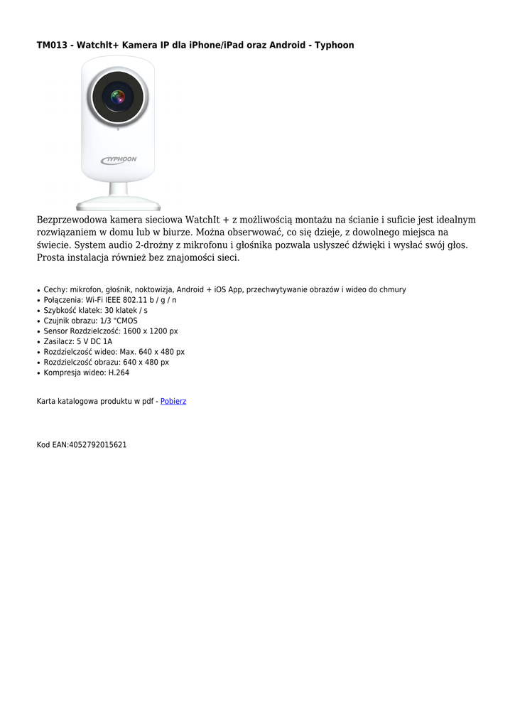 TM013 - Watchlt+ Kamera IP dla iPhone/iPad oraz Android - Typhoon Bezprzewodowa kamera sieciowa WatchIt + z możliwością montażu na ścianie i suficie jest idealnym rozwiązaniem w domu lub w biurze. Można obserwować, co się dzieje, z dowolnego miejsca na świecie. System audio 2-drożny z mikrofonu i głośnika pozwala usłyszeć dźwięki i wysłać swój głos. Prosta instalacja również bez znajomości sieci. ● ● ● ● ● ● ● ● ● Cechy: mikrofon, głośnik, noktowizja, Android + iOS App, przechwytywanie obrazów i wideo do chmury Połączenia: Wi-Fi IEEE 802.11 b / g / n Szybkość klatek: 30 klatek / s Czujnik obrazu: 1/3 "CMOS Sensor Rozdzielczość: 1600 x 1200 px Zasilacz: 5 V DC 1A Rozdzielczość wideo: Max. 640 x 480 px Rozdzielczość obrazu: 640 x 480 px Kompresja wideo: H.264 Karta katalogowa produktu w pdf - Pobierz Kod EAN:4052792015621