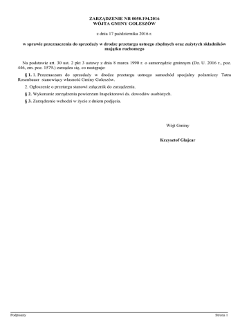 ZARZĄDZENIE NR 0050.194.2016 WÓJTA GMINY GOLESZÓW z dnia 17 października 2016 r. w sprawie przeznaczenia do sprzedaży w drodze przetargu ustnego zbędnych oraz zużytych składników majątku ruchomego Na podstawie art. 30 ust. 2 pkt 3 ustawy z dnia 8 marca 1990 r. o samorządzie gminnym (Dz. U. 2016 r., poz. 446, zm. poz. 1579.) zarządza się, co następuje: § 1. 1. Przeznaczam do sprzedaży w drodze przetargu ustnego samochód specjalny pożarniczy Tatra Rosenbauer stanowiący własność Gminy Goleszów. 2. Ogłoszenie o przetargu stanowi załącznik do zarządzenia. § 2. Wykonanie zarządzenia powierzam Inspektorowi ds. dowodów osobistych. § 3. Zarządzenie wchodzi w życie z dniem podjęcia. Wójt Gminy Krzysztof Glajcar Podpisany Strona 1 Załącznik do Zarządzenia Nr 0050.194.2016 Wójta Gminy Goleszów z dnia 17 października 2016 r. Ogłoszenie o przetargu Wójt Gminy Goleszów ogłasza przetarg ustny na sprzedaż samochodu specjalnego pożarniczego: Marka: Tatra Rosenbauer Model: 148 Nr rejestracyjny: SCI 22FY Typ nadwozia: gaśniczy Rok produkcji: 1979 Dopuszczalna ładowność: 8500 kg Maksymalna masa całkowita: 25000 kg Liczba osi: 3 Liczba miejsc: 3 Typ silnika: diesel Pojemność silnika: 11100, 00 cm3 Przetarg odbędzie się w dniu 7 listopada 2016 r. w sali posiedzeń Urzędu Gminy Goleszów ul. 1 Maja 5, I piętro pokój 17 o godzinie 10.00. Przedmiot sprzedaży można obejrzeć w Goleszowie ul. Szkolna 7 po uprzednim uzgodnieniu terminu pod nr telefonu 334790510 w.47. Cena wywoławcza wynosi: 21 500,00 zł. Warunkiem przystąpienia do przetargu jest wniesienie wadium w pieniądzu w wysokości 5% ceny wywoławczej tj. 1 075,00 zł do dnia 3 listopada 2016 r. Za dzień wpłaty wadium uważać się będzie dzień wpływu należności na rachunek bankowy Gminy w Banku Spółdzielczym w Cieszynie, o/Goleszów nr 25 8113 1020 2002 0000 0648 0039. Nabywca jest zobowiązany do dokonania wpłaty kwoty wylicytowanej w terminie 7 dni od dnia zawarcia umowy sprzedaży, niedotrzymanie tego terminu powoduje przepadek wadium, a przetarg czyni niebyłym. Organizatorowi przetargu przysługuje prawo unieważnienia lub zamknięcia przetargu bez wybrania którejkolwiek z ofert. Wójt Gminy Krzysztof Glajcar Podpisany Strona 1